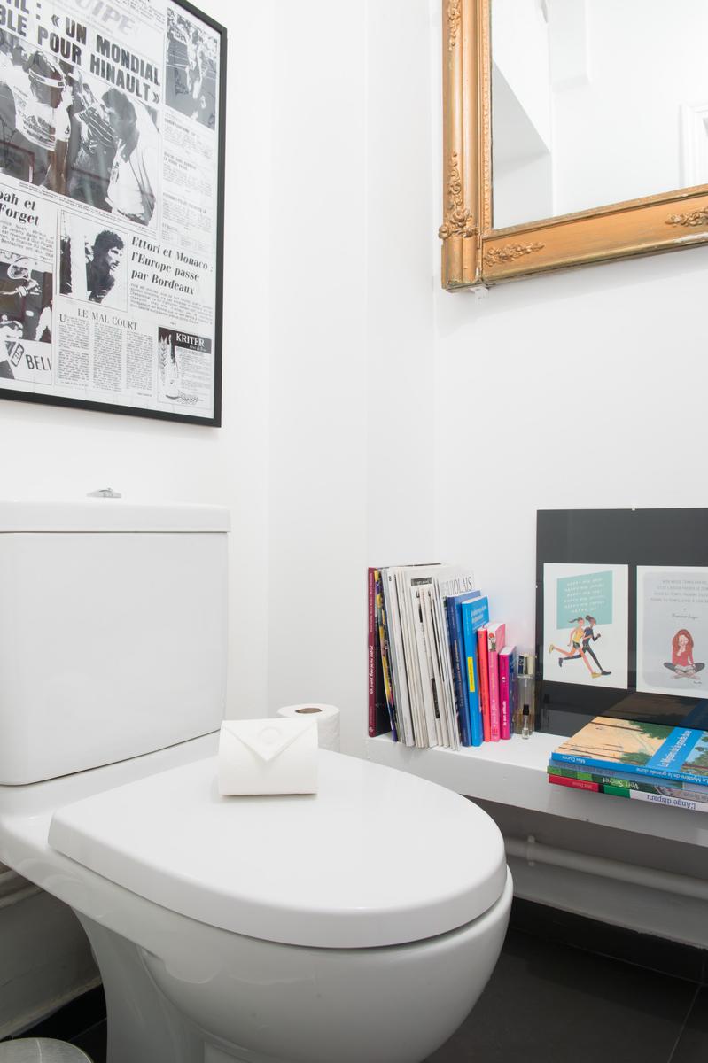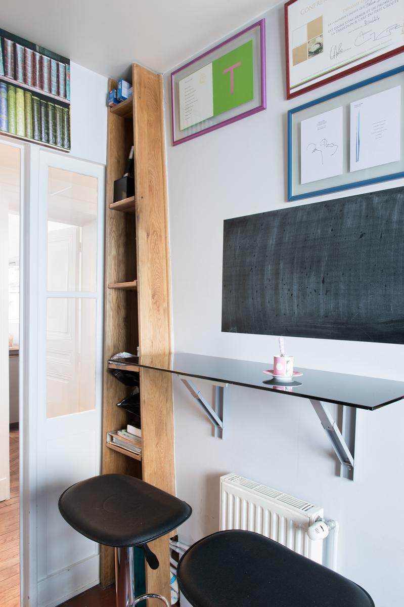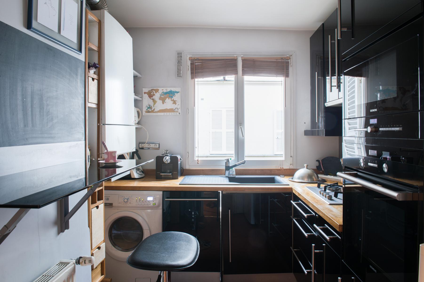 Cette maison est située à quatre étages au-dessus des restaurants et cafés excentriques de South Pigalle. La porte d’entrée s’ouvre sur un couloir, où se trouvent à droite le vestiaire soigné et la salle de bains principale, avec baignoire et douche en forêt tropicale. La salle de bains est reliée à la chambre double avec parquet (également accessible depuis la salle à manger). Puis, à gauche, vous voyez la cuisine monochrome – un espace élégant et pratique qui fait allusion aux tendances culinaires de vos hôtes. Ensuite se trouve la chambre à coucher principale, dont le caractère est donné par sa carte encadrée et ses étagères pleines.