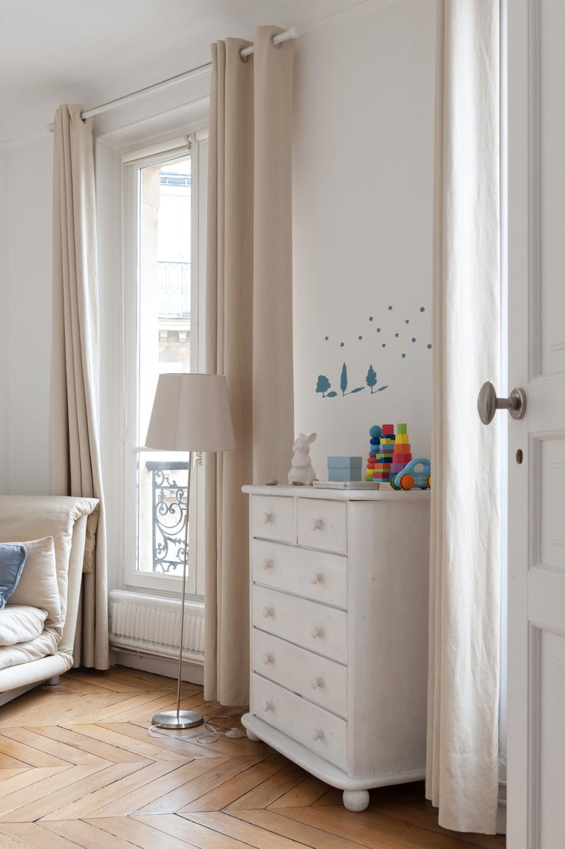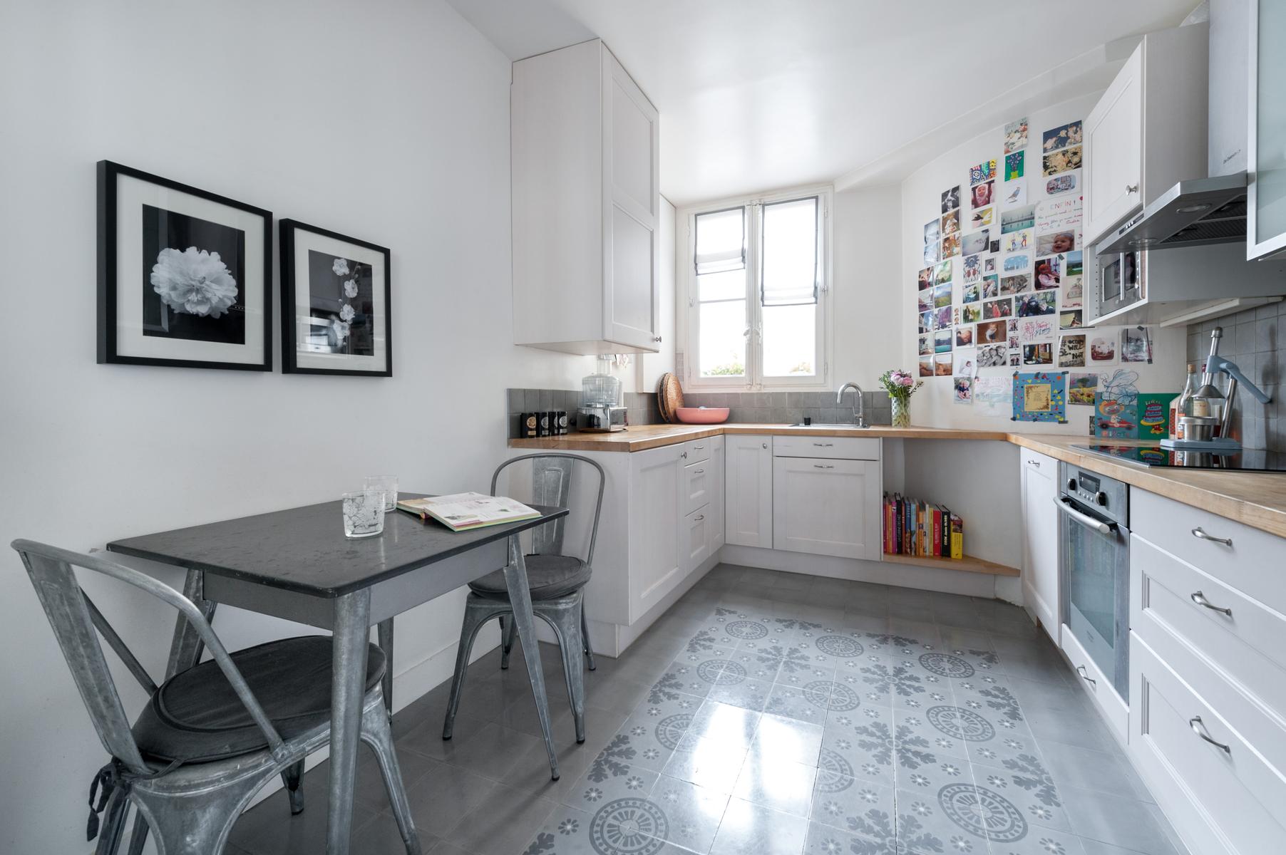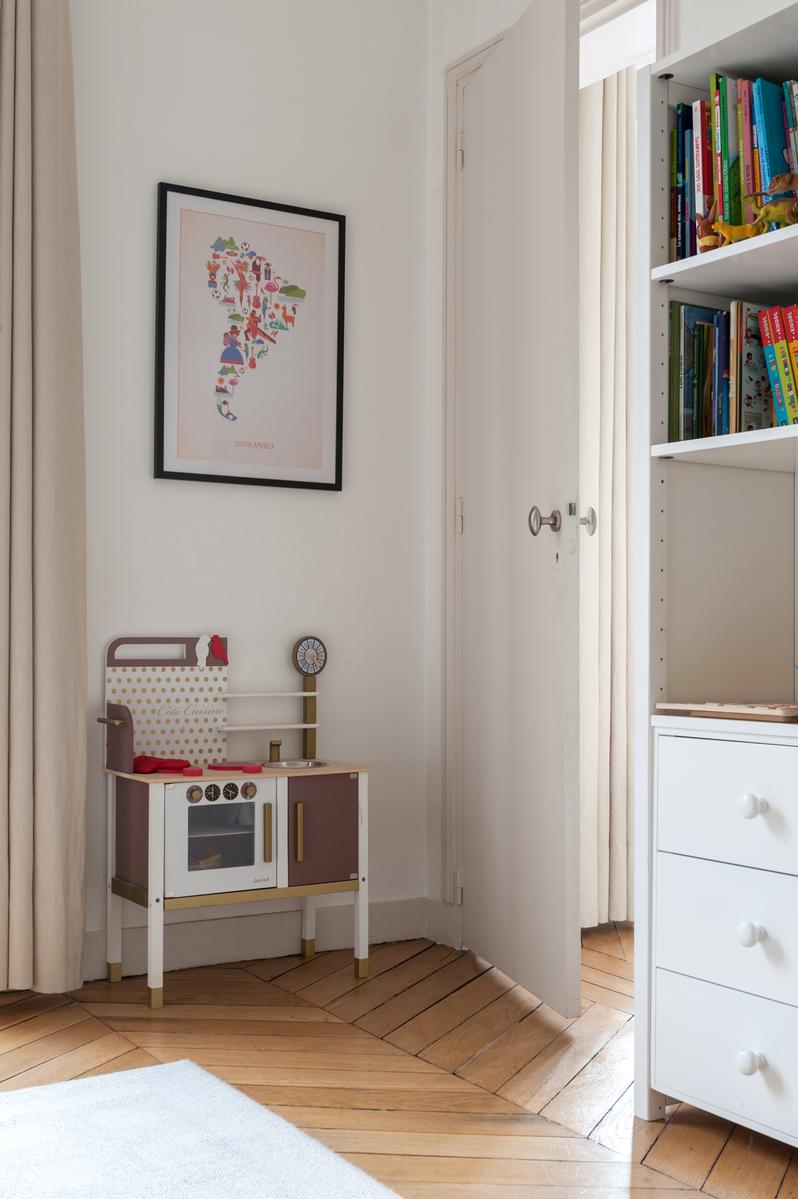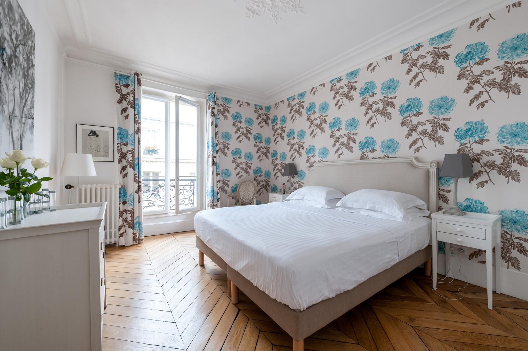 La rue des Moines II s’installe dans un bâtiment classique. A côté des parquets, des moulures élégantes et des fenêtres de balcon, vous trouverez un tapis imprimé de feuilles tourbillonnantes, du papier peint floral et des silhouettes d’arbres imprimées sur le mur de la pépinière. Dans le vaste salon, un lustre de cristal est suspendu au-dessus d’une table à manger gris ardoise, de jolis tableaux sont assis sur un foyer complexe, et une fenêtre intérieure donne sur la cuisine moderne. Essayez le fameux marché bio sur le boulevard des Batignolles, ou restez à la maison et cuisinez dans la grande cuisine