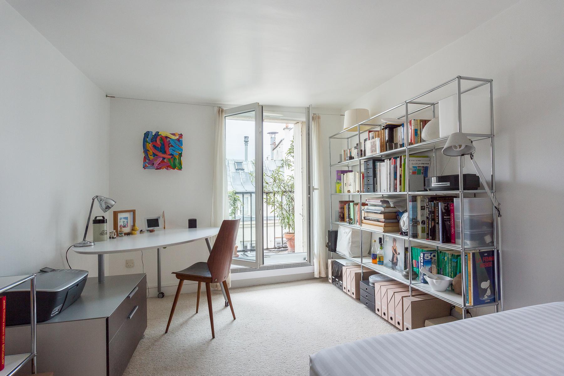 Aussi raffinée que cette partie appréciée de Paris, cette maison du cinquième étage vaut la peine d’être escaladée. La porte d’entrée donne sur un couloir qui mène d’abord à la chambre des maîtres. Peint en blanc et simplement meublé, il est rendu caractère par de nombreuses œuvres d’art et antiquités exotiques. Au-delà, il y a une salle de toilette et la salle de bain aux lignes pures et aux miroirs, et au bout du couloir, il y a la deuxième chambre à coucher. Aussi peint en blanc, il a un lit double, un bureau et un petit balcon.