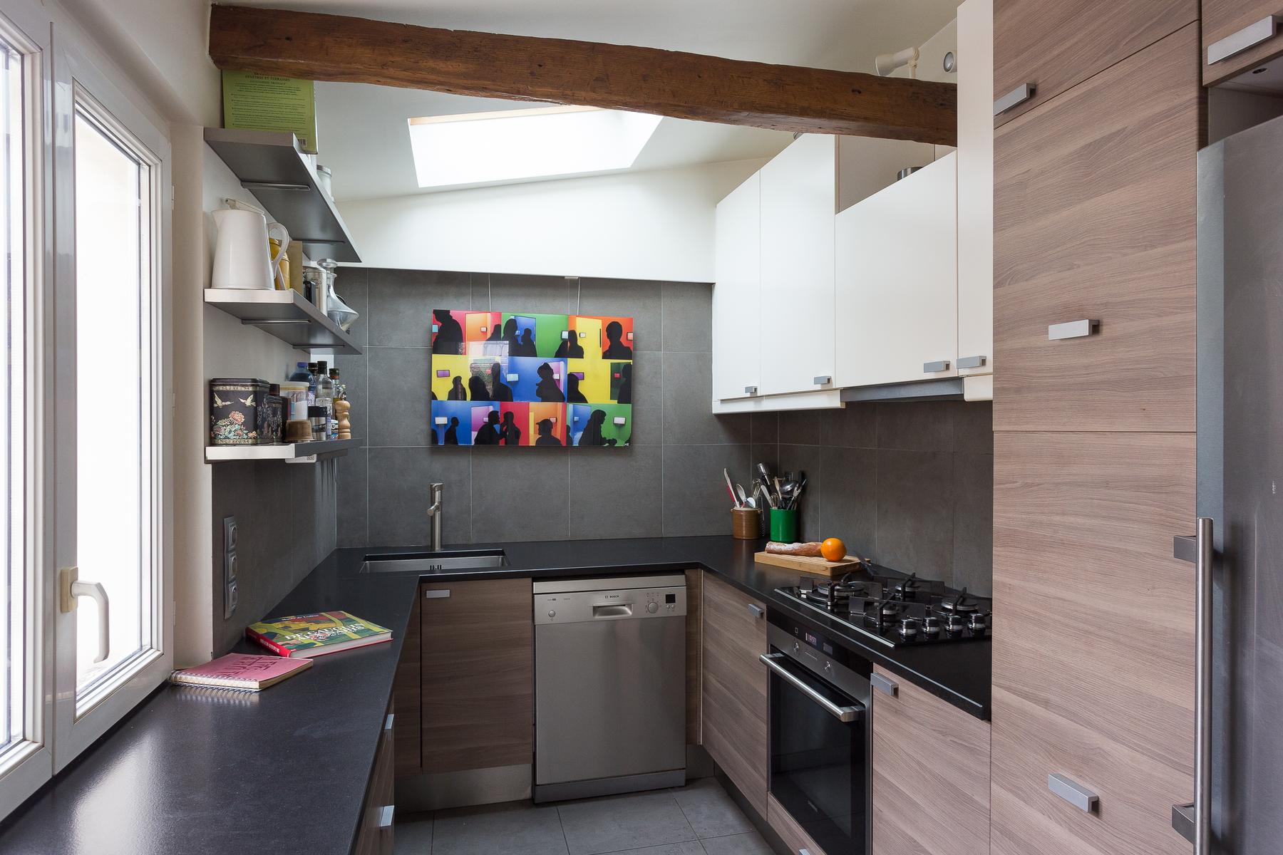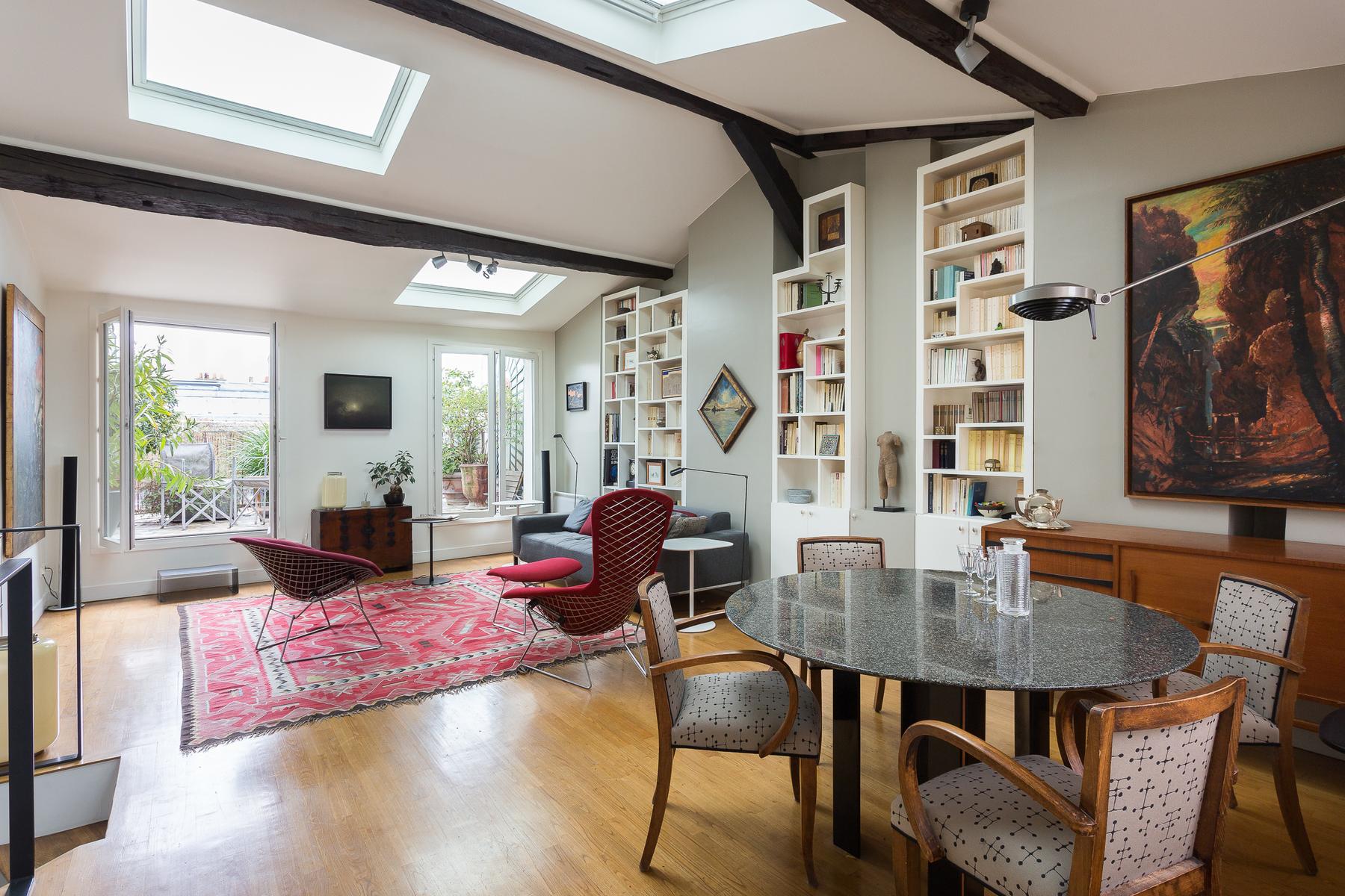 Un escalier vous mène au salon de la rue des Petits Carreaux, qui a des planchers de bois et des plafonds à poutres apparentes. A l’une des extrémités se trouve une table à manger en granit, juste après laquelle se trouve la cuisine. Et à l’autre, il y a un coin salon avec un canapé, deux fauteuils contemporains et beaucoup de beaux livres et d’œuvres d’art. De là, les fenêtres s’ouvrent sur un autre balcon.