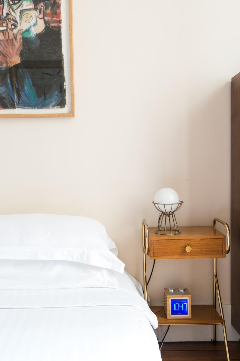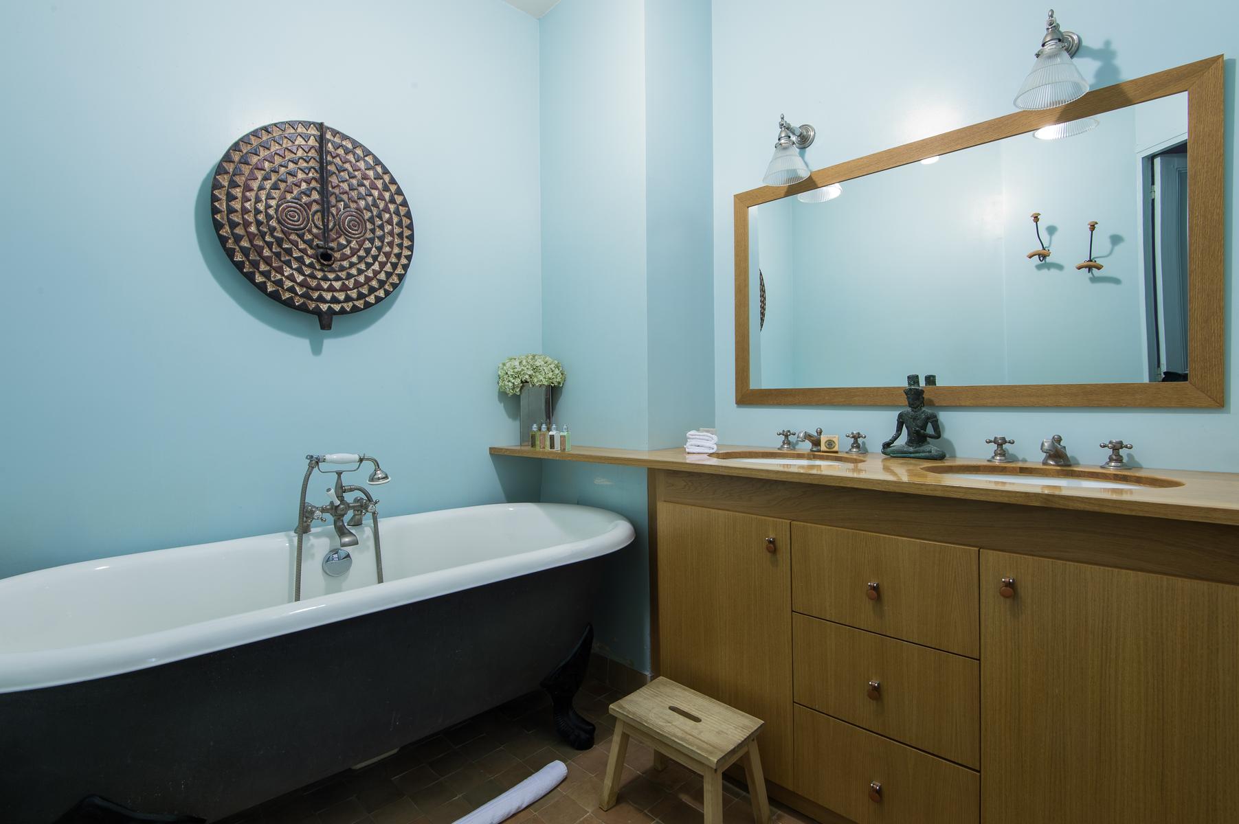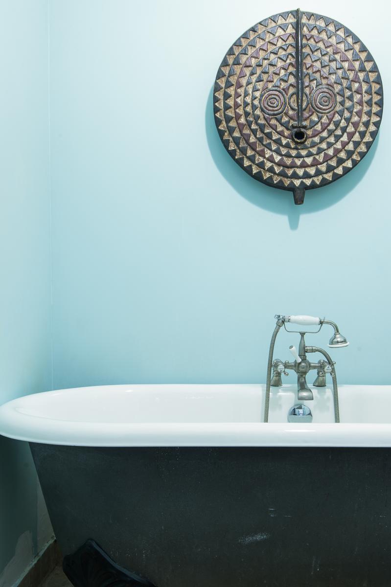 Au-delà, le couloir s’incurve vers la droite et mène d’abord à une salle de bain turquoise (avec baignoire à roulettes), puis à une salle de toilette. Un peu plus loin se trouve la chambre à coucher principale, où les meubles rétro entourent le grand lit. Plus loin, vous trouverez deux autres chambres à coucher de caractère – l’une avec deux lits simples en mezzanine, l’autre avec une seule.