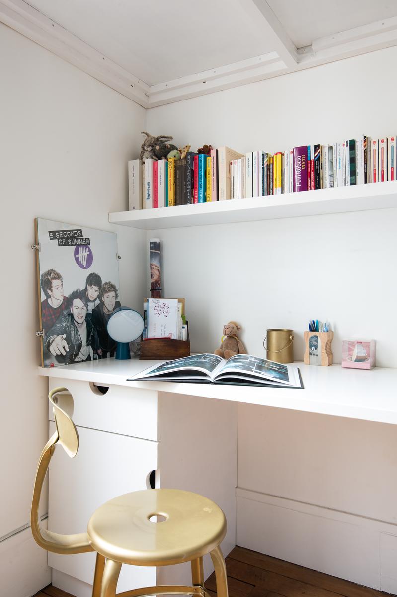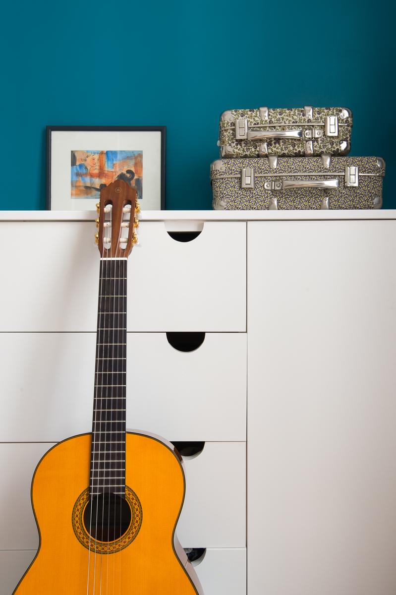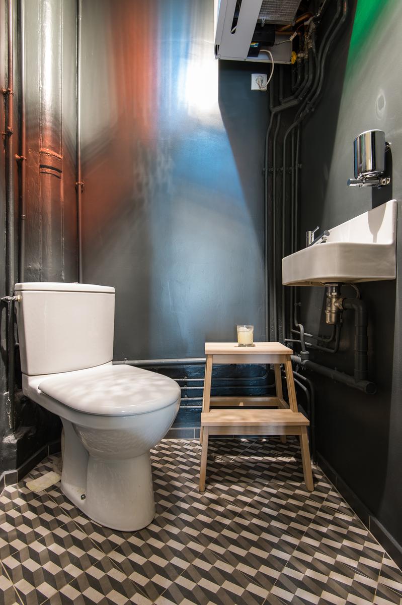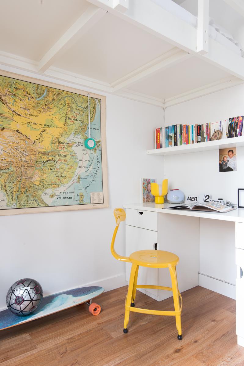 Au-delà, le couloir s’incurve vers la droite et mène d’abord à une salle de bain turquoise (avec baignoire à roulettes), puis à une salle de toilette. Un peu plus loin se trouve la chambre à coucher principale, où les meubles rétro entourent le grand lit. Plus loin, vous trouverez deux autres chambres à coucher de caractère – l’une avec deux lits simples en mezzanine, l’autre avec une seule.