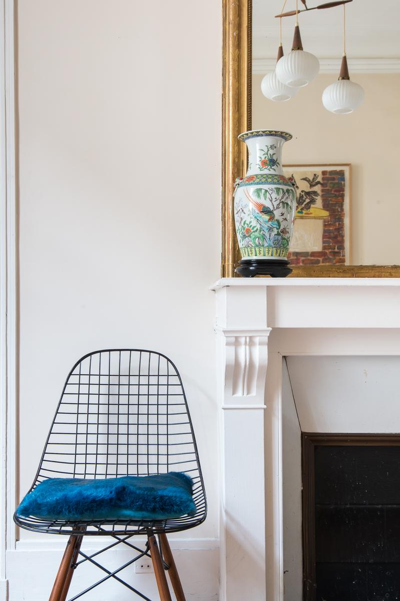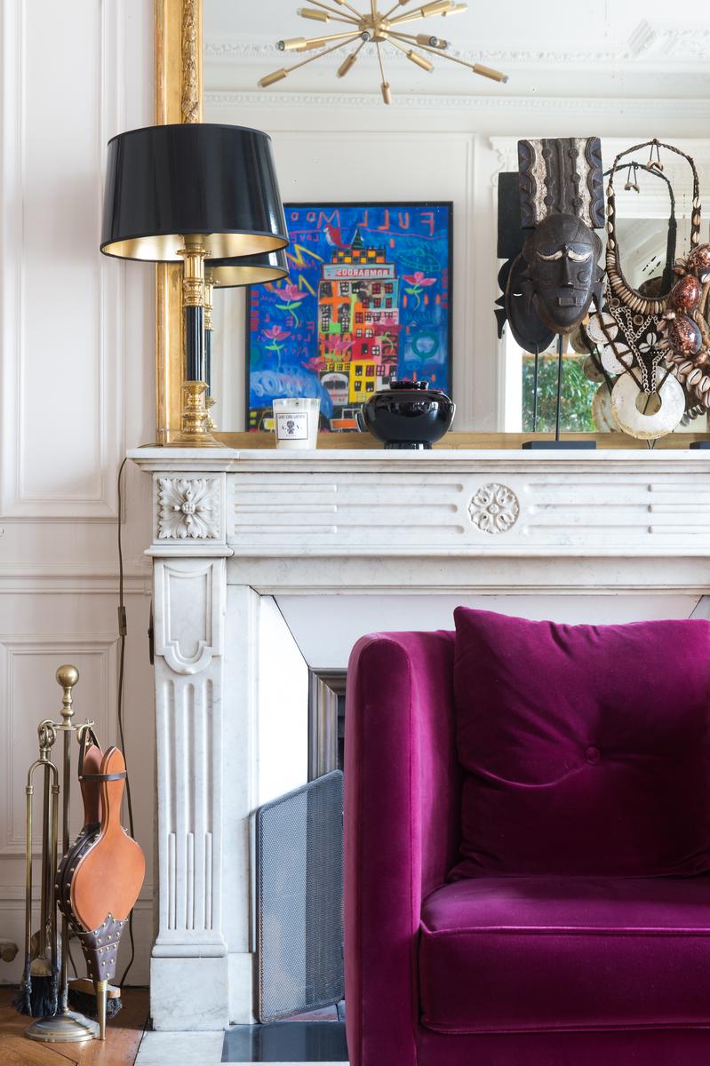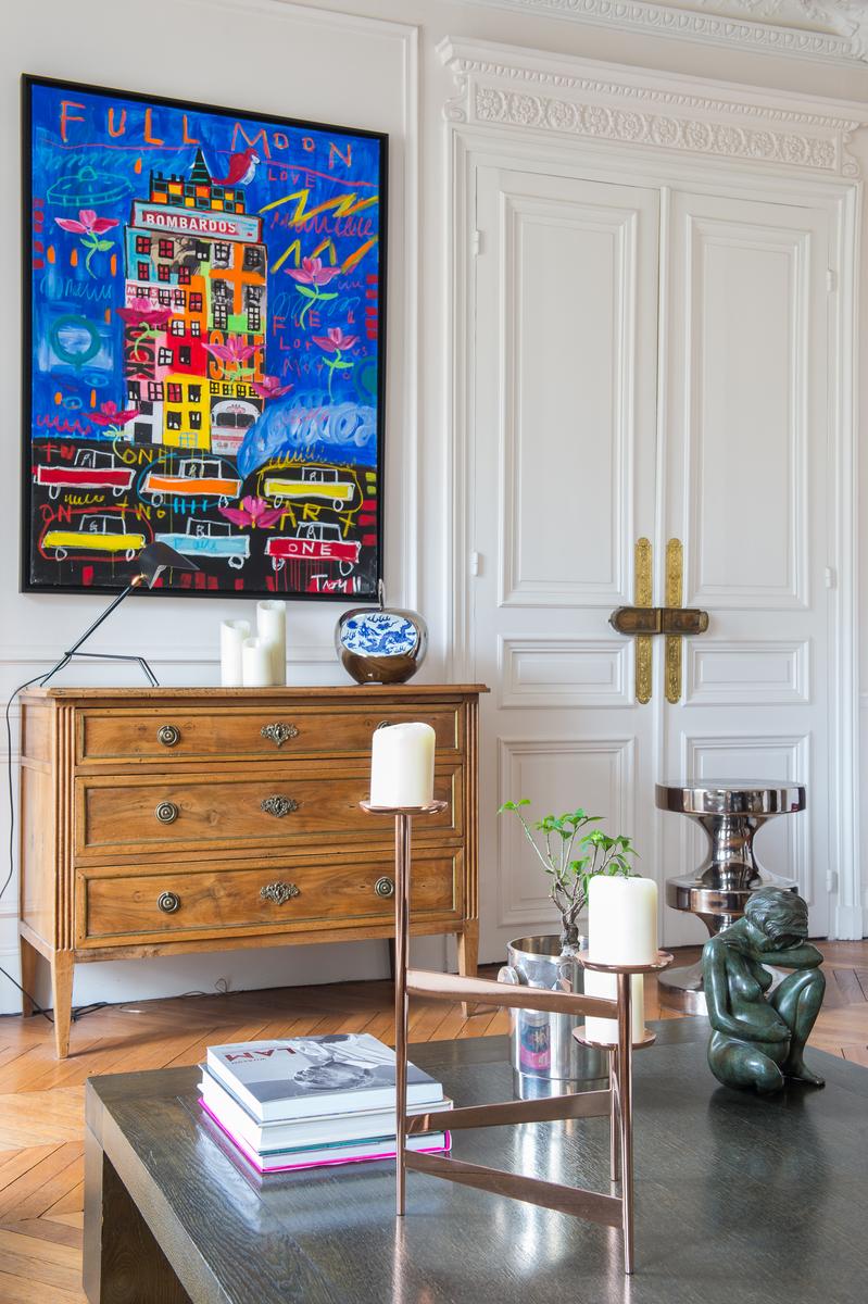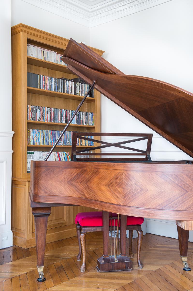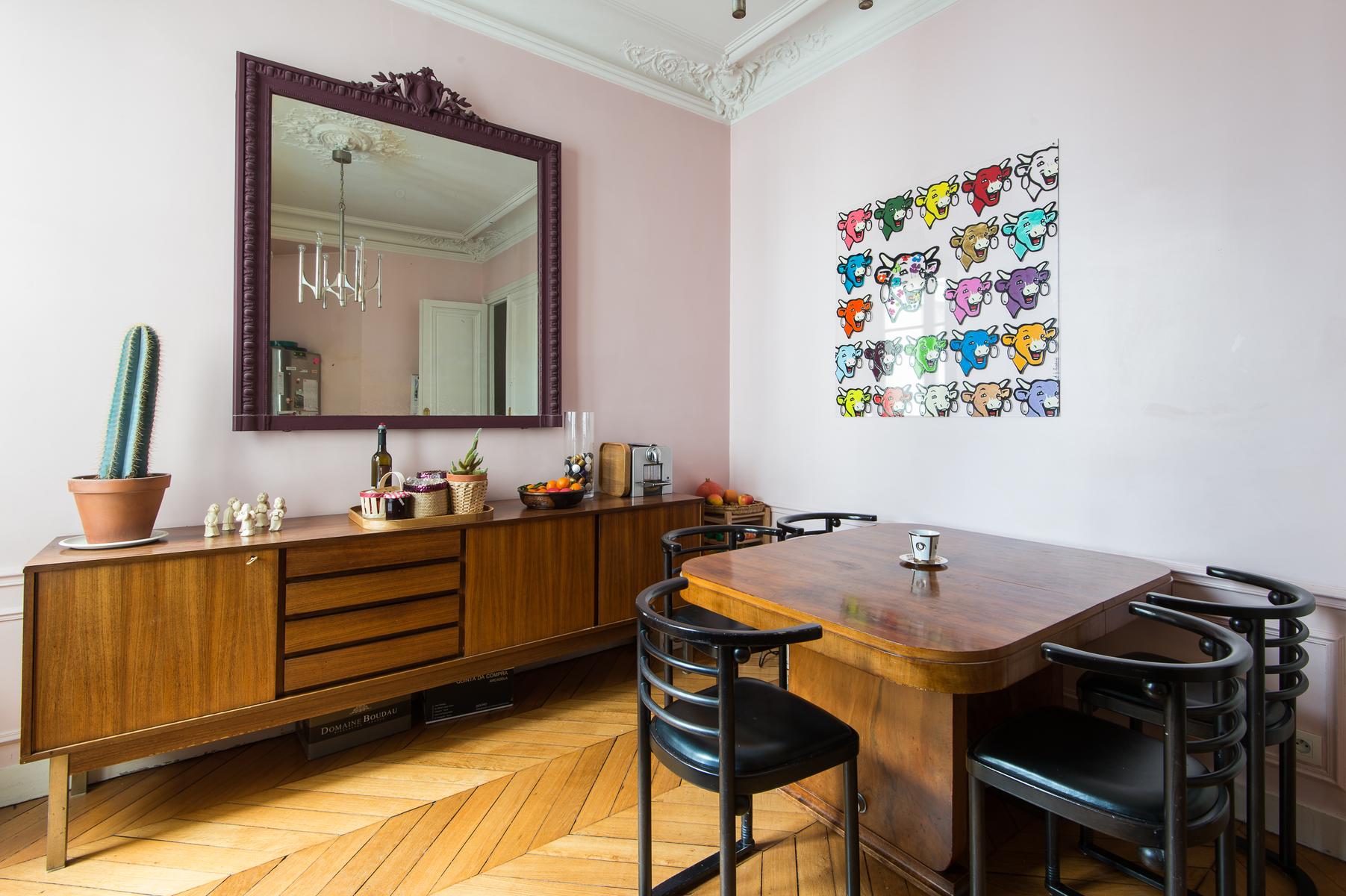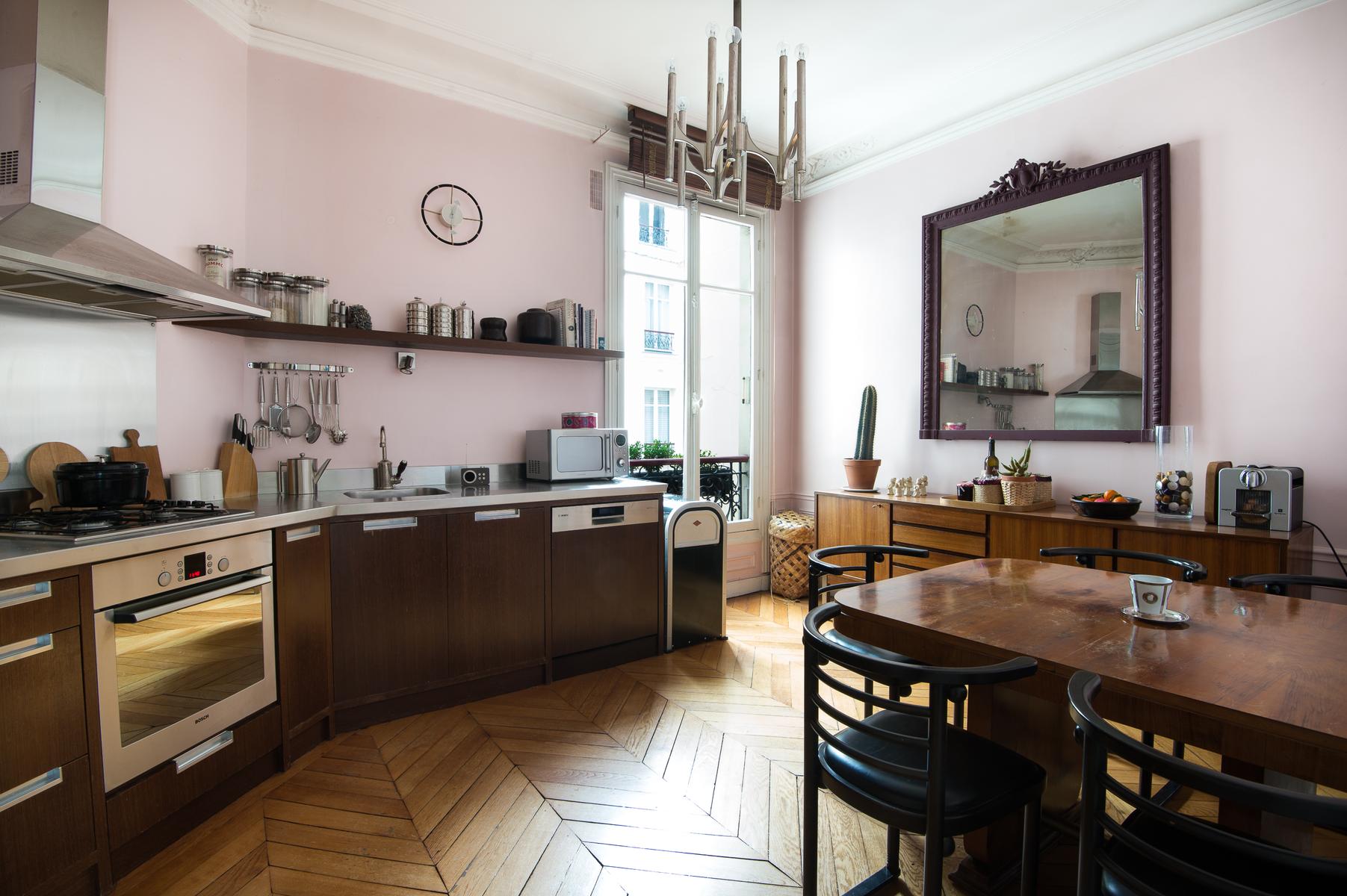 En entrant dans cette maison du troisième étage par l’escalier, vous arriverez d’abord dans un salon. De conception classique, il est doté d’un canapé et de fauteuils contemporains, d’une table basse aux lignes épurées et de nombreuses œuvres d’art et statuettes audacieuses. A côté, il y a un autre salon – cette fois tout à fait classique, il y a un portrait à cadre doré, des balcons Juliette en fer forgé et un piano à queue pour une pièce maîtresse. De l’autre côté du couloir, il y a la cuisine aux murs roses, avec des armoires en bois et une table de salle à manger assortie, le tout éclairé par un lustre contemporain.