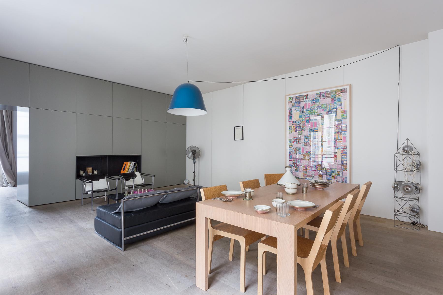 Des couleurs fraîches et des meubles encore plus frais – cette maison reflète certainement l’amour de l’hôte pour le style. Vous entrez dans un couloir qui mène directement au salon. D’un côté, il y a une salle à manger, à côté de laquelle sont accrochées deux œuvres d’art inhabituelles. Puis, de l’autre côté du plancher de bois blanchi, vous arriverez à un coin salon avec un canapé en cuir et chrome et une paire de fauteuils en cuir de vachette. Une porte d’entrée vous conduit à la cuisine – décorée en gris et blanc, avec des comptoirs en béton.