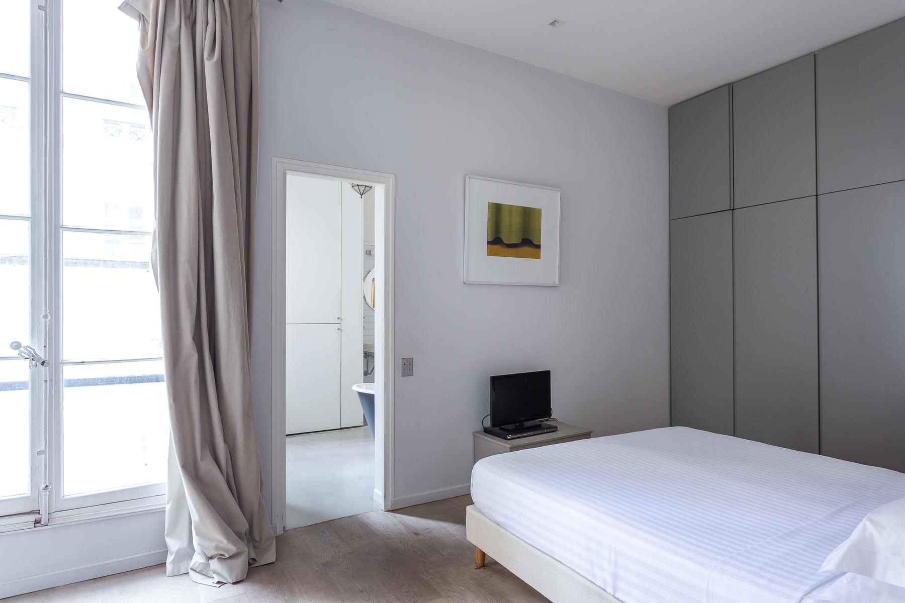 Ensuite, par une deuxième porte, se trouve la chambre principale. C’est un espace discret, avec un lit queen-size et une longue fenêtre bordée de rideaux argentés. La porte de gauche ouvre sur la deuxième chambre (bleu pâle, avec quelques accessoires ludiques et un petit lit double), tandis que celle de droite mène à une salle de bains attenante avec une belle baignoire à roulettes avec douche intégrée.