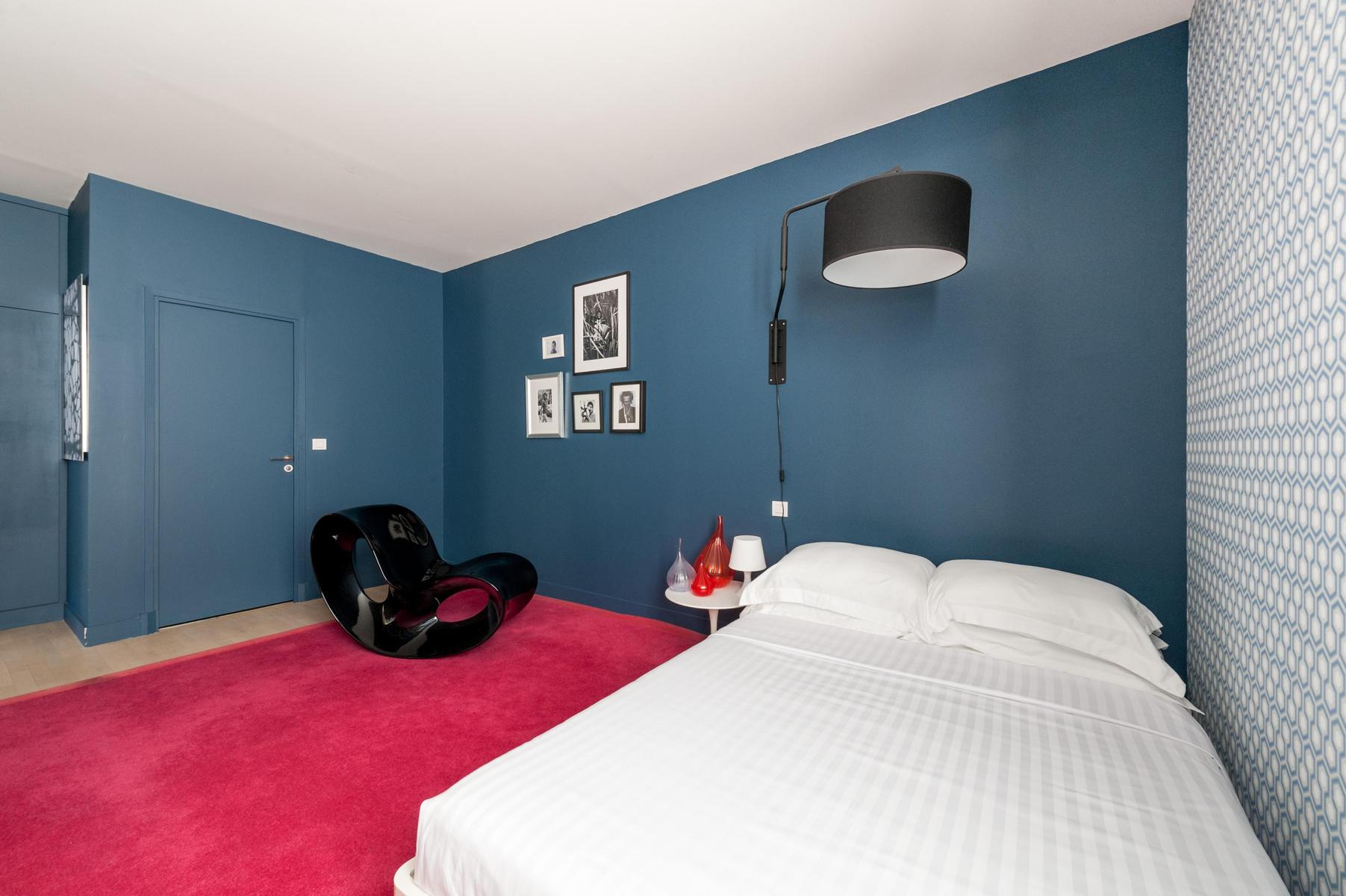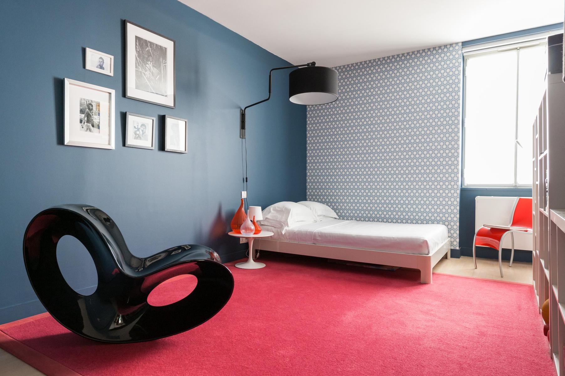 Saint-Germain-des-Prés is one of Paris’ most appealing areas – between galleries and boutiques there are hip new bars and eateries. It’s here that Rue du Cherche-Midi III makes its mark. Tessellating wallpapers and patterned rugs stand out through Perspex chairs, and towers of books are stacked high. In the sitting room, a silver floor lamp curves above the coffee table, and there’s a circular dining area just behind.