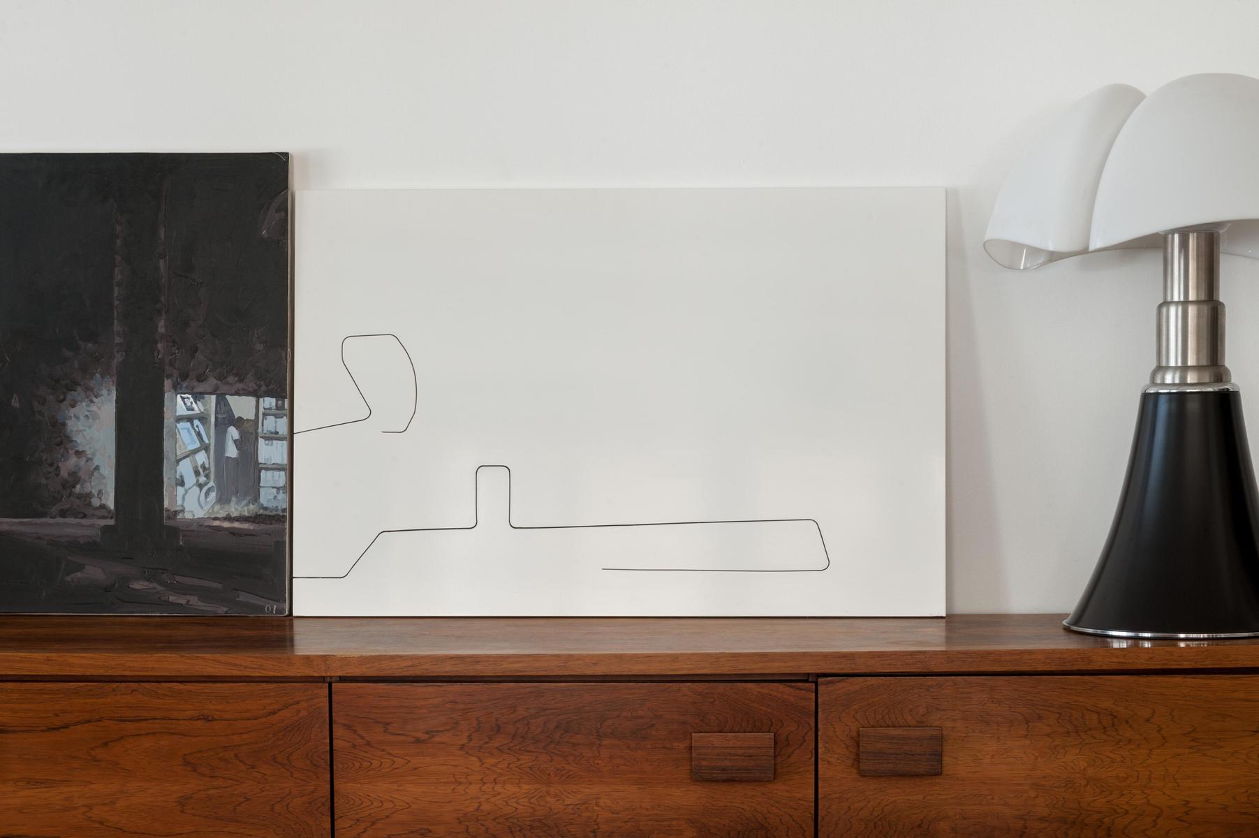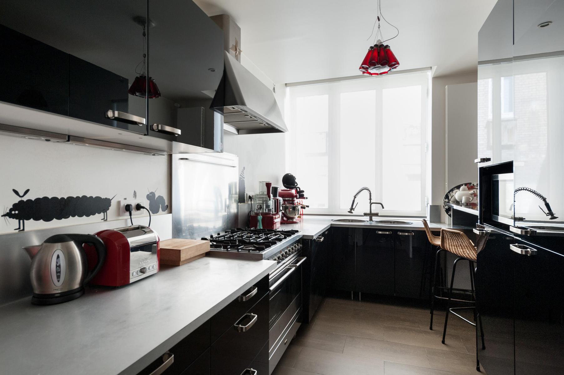 The blue master bedroom has several unusual animal ornaments, and between the twin sinks of one composed bathroom there’s a delicate Bonsai tree. The sitting room’s collection of stools is truly eclectic, hailing from around the world. But of all this home’s curiosities, the kitchen’s might be the most eye catching. The ceiling’s red bottle chandelier can’t be missed, and neither can the monochrome characters stencilled across each wall.