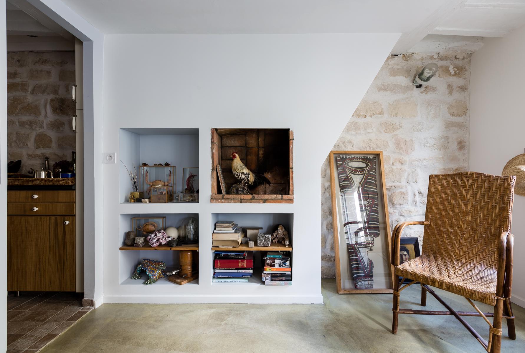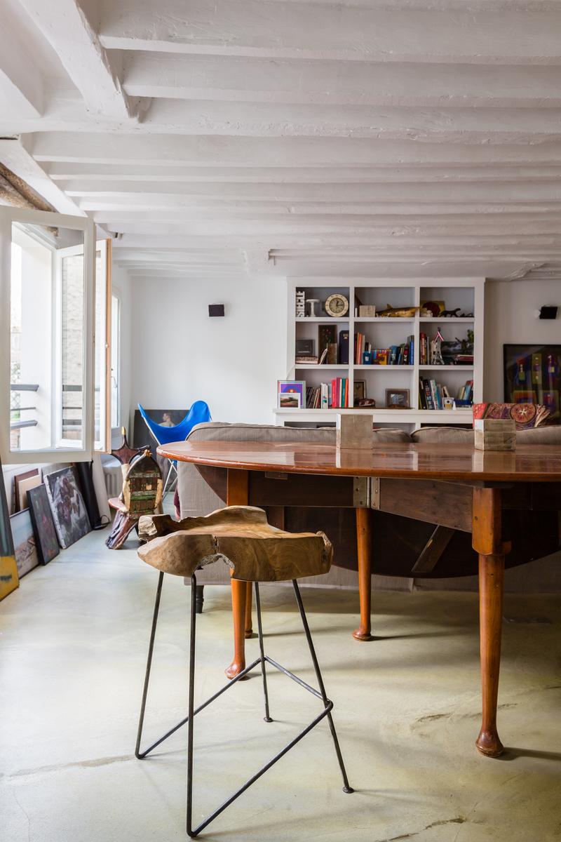 En plus d’être plein de détails originaux, le salon de caractère de cette maison est meublé de pièces mal assorties – certaines exotiques – et parsemées d’œuvres d’art colorées.