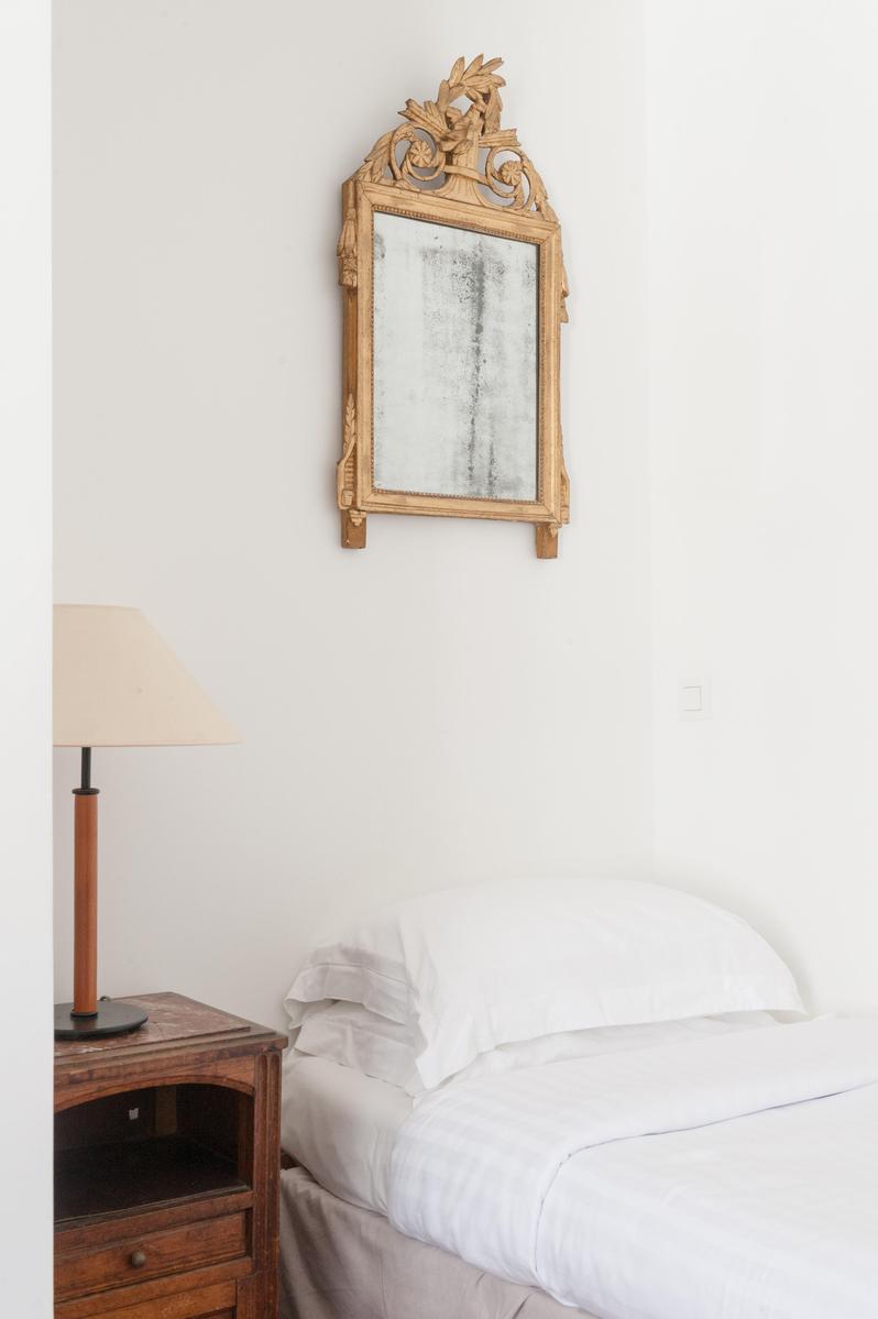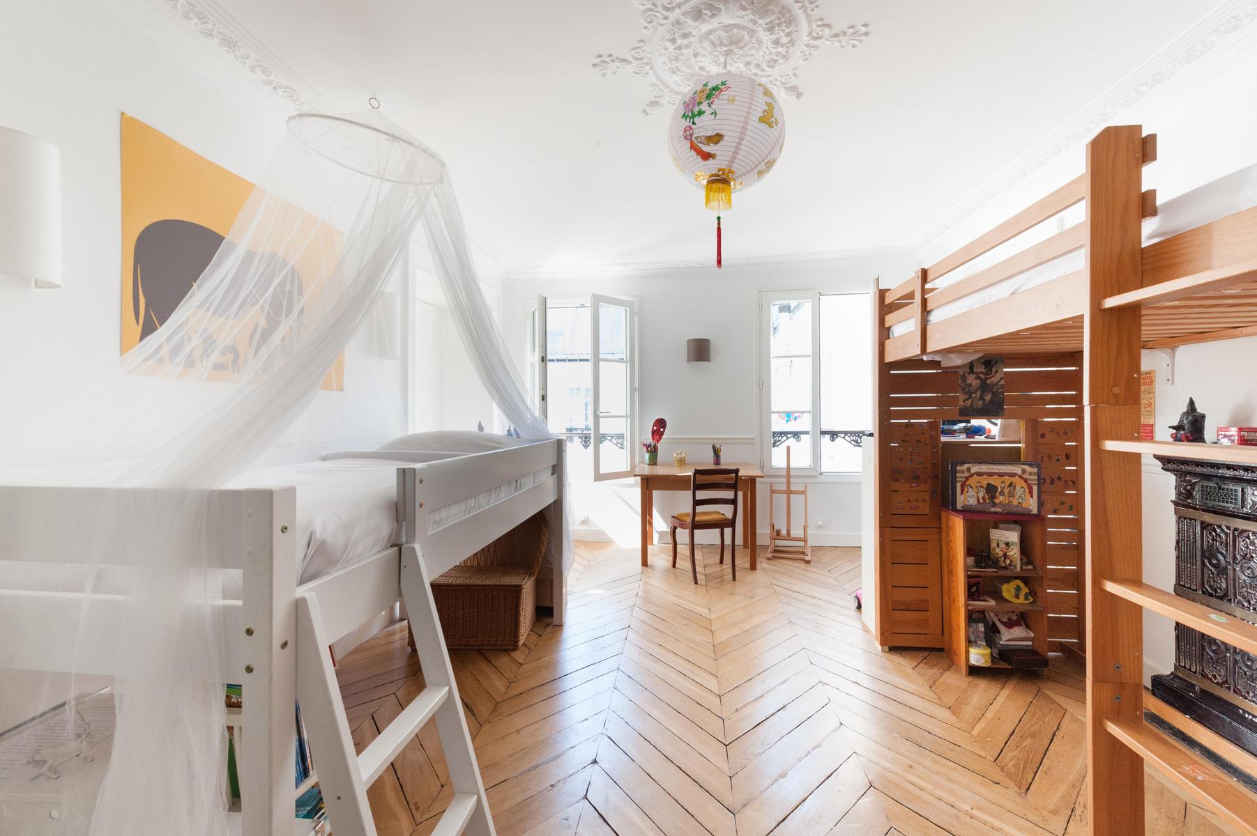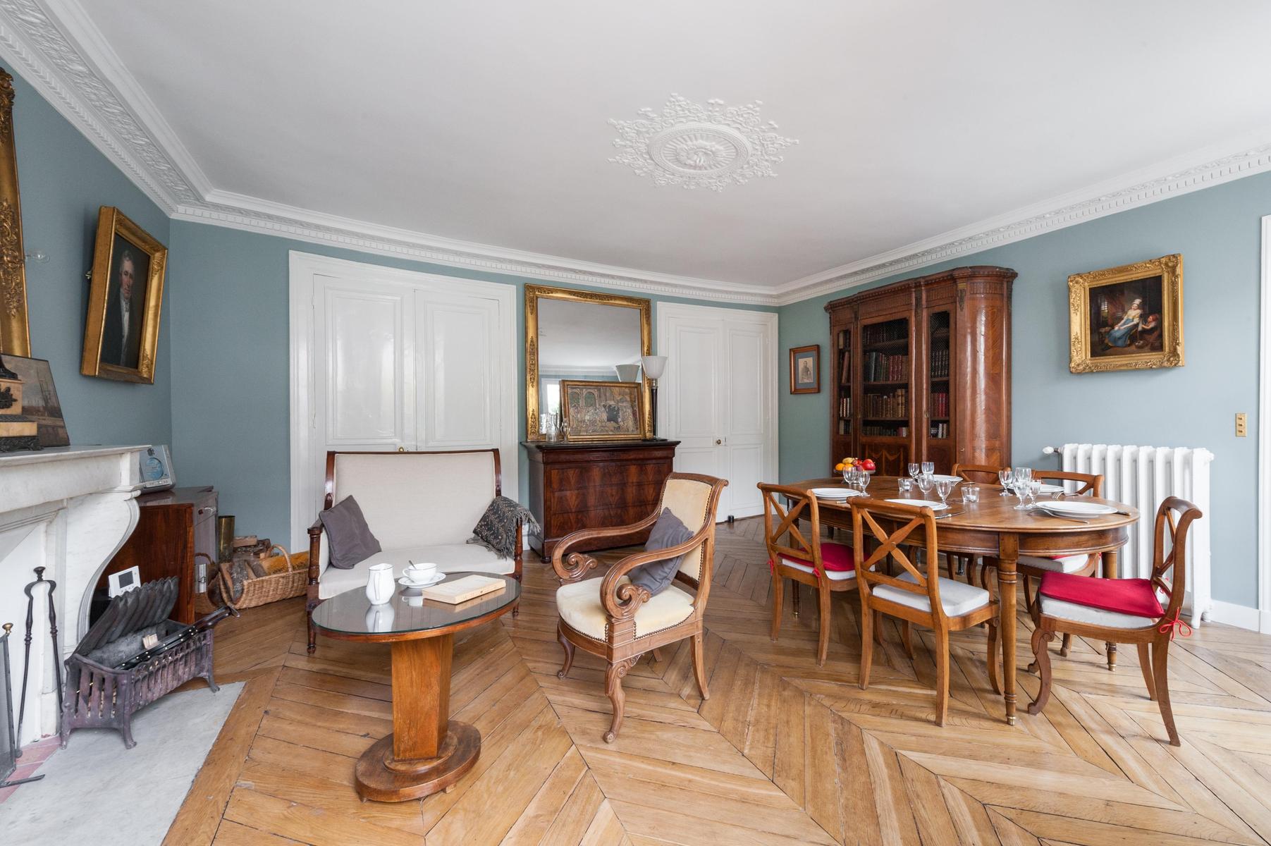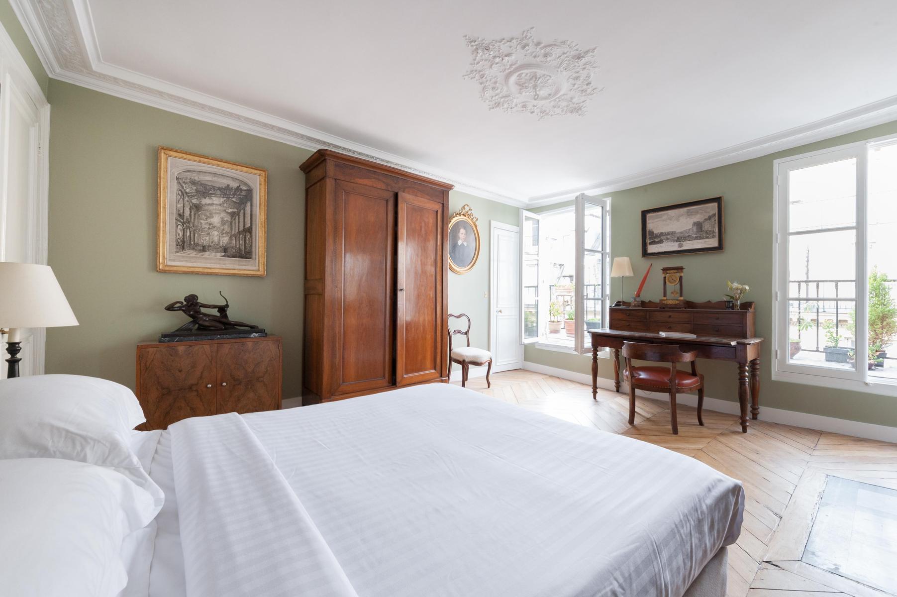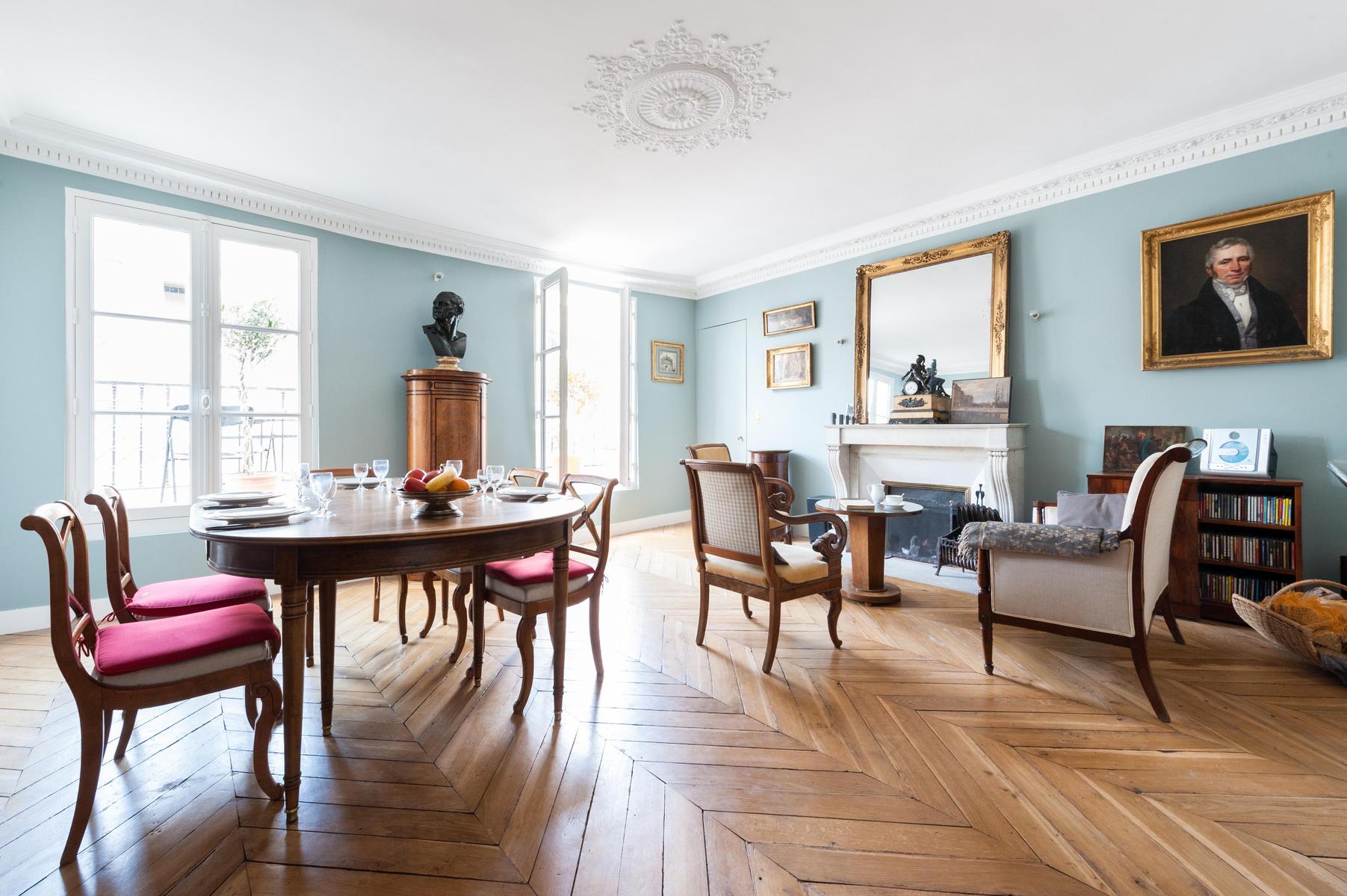 Peintures classiques dans des cadres sculptés, des tomes en cuir, des meubles anciens rembourrés – en entrant dans la rue du Faubourg Montmartre, vous découvrirez une histoire de famille qui s’étend sur un siècle. Un air royal imprègne chaque espace élégant – dans la salle à manger formelle, les chaises traditionnelles en acajou s’assoient côte à côte de la table à manger, surplombée de portraits ancestraux. Un bureau antique dans la chambre principale offre un endroit paisible pour faire une pause, tandis que l’odeur enivrante de fleur d’oranger sur la terrasse sur le toit est le complément parfait d’un petit-déjeuner à la fresque.