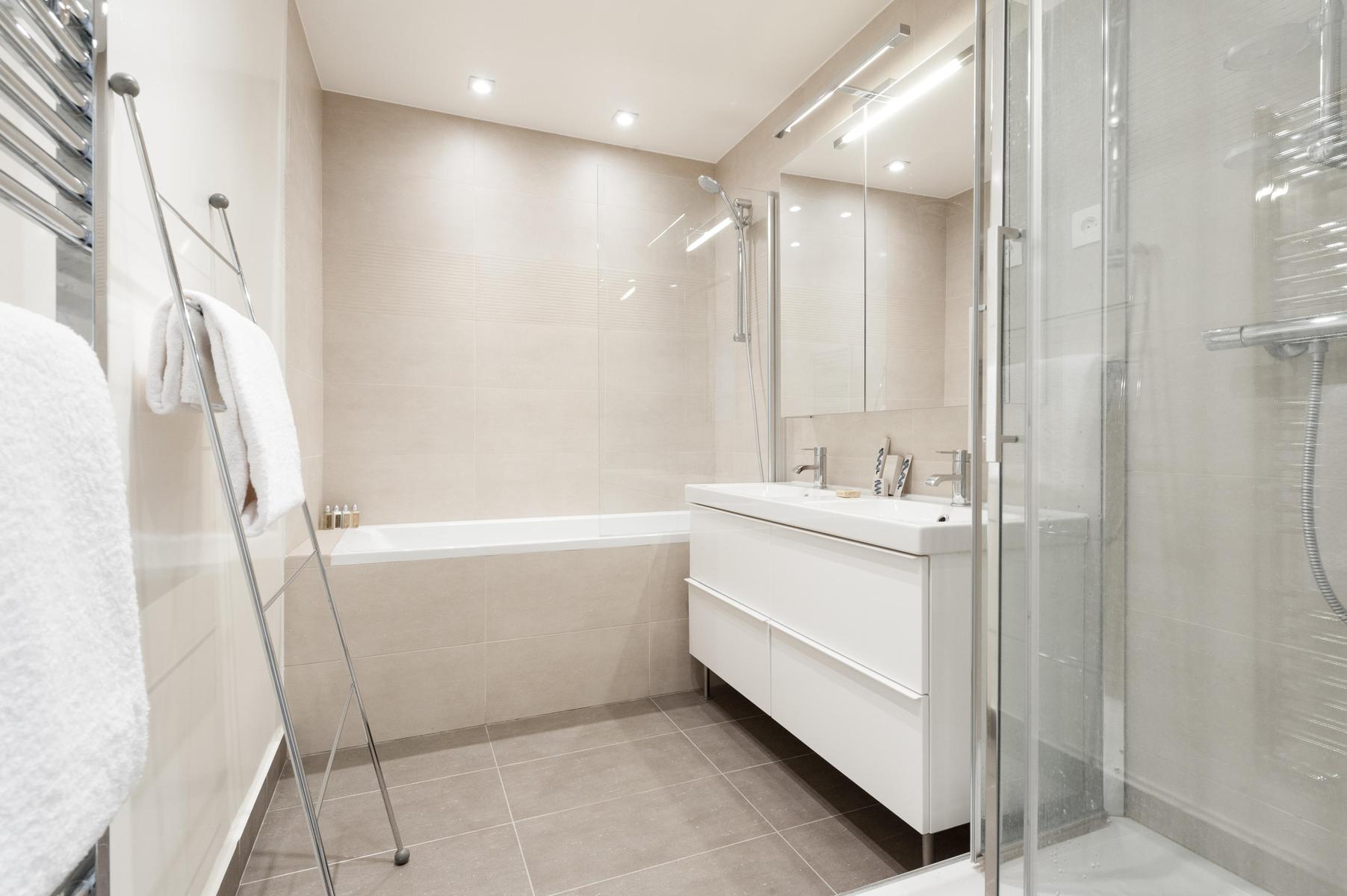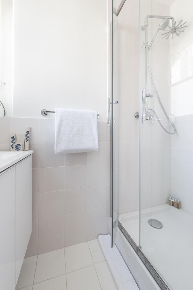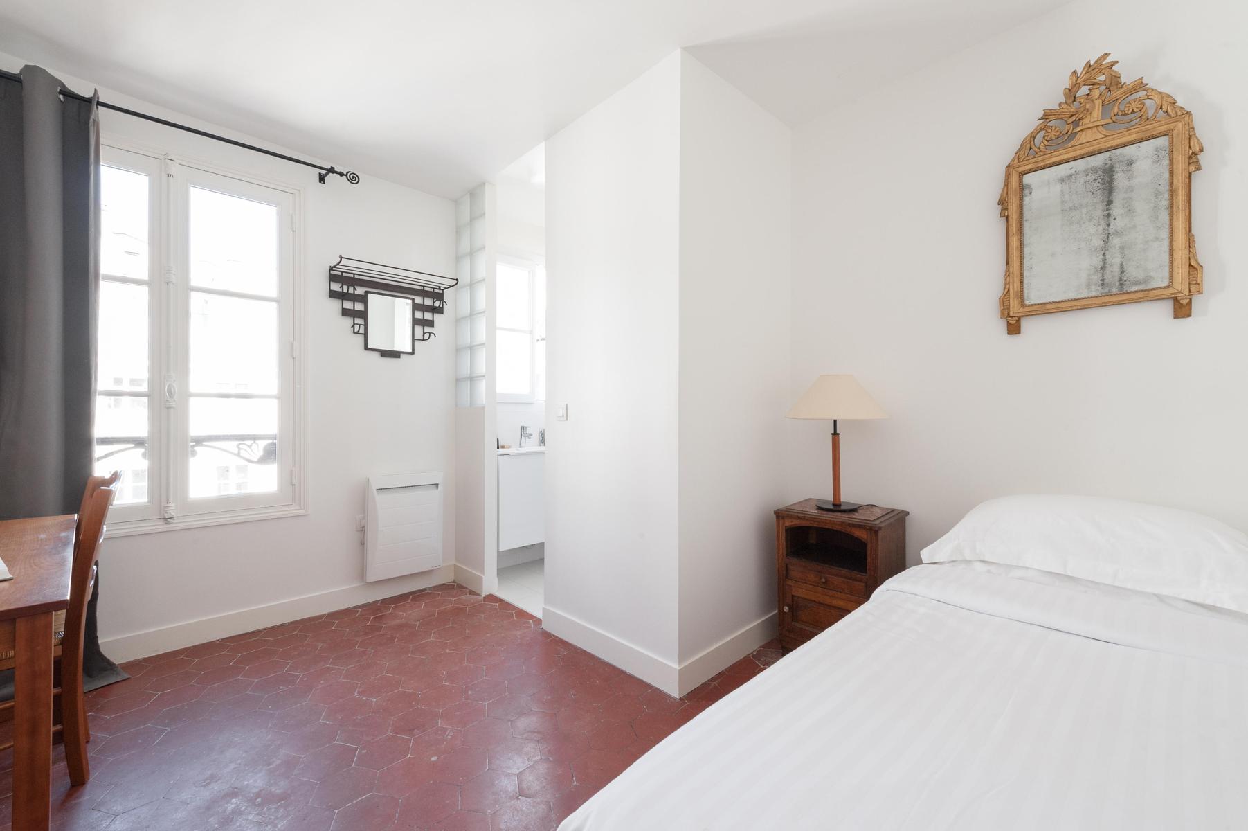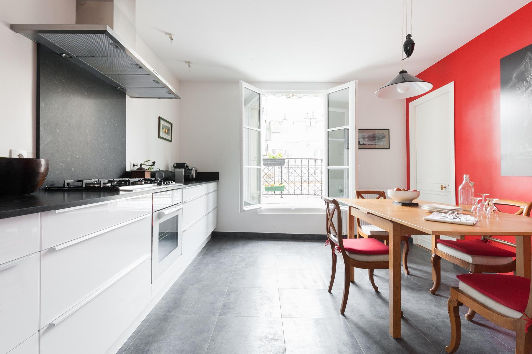 Une ancienne machine à écrire et un modèle de voiture à l’ancienne marquent le passé, tandis que la cuisine moderne et la salle de bains d’un blanc éclatant sont fraîches et contemporaines. Mieux encore, il y a des fenêtres sur toute la hauteur qui, complétées par cette vue sur le cinquième étage, assurent une lumière naturelle en abondance. Niché au cœur de l’Opéra, il y a aussi beaucoup de choses à voir à l’extérieur. La rue en contrebas est animée par des restaurants, des bistros et des bars, tandis que la rue des Martyrs – avec son marché de week-end animé – n’est qu’à quelques minutes.