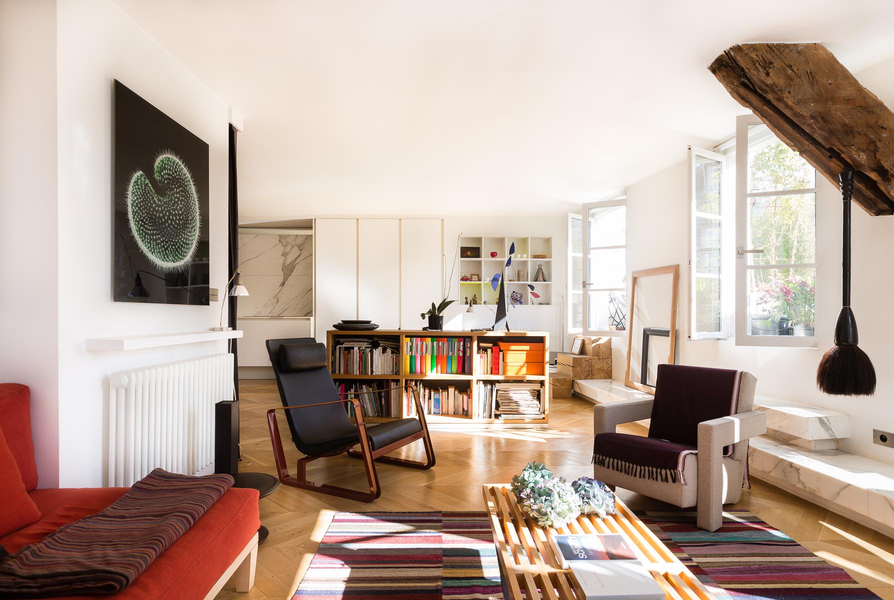 Et puis, à droite de la cuisine, vous trouverez le salon, un espace élégamment conçu. À l’extrémité proche, il y a un petit bureau, et au-delà, il y a un coin salon avec un élégant canapé et des fauteuils, un tapis vif et plusieurs œuvres d’art inhabituelles. De plus, des marches en bois mènent à l’une des fenêtres de cette pièce, qui donne sur une terrasse verdoyante avec table et chaises.