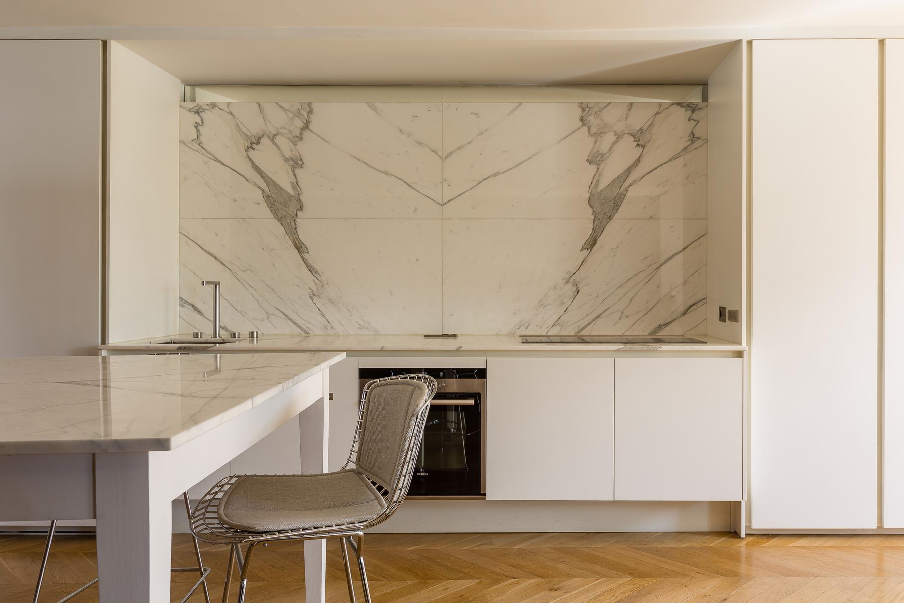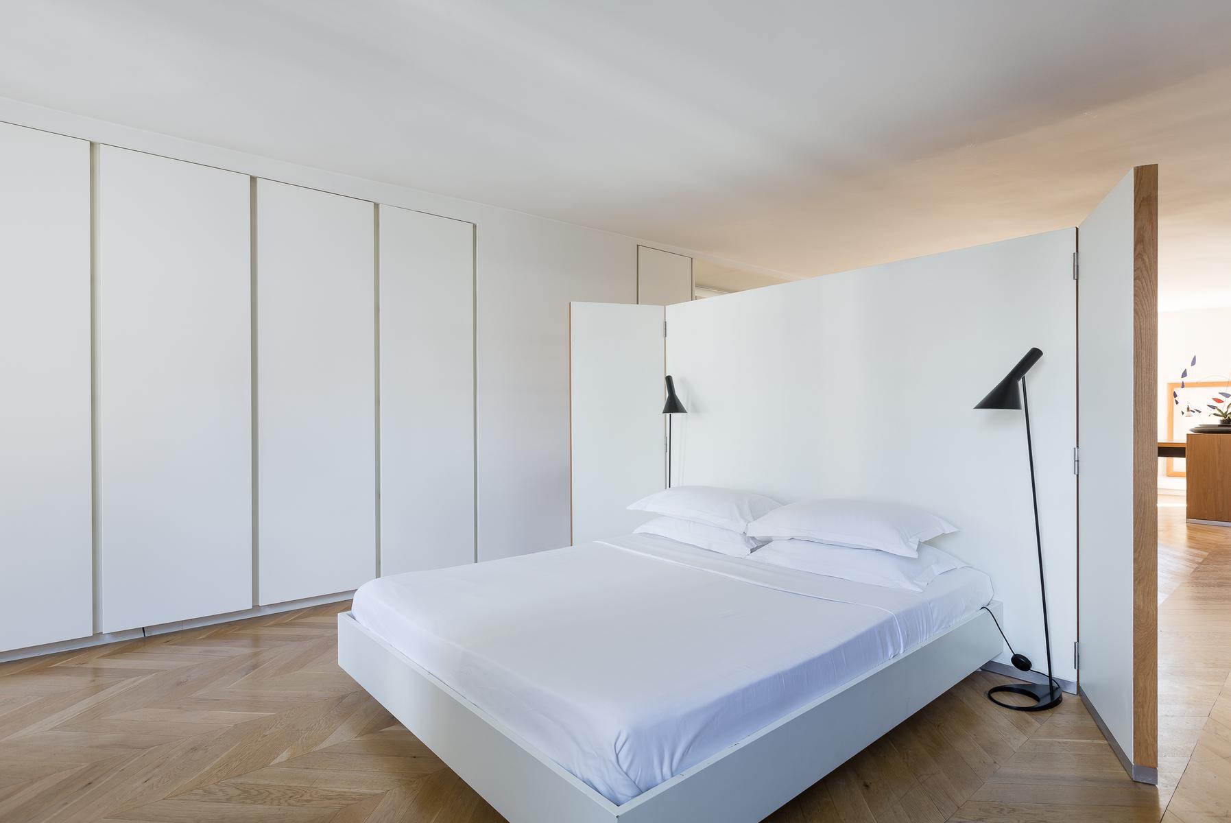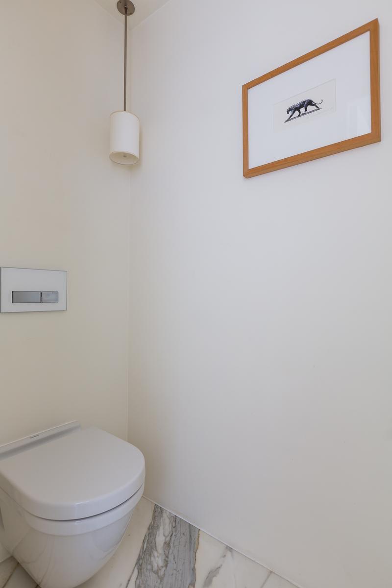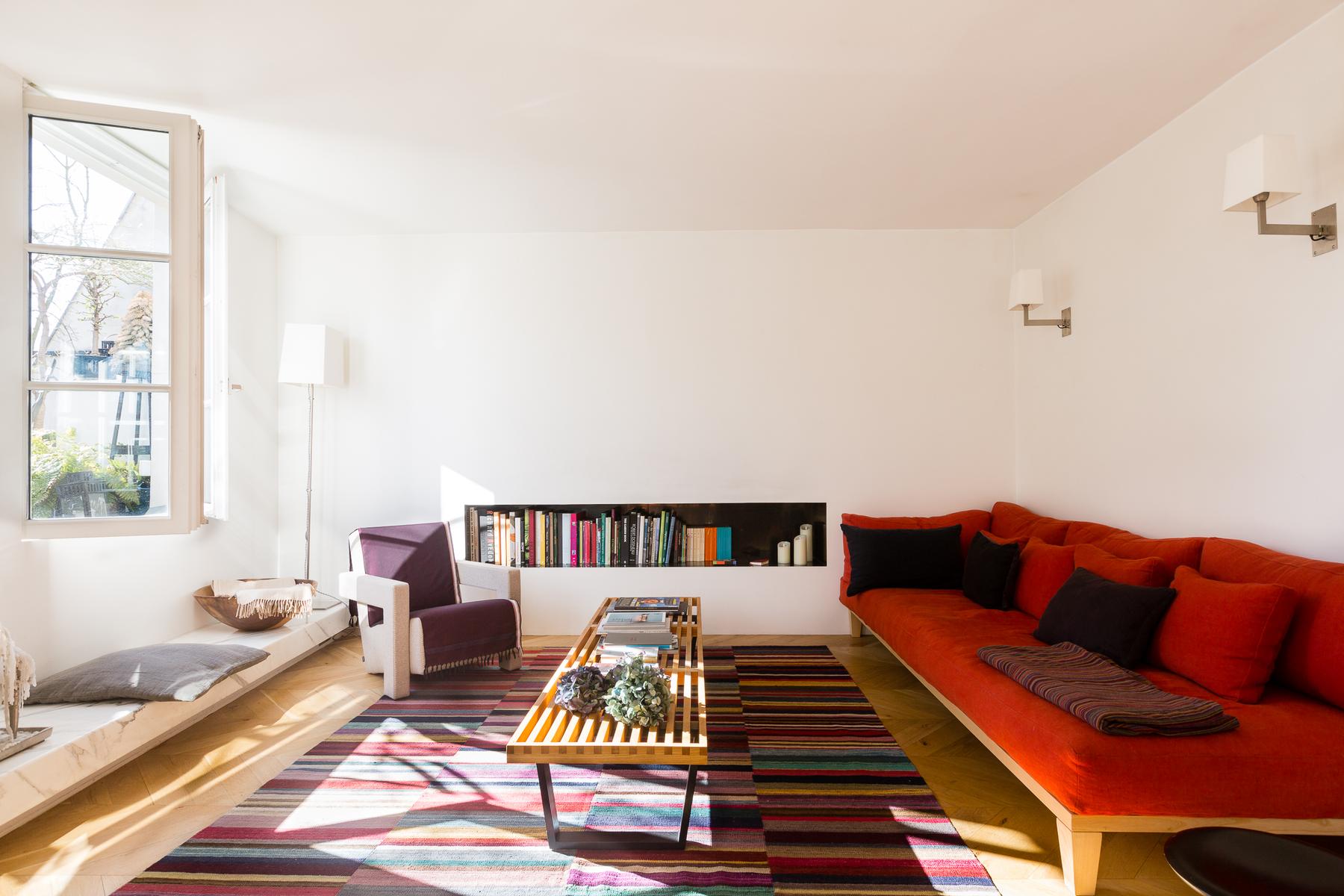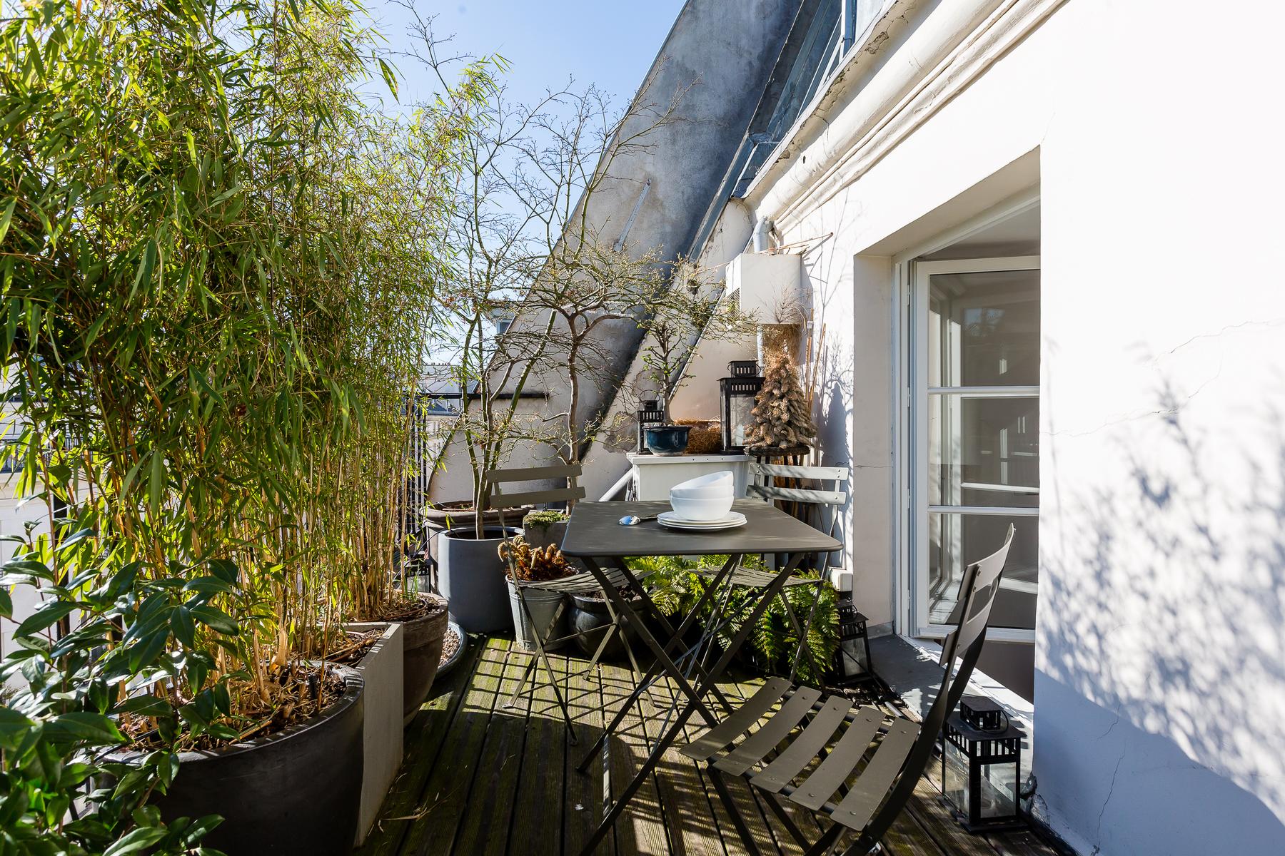 La rue du Faubourg Poissonnière doit être l’un des endroits les plus élégants de l’Opéra. La porte d’entrée donne directement sur la cuisine, qui a un mur de marbre et une grande table à manger avec six tabourets. A gauche, cachée derrière un écran en bois, se trouve la chambre principale – entièrement blanche, avec un lit queen-size et des armoires élégantes. Elle jouxte la salle de bain en marbre, avec sa spacieuse baignoire (avec douche intégrée).