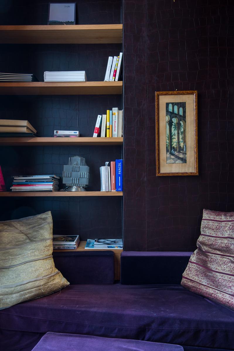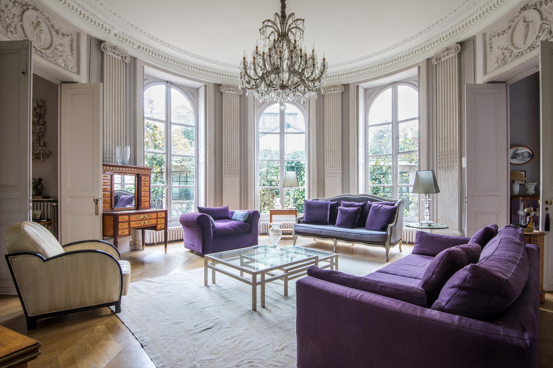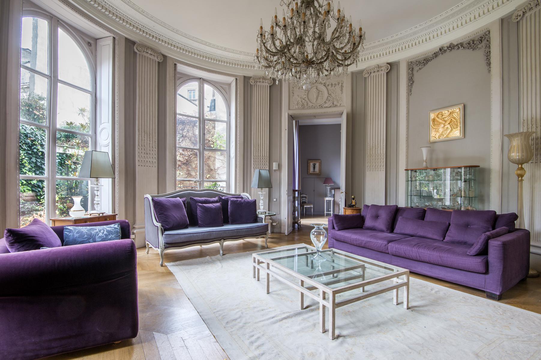 Du magnifique salon, une pièce circulaire aux moulures classiques aux frappants canapés violets et de très belles