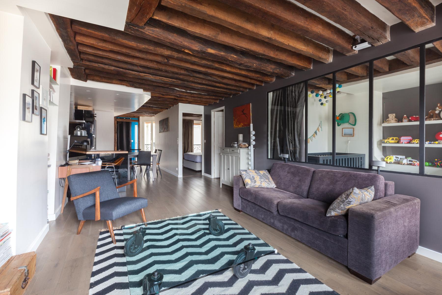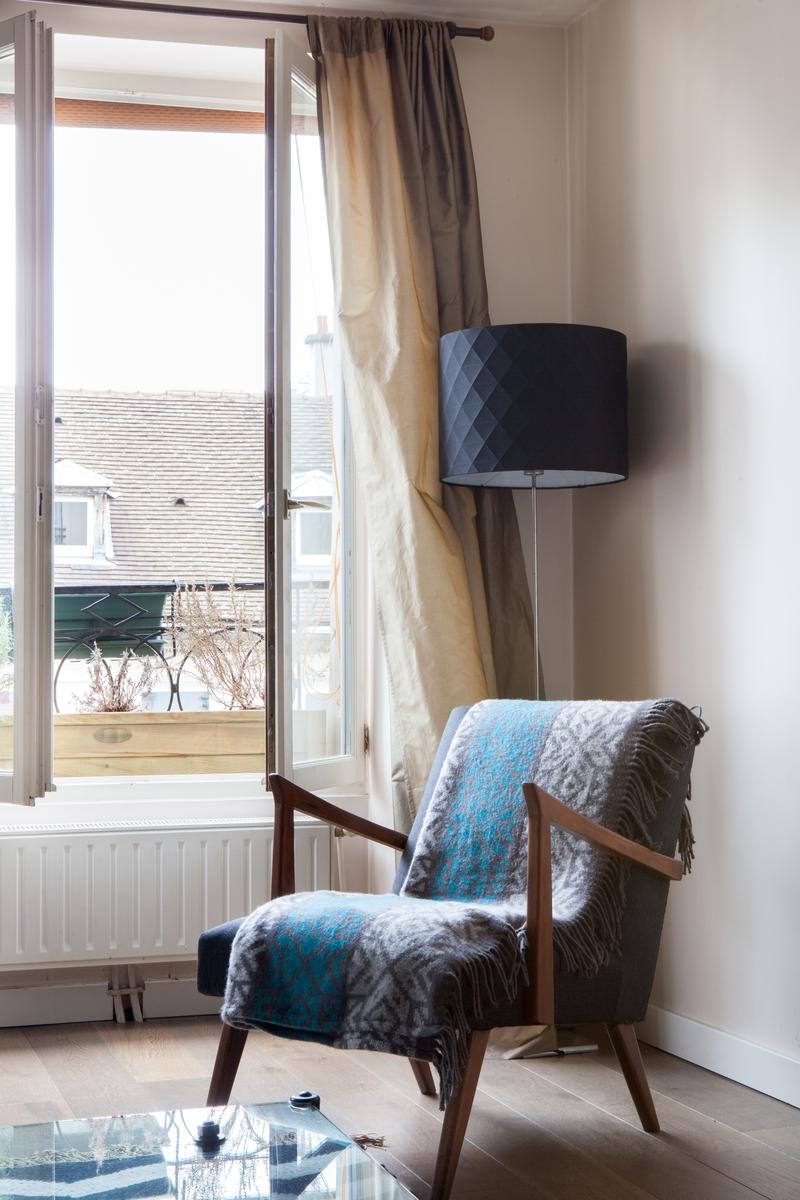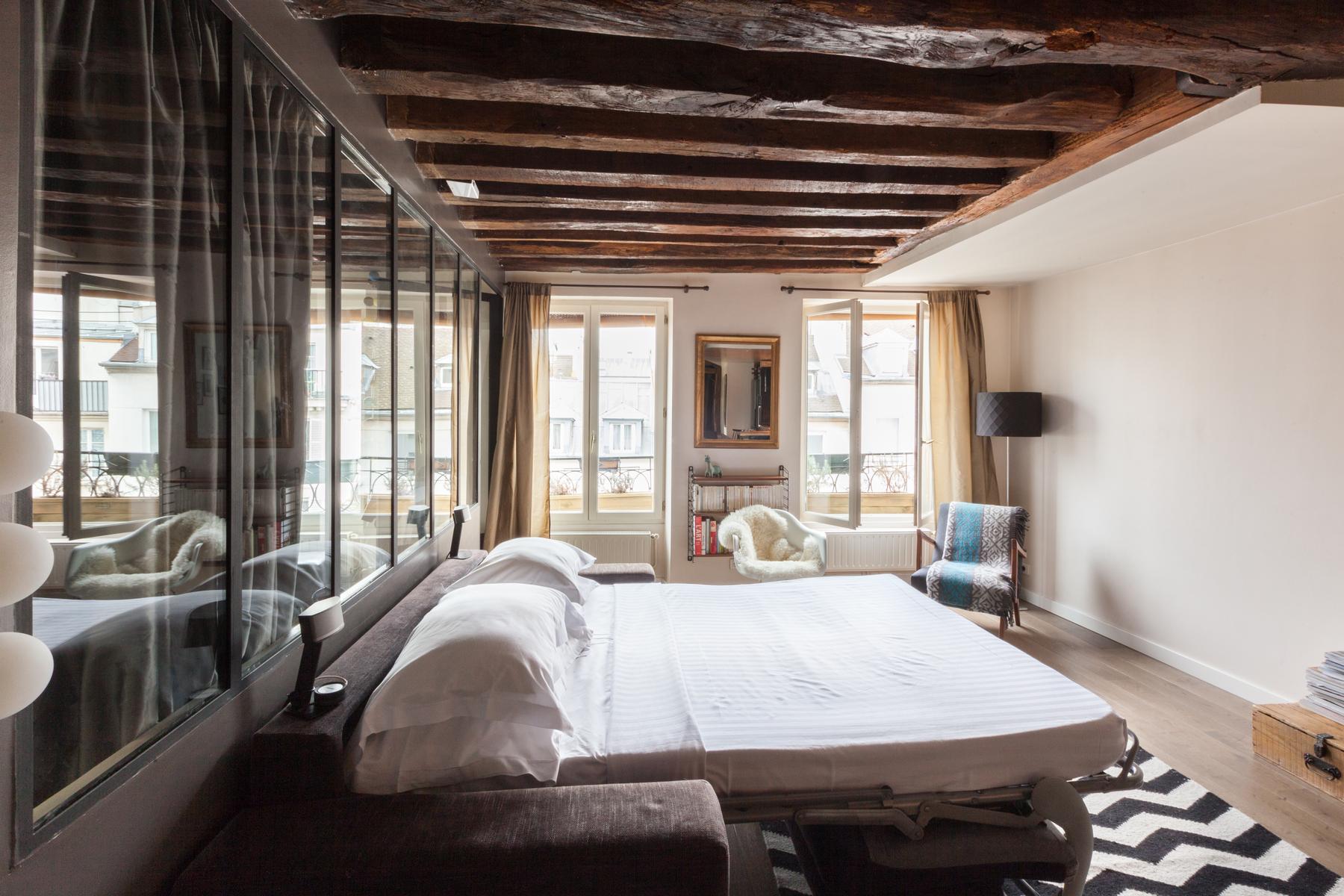 Situé sur un ancien boulevard du Temple, il n’est pas surprenant que le bâtiment du Faubourg Saint-Martin soit historique. Dans le salon accueillant, les planchers de bois donnent lieu à des fenêtres drapées et des poutres de bois foncé courent le long du plafond. Des fenêtres d’atelier séparent la jolie chambre d’enfant de l’espace de vie principal, ses empreintes animales douces contrastant avec les œuvres d’art plus audacieuses du salon. Et dans cette maison à aire ouverte, il y a aussi une chaise berçante doublée de peau d’agneau, près de la pile de magazines lustrés que vos hôtes collectionnent.