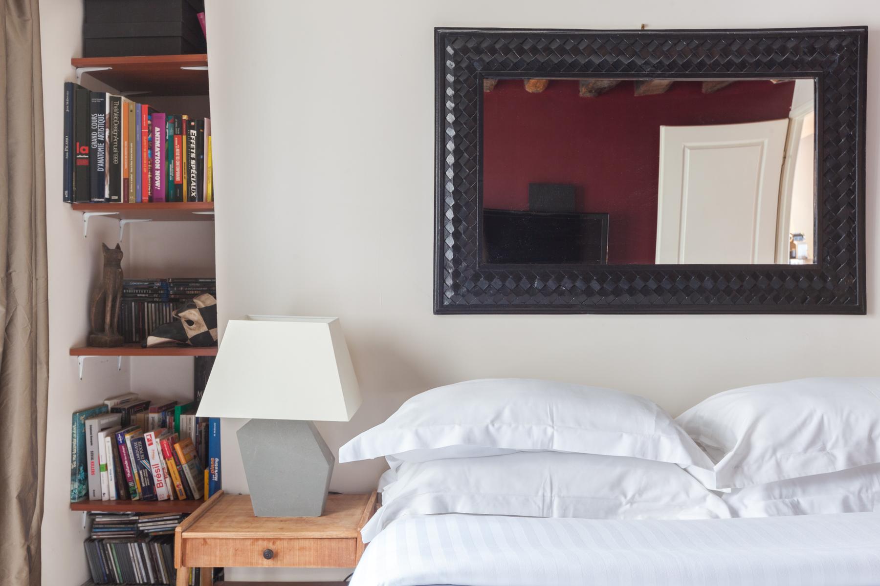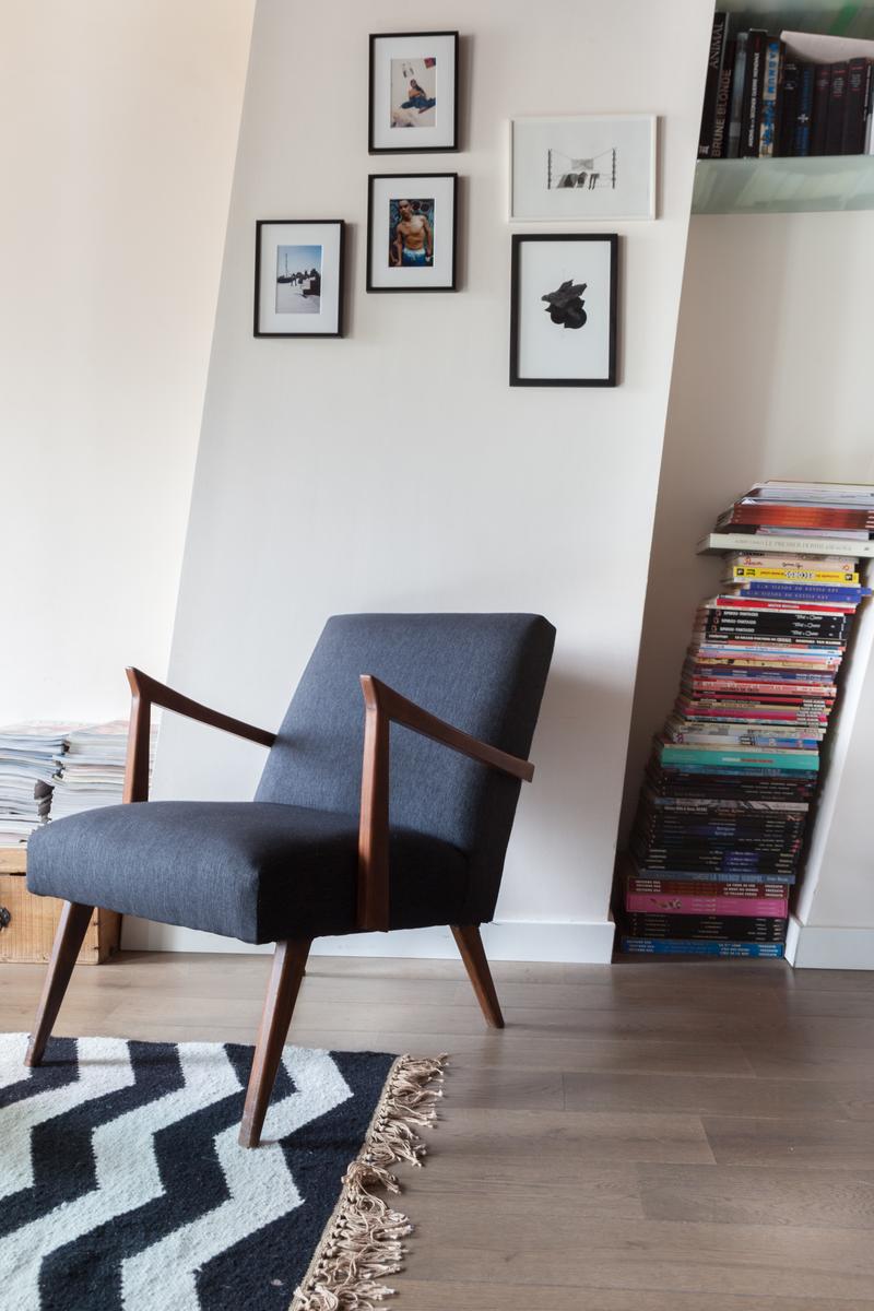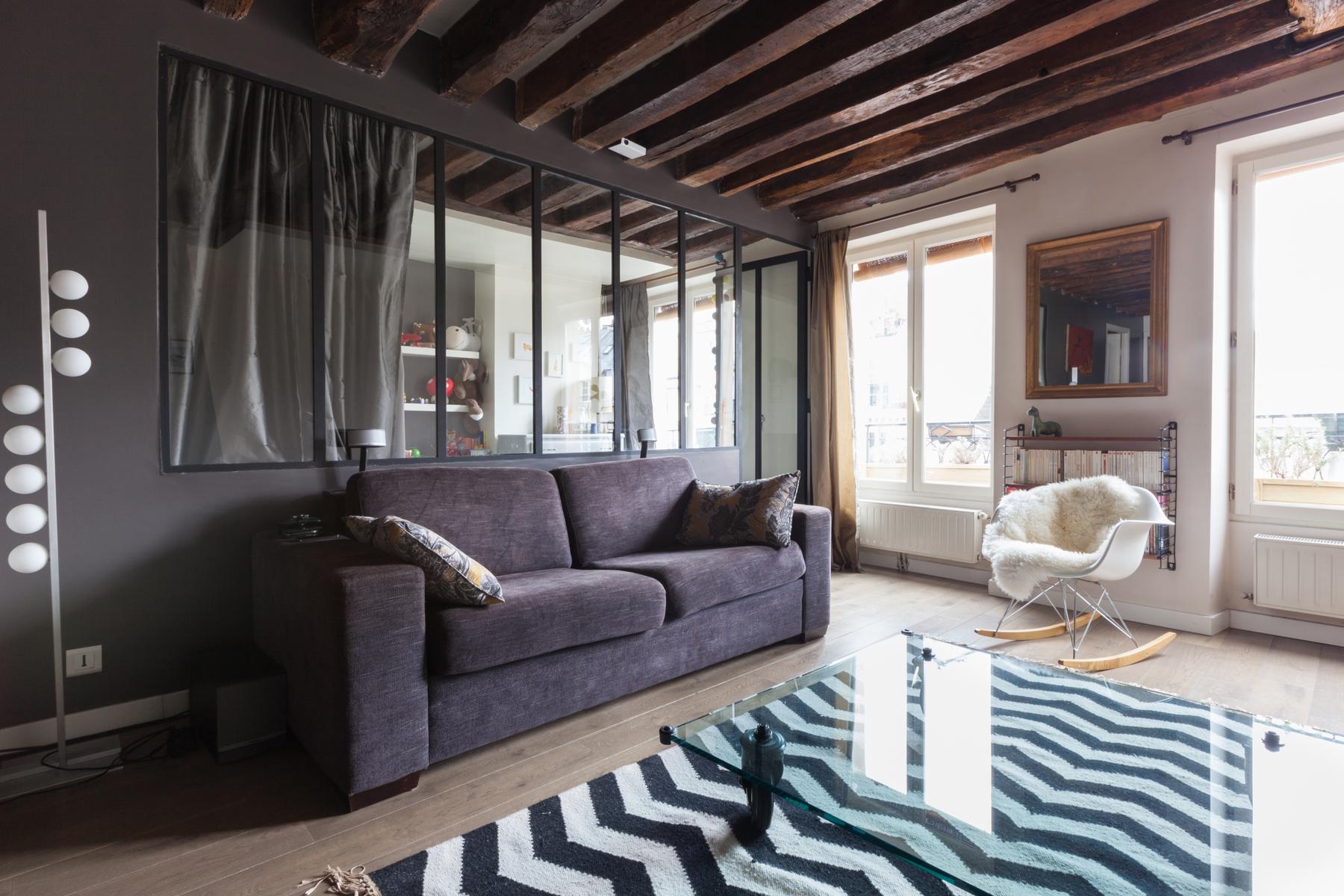Situé sur un ancien boulevard du Temple, il n’est pas surprenant que le bâtiment du Faubourg Saint-Martin soit historique. Dans le salon accueillant, les planchers de bois donnent lieu à des fenêtres drapées et des poutres de bois foncé courent le long du plafond. Des fenêtres d’atelier séparent la jolie chambre d’enfant de l’espace de vie principal, ses empreintes animales douces contrastant avec les œuvres d’art plus audacieuses du salon. Et dans cette maison à aire ouverte, il y a aussi une chaise berçante doublée de peau d’agneau, près de la pile de magazines lustrés que vos hôtes collectionnent.