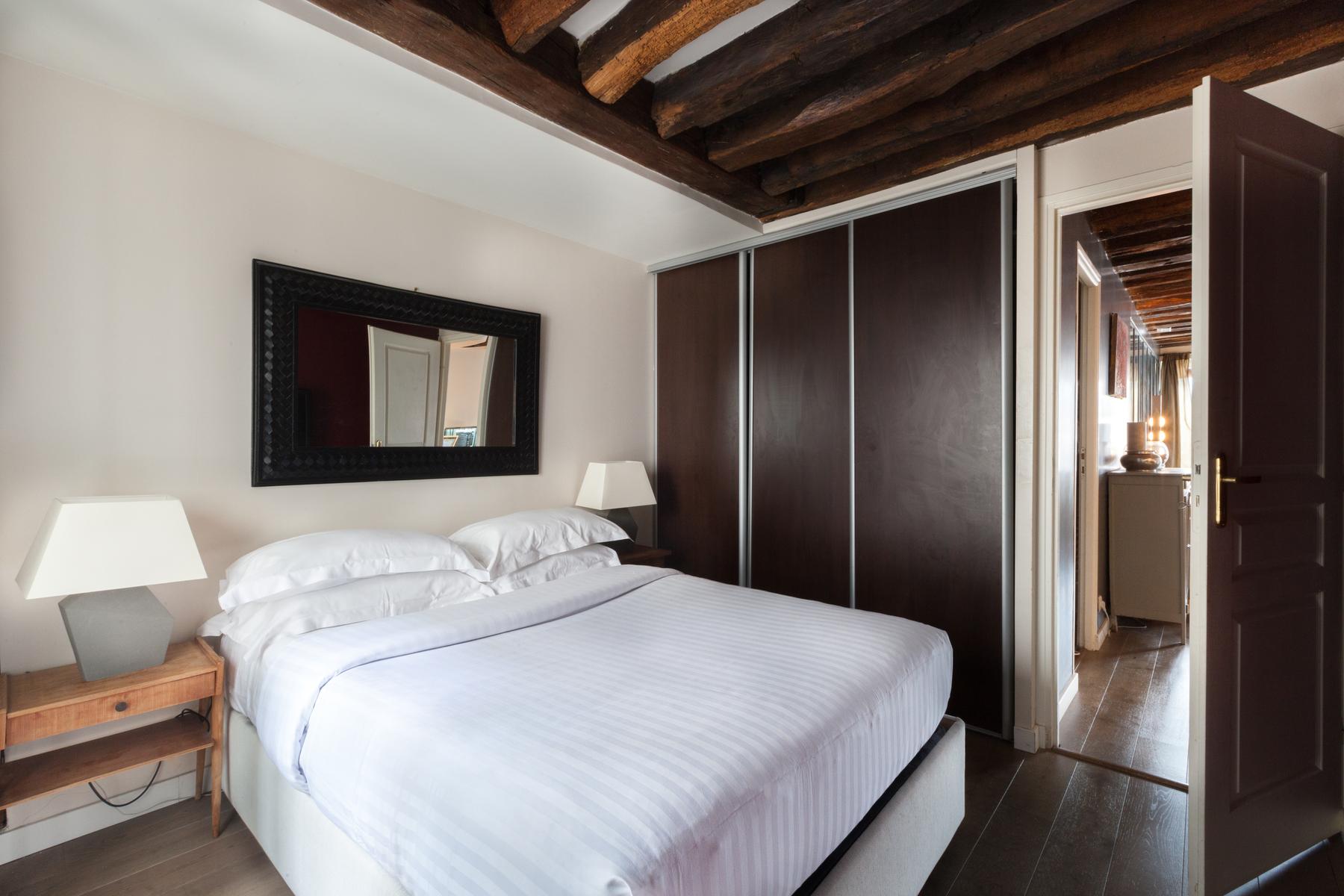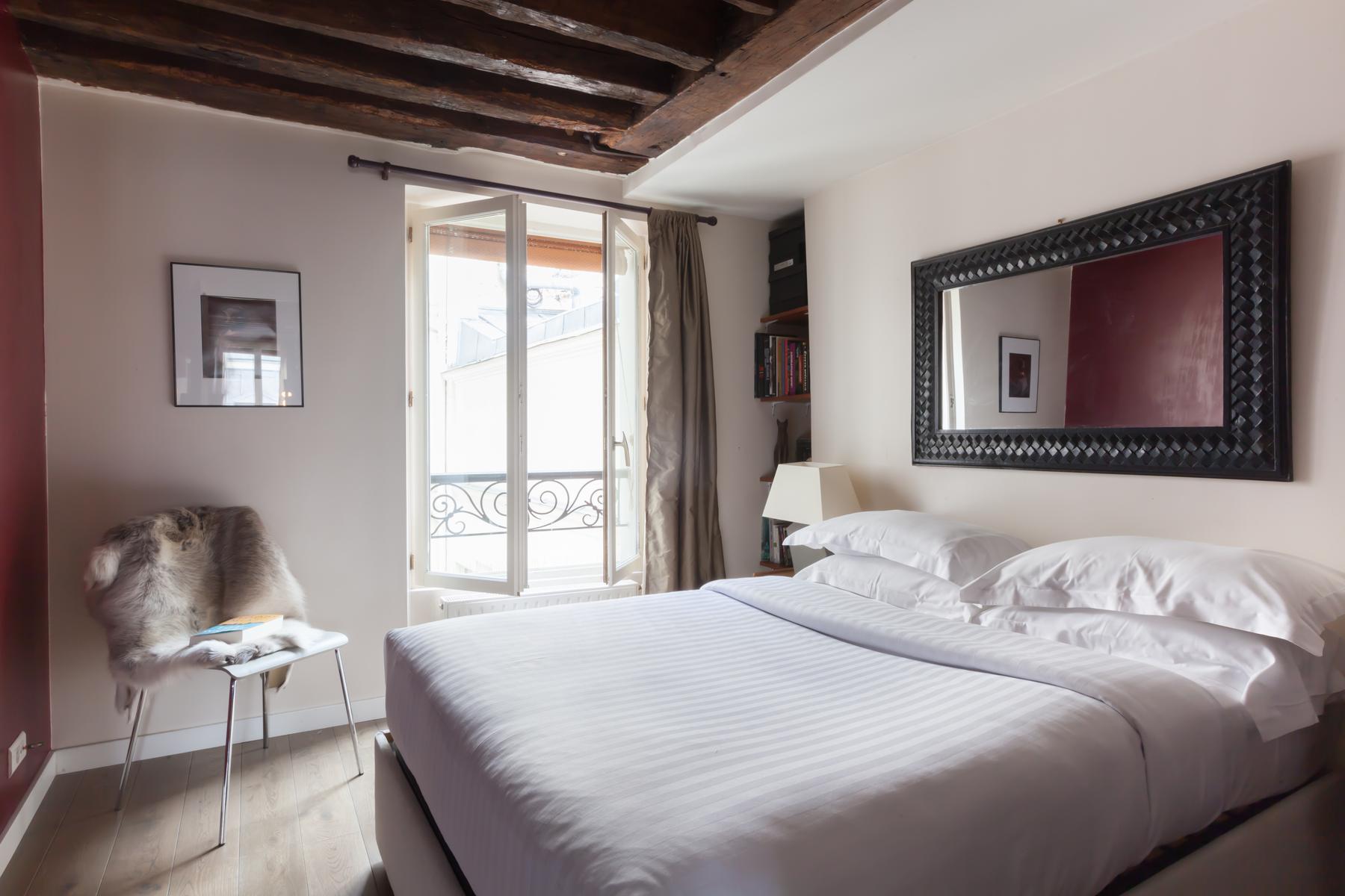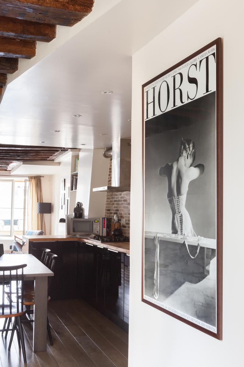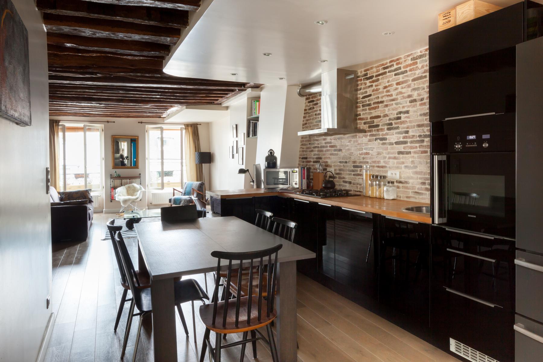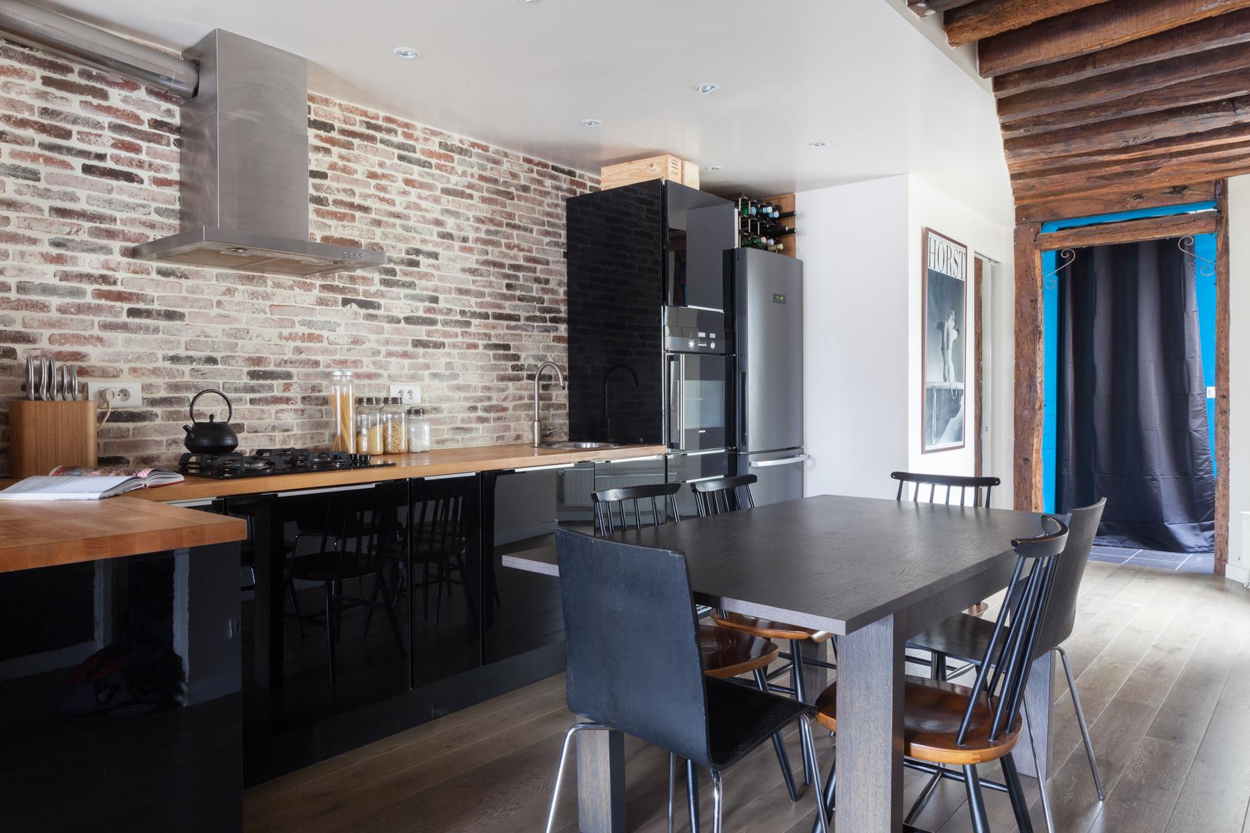 Dans la chambre principale, des fenêtres doubles s’ouvrent sur un délicat balcon Juliette. Des détails bien pensés – un masque d’arlequin, un chandelier angulaire et un miroir en bois sculpté embellissent cet espace sophistiqué. L’espace de vie est juste au-delà : admirez l’imprimé Horst qui est accroché à un mur, ou allez plus loin pour trouver la cuisine élégante. Les briques apparentes et les surfaces noires polies sont lisses et les chaises à dossier en bâton flanquent une table à manger peinte. Le Canal Saint-Martin est à proximité pour des promenades tranquilles l’après-midi, et il y a aussi beaucoup de restaurants et de parcs à explorer.