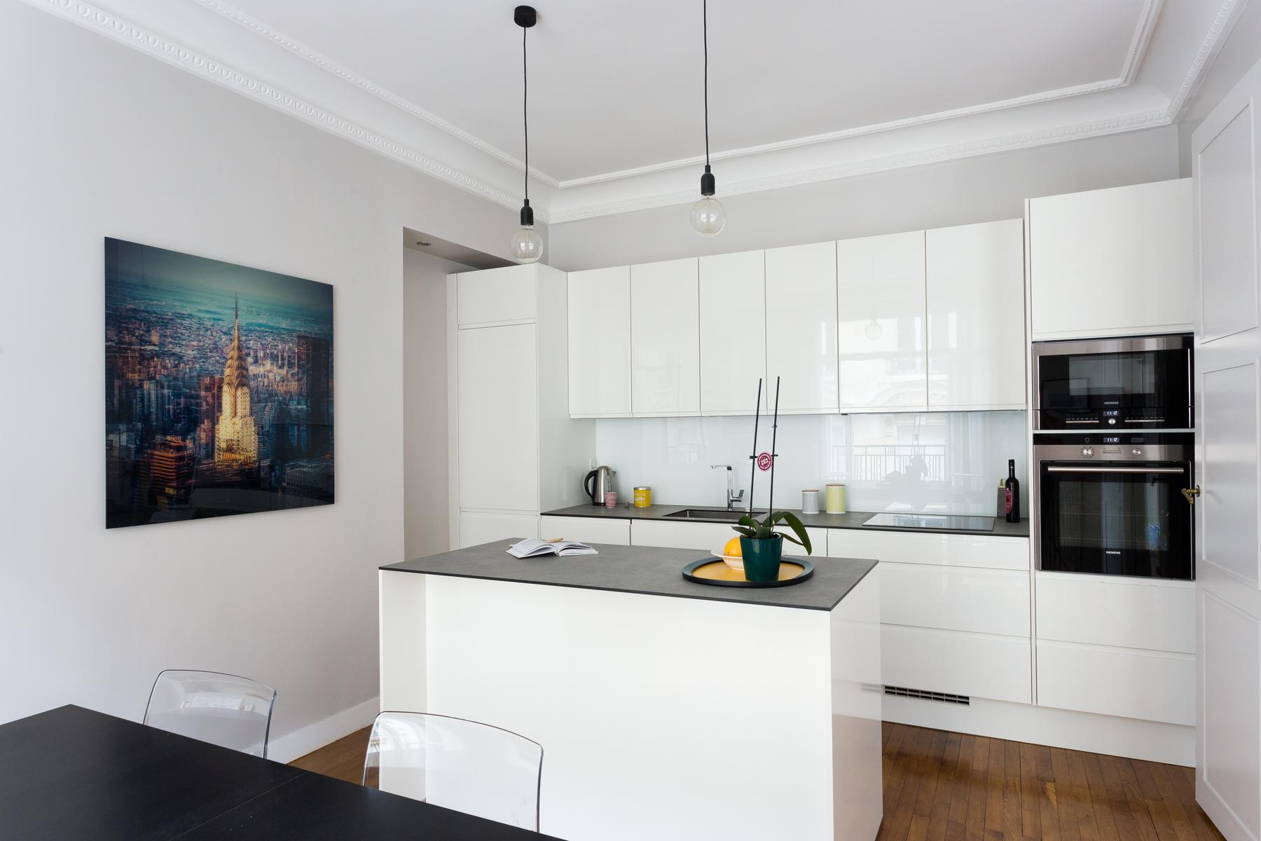 Dans un bâtiment Art Déco, un mélange de détails traditionnels charmants et de pièces contemporaines donne à cette maison son air sophistiqué. A gauche dans l’élégant hall d’entrée, vous trouverez deux salles de toilettes, puis le salon. Peint en blanc et plancher de bois, avec de longues fenêtres drapées de couleur pâle, c’est une collection d’œuvres d’art et de livres qui lui donne de la personnalité. Au centre, sur un tapis à motifs, un canapé et une paire de fauteuils anciens se font face sur une table basse propre. Au-delà du canapé, une porte mène à la cuisine, élégamment décorée en noir, gris et blanc, avec une table à manger élégante.