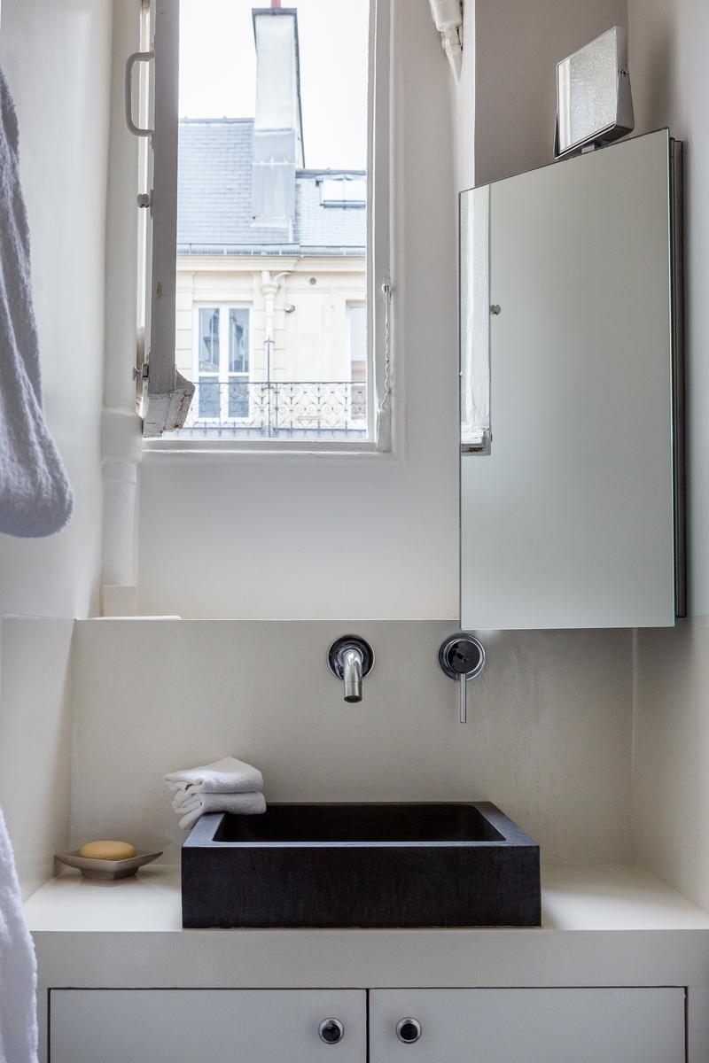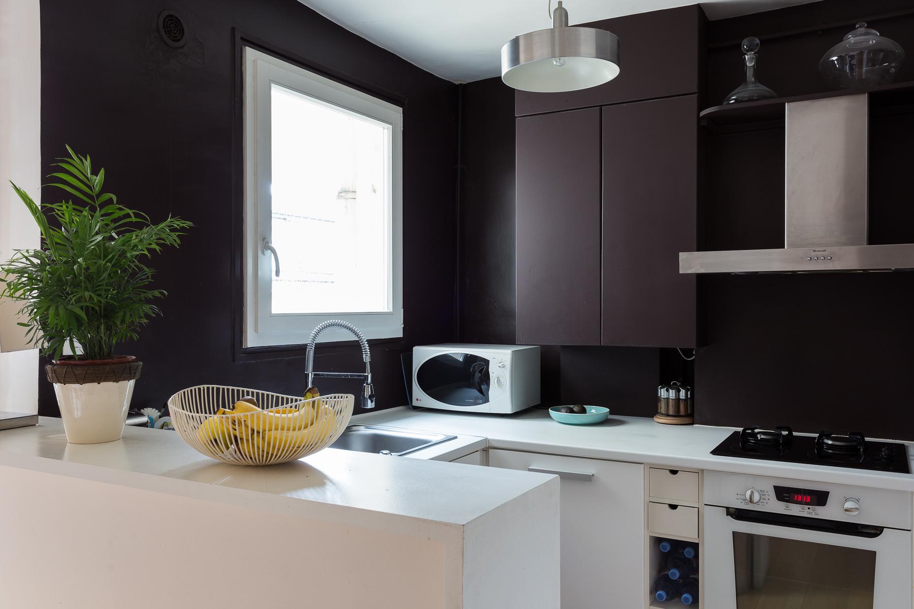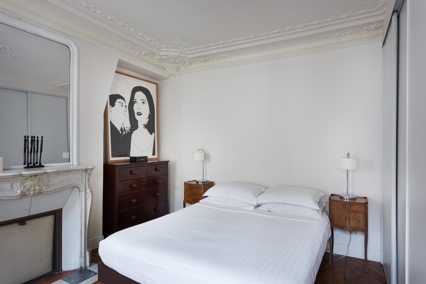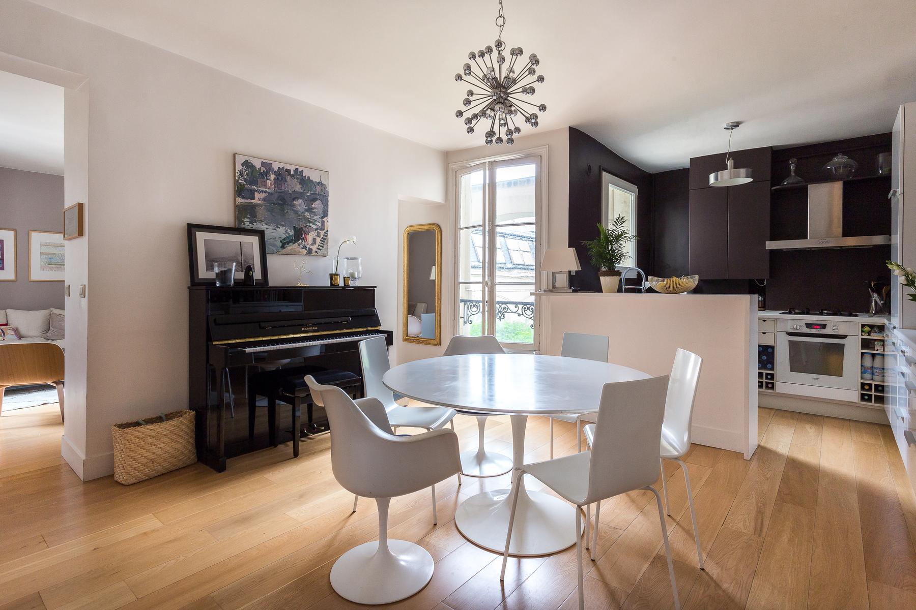 A la fois classique et contemporaine, cette maison de Saint-Germain-des-Prés est tout à fait chic. La porte d’entrée se trouve en haut de plusieurs volées d’escaliers (il n’y a pas d’ascenseur), et s’ouvre sur un couloir. Vous passez devant une salle de bains et passez devant la cuisine, où vous trouverez, en plus d’un coin cuisine élégant de couleur aubergine, une table de salle à manger élégante pour six personnes. Ensuite, les deux portes de chaque côté du piano de cette pièce vous mènent au salon – une pièce au plancher de bois peint en gris avec un poêle antique décoratif, un bureau encastré et un canapé, le tout entouré d’œuvres d’art diverses.
