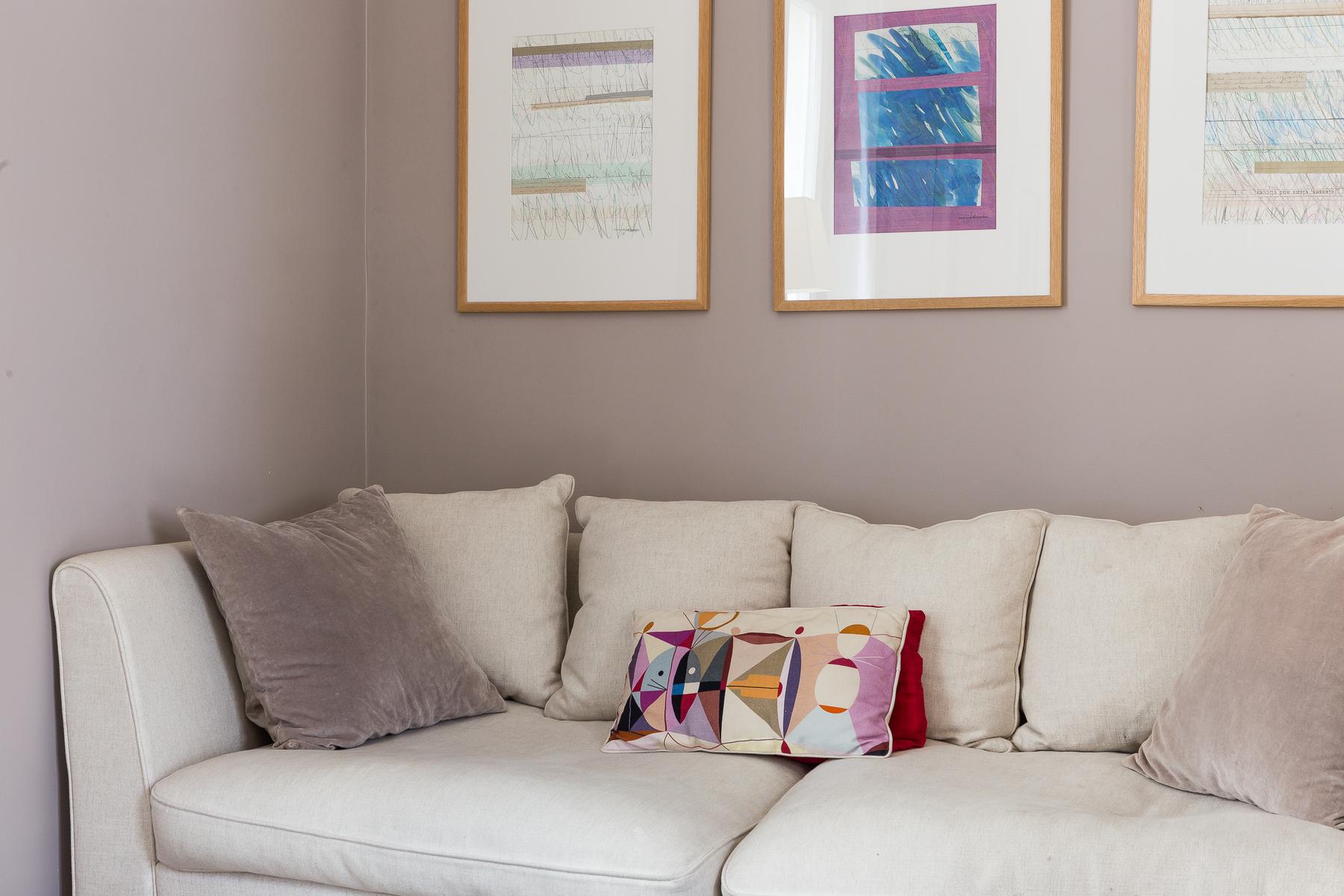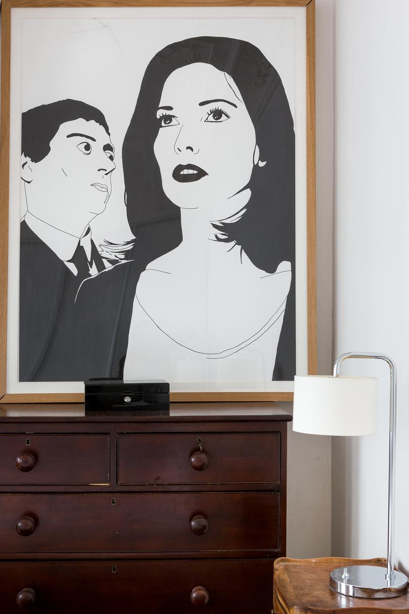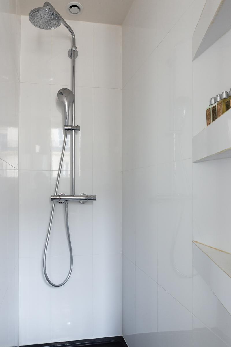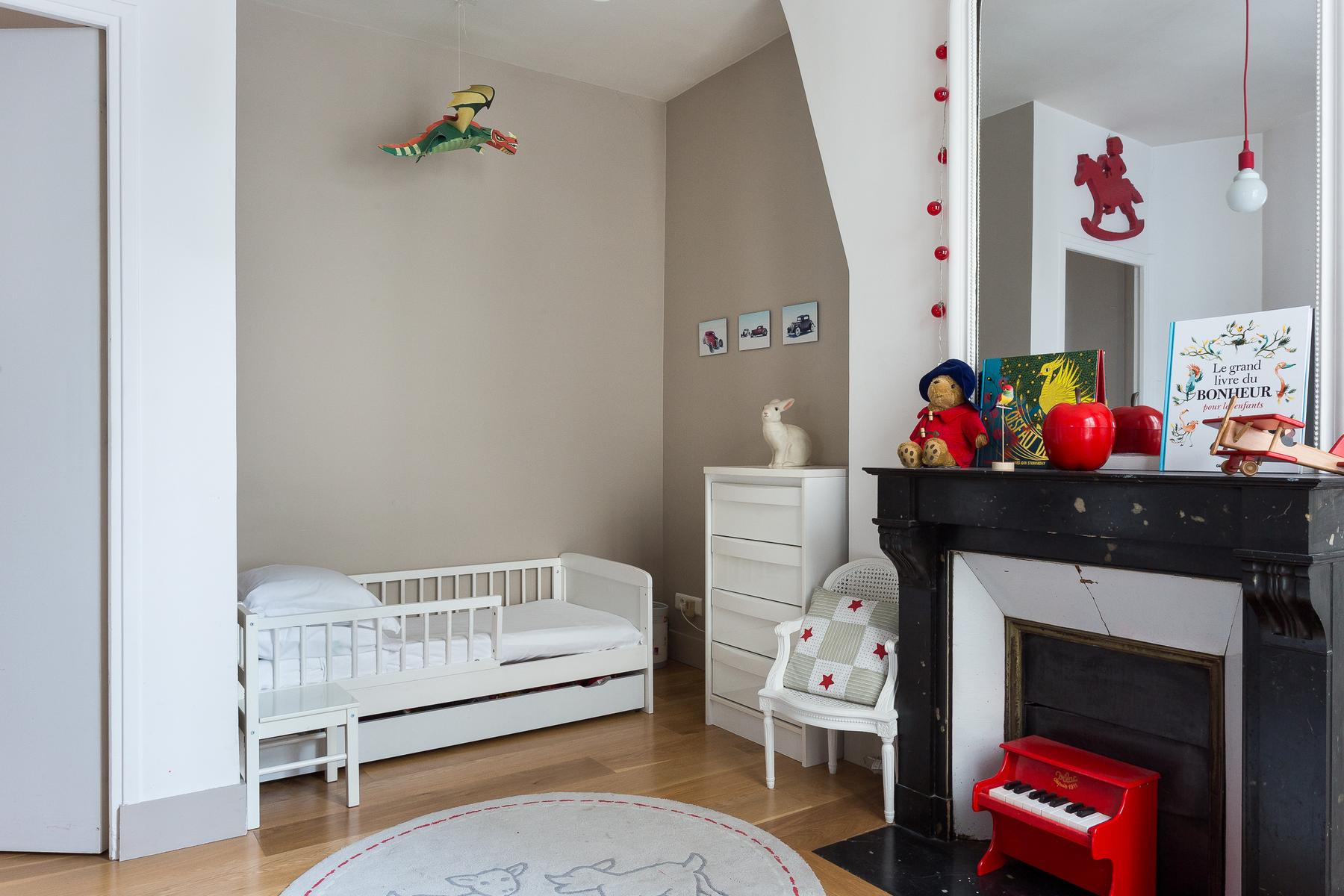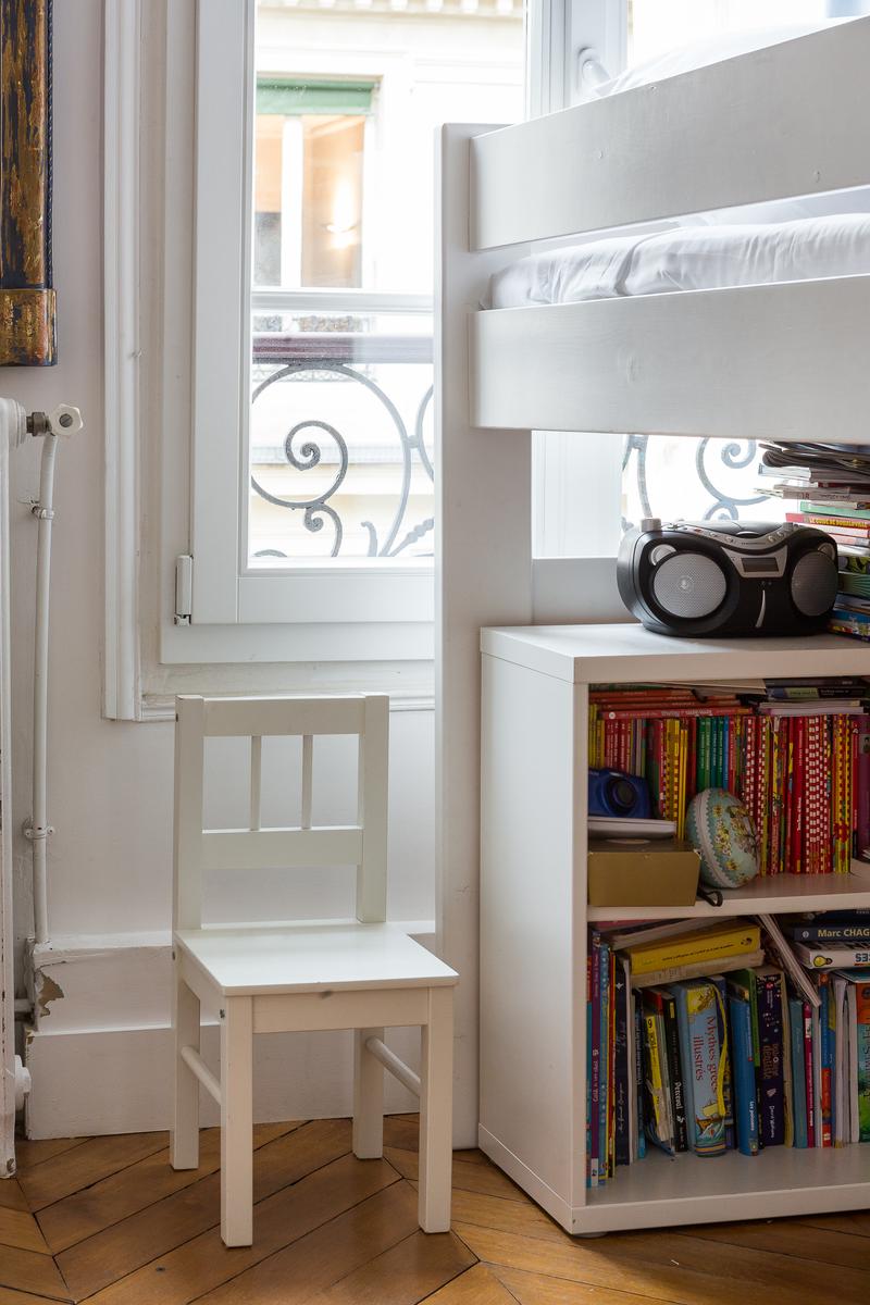 A la fois classique et contemporaine, cette maison de Saint-Germain-des-Prés est tout à fait chic. La porte d’entrée se trouve en haut de plusieurs volées d’escaliers (il n’y a pas d’ascenseur), et s’ouvre sur un couloir. Vous passez devant une salle de bains et passez devant la cuisine, où vous trouverez, en plus d’un coin cuisine élégant de couleur aubergine, une table de salle à manger élégante pour six personnes. Ensuite, les deux portes de chaque côté du piano de cette pièce vous mènent au salon – une pièce au plancher de bois peint en gris avec un poêle antique décoratif, un bureau encastré et un canapé, le tout entouré d’œuvres d’art diverses.