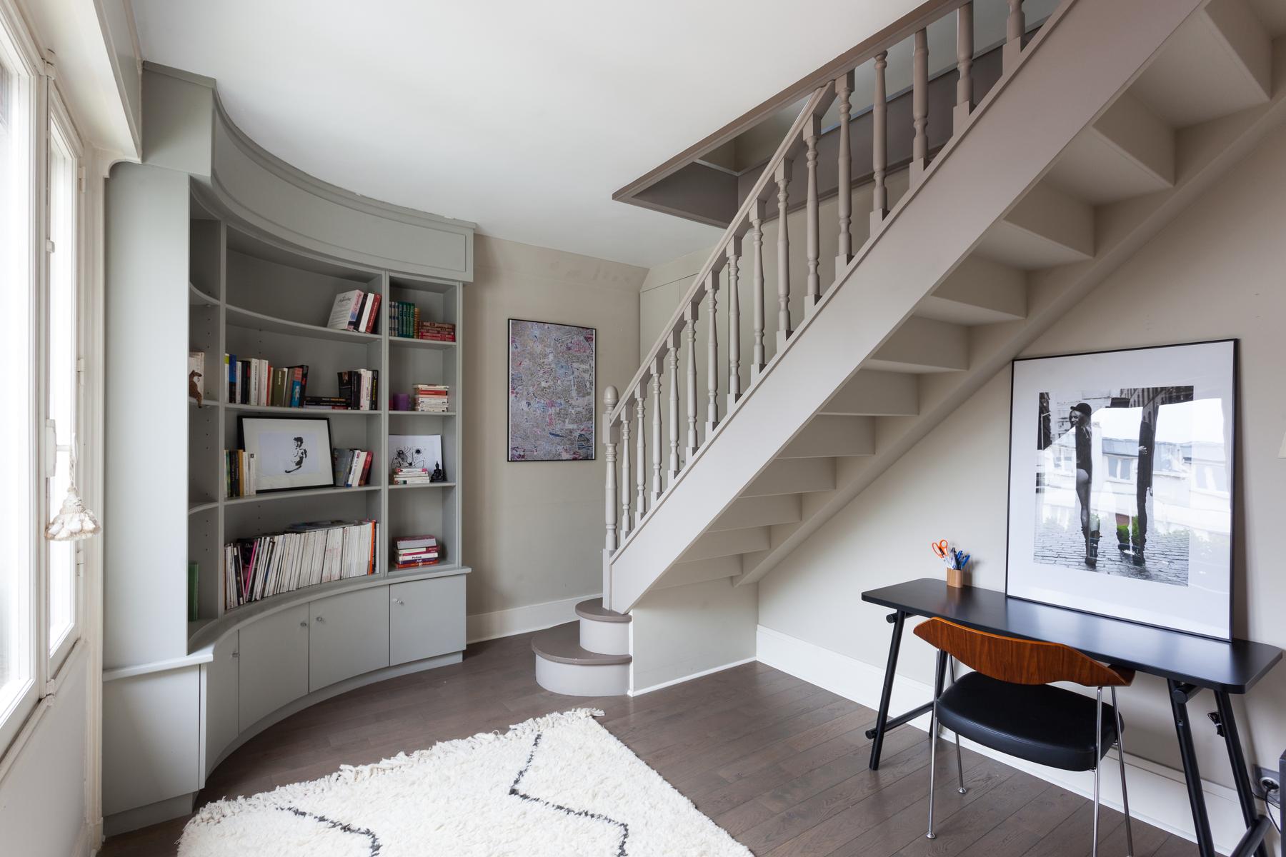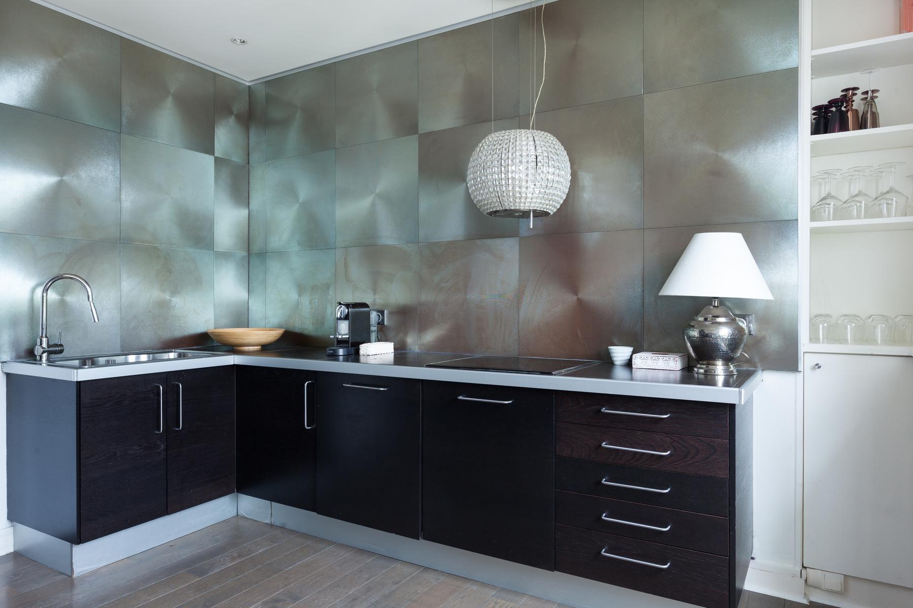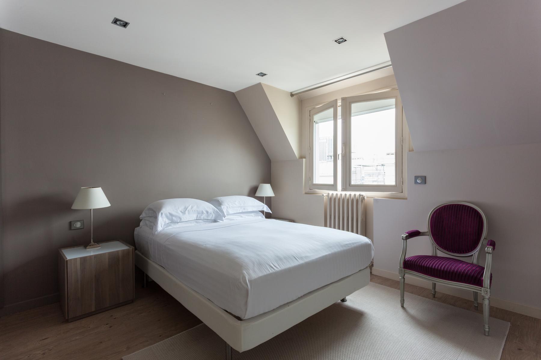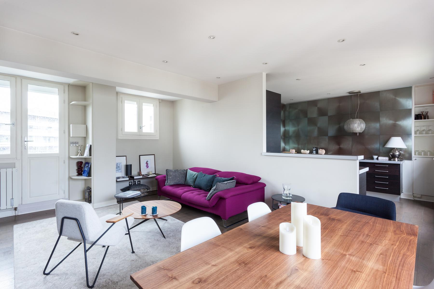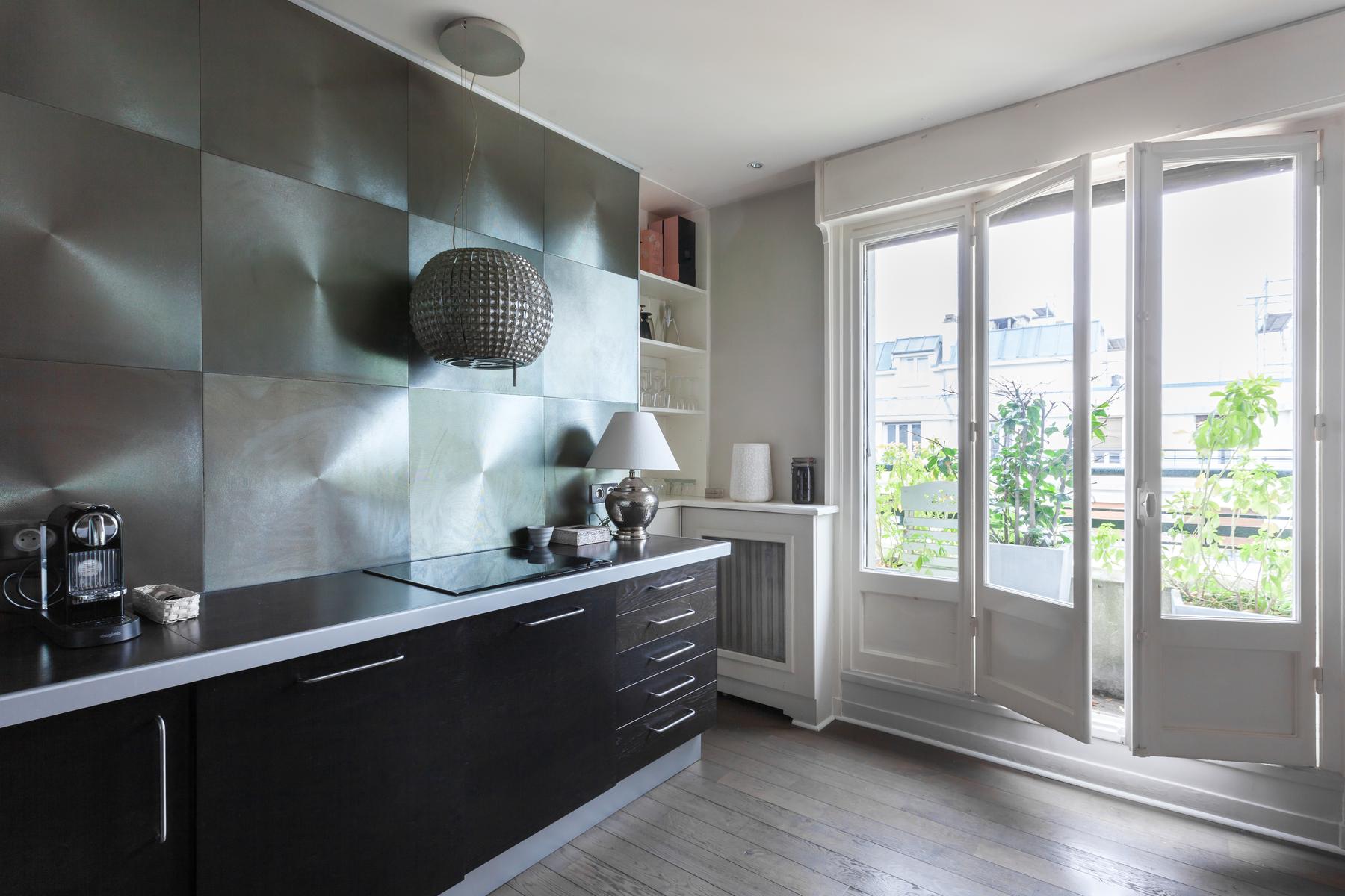 Des couleurs tamisées, un mobilier élégant et des œuvres d’art accomplies confèrent à cette maison de l’Arc de Triomphe – Champs-Élysées un sens de l’équilibre. La porte d’entrée donne sur un couloir, où il y a une salle de bain à gauche, et le salon est droit devant. D’un côté, il y a une longue table à manger, au-delà de laquelle se trouve le coin cuisine – contemporain, avec des murs inhabituels en carreaux d’argent et des armoires noires. Dans un autre coin, il y a un coin salon élégant, avec un canapé violet et un tapis argenté. Les fenêtres de cette pièce s’ouvrent sur le balcon de la rue Duret II, qui offre une vue sur la Tour Eiffel.