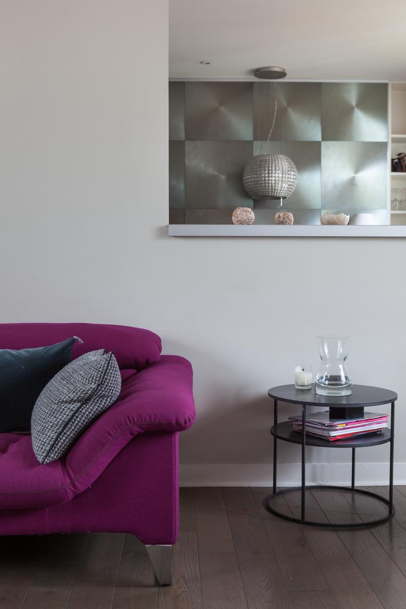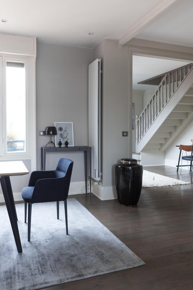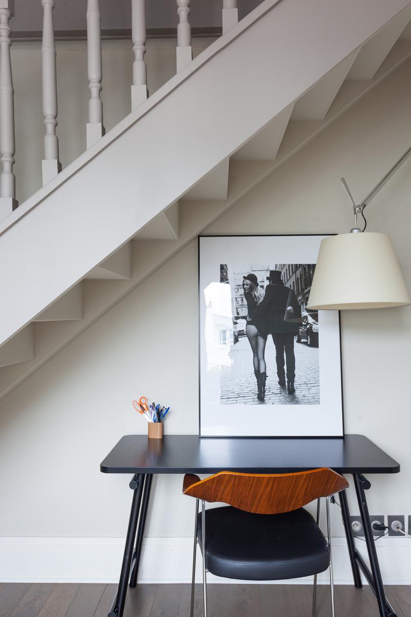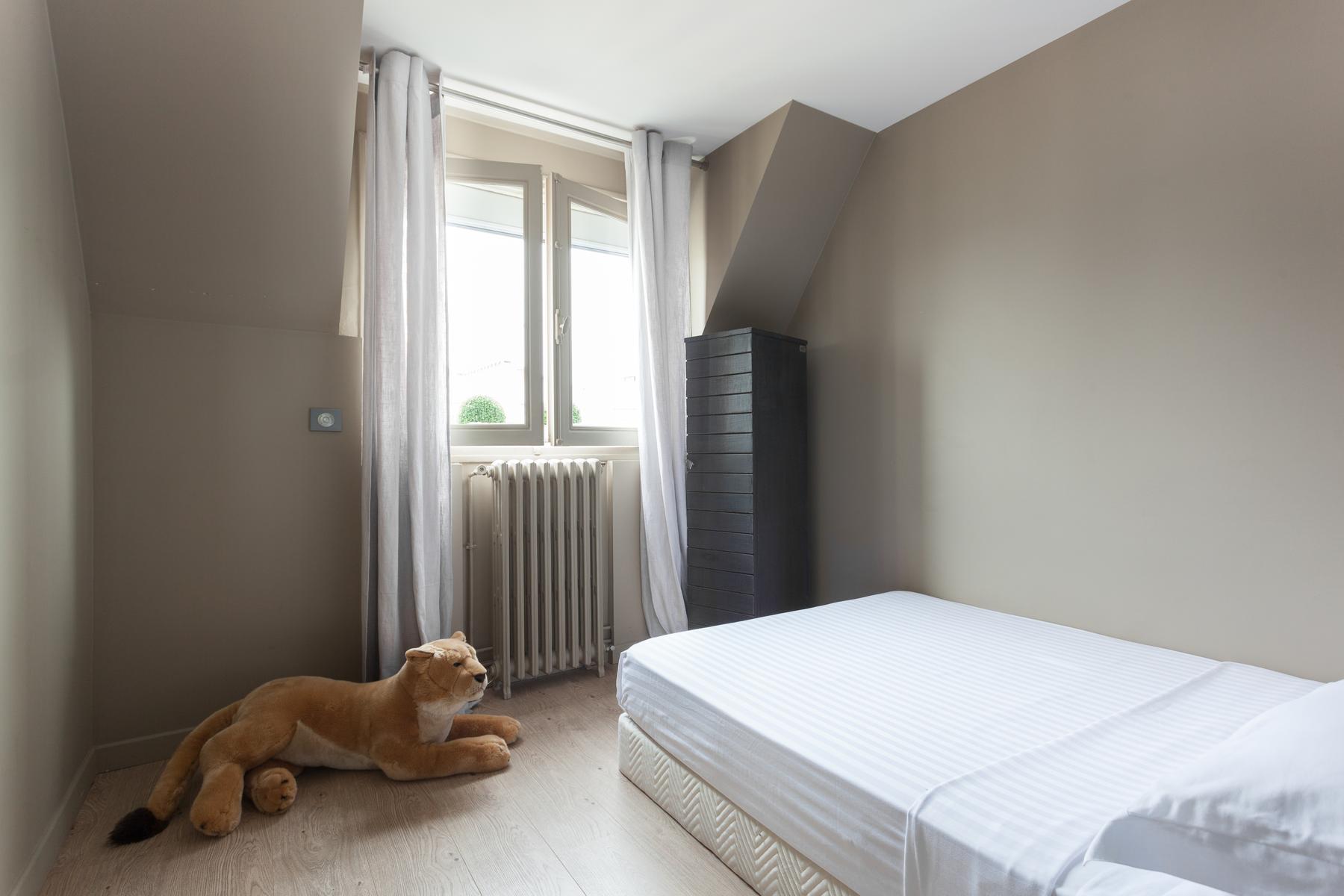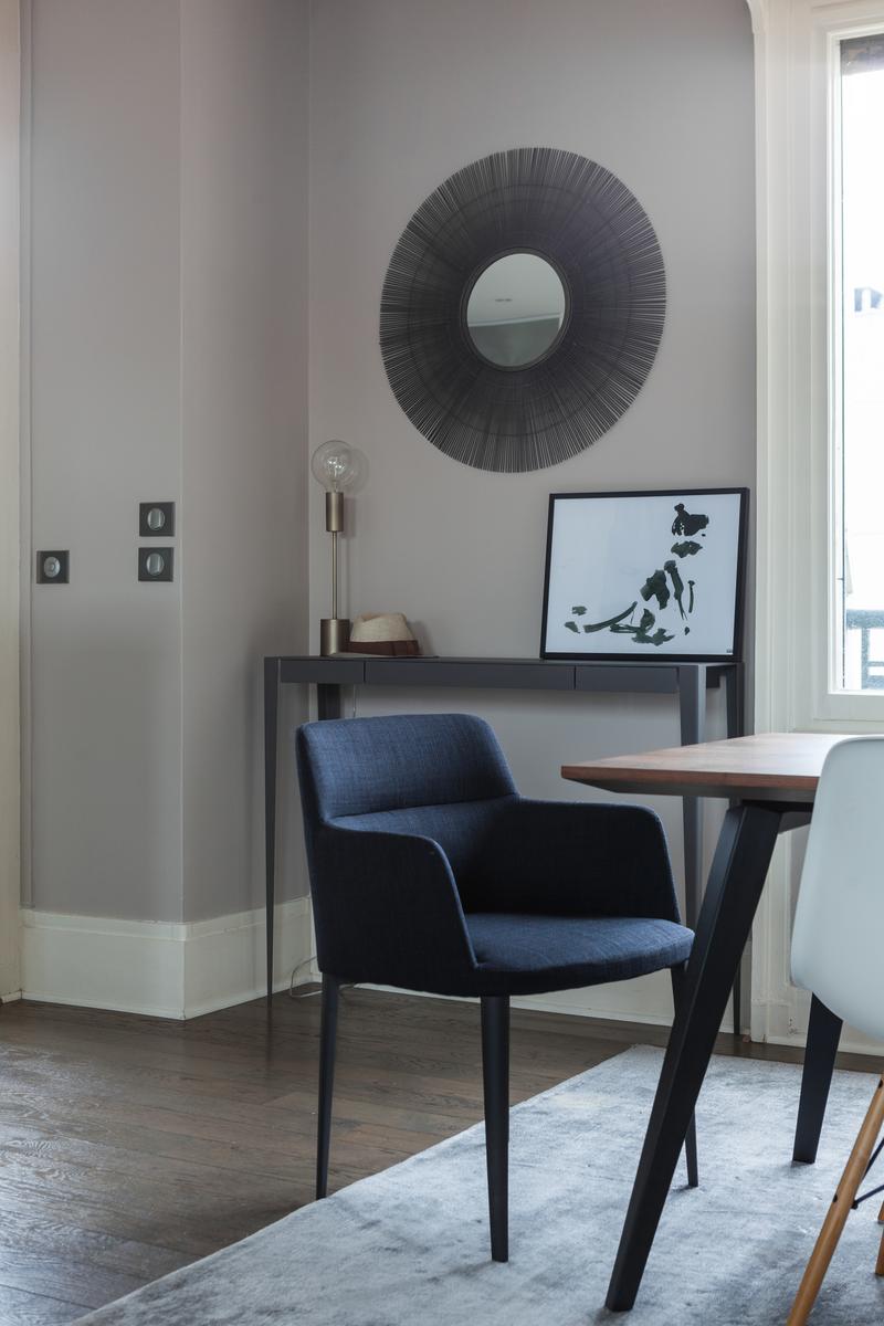 Des couleurs tamisées, un mobilier élégant et des œuvres d’art accomplies confèrent à cette maison de l’Arc de Triomphe – Champs-Élysées un sens de l’équilibre. La porte d’entrée donne sur un couloir, où il y a une salle de bain à gauche, et le salon est droit devant. D’un côté, il y a une longue table à manger, au-delà de laquelle se trouve le coin cuisine – contemporain, avec des murs inhabituels en carreaux d’argent et des armoires noires. Dans un autre coin, il y a un coin salon élégant, avec un canapé violet et un tapis argenté. Les fenêtres de cette pièce s’ouvrent sur le balcon de la rue Duret II, qui offre une vue sur la Tour Eiffel.