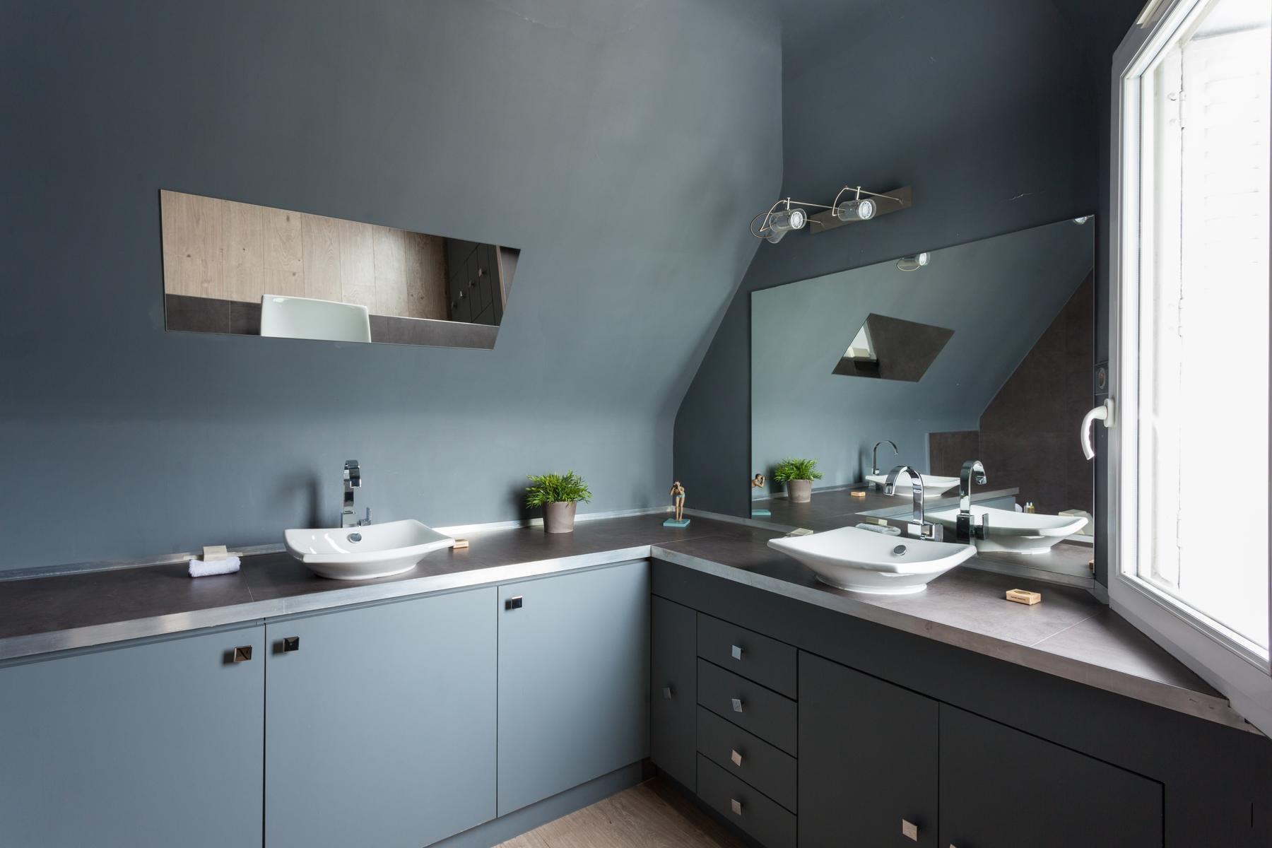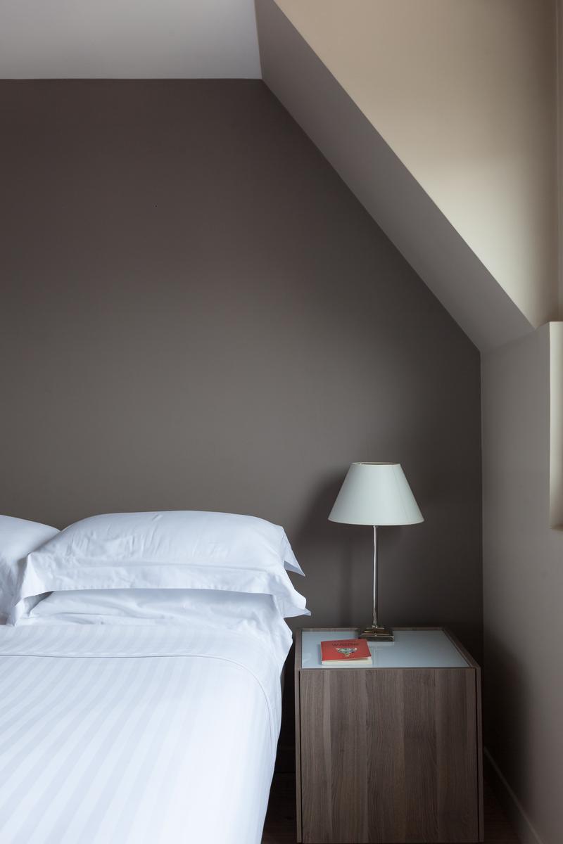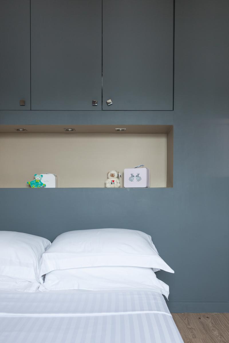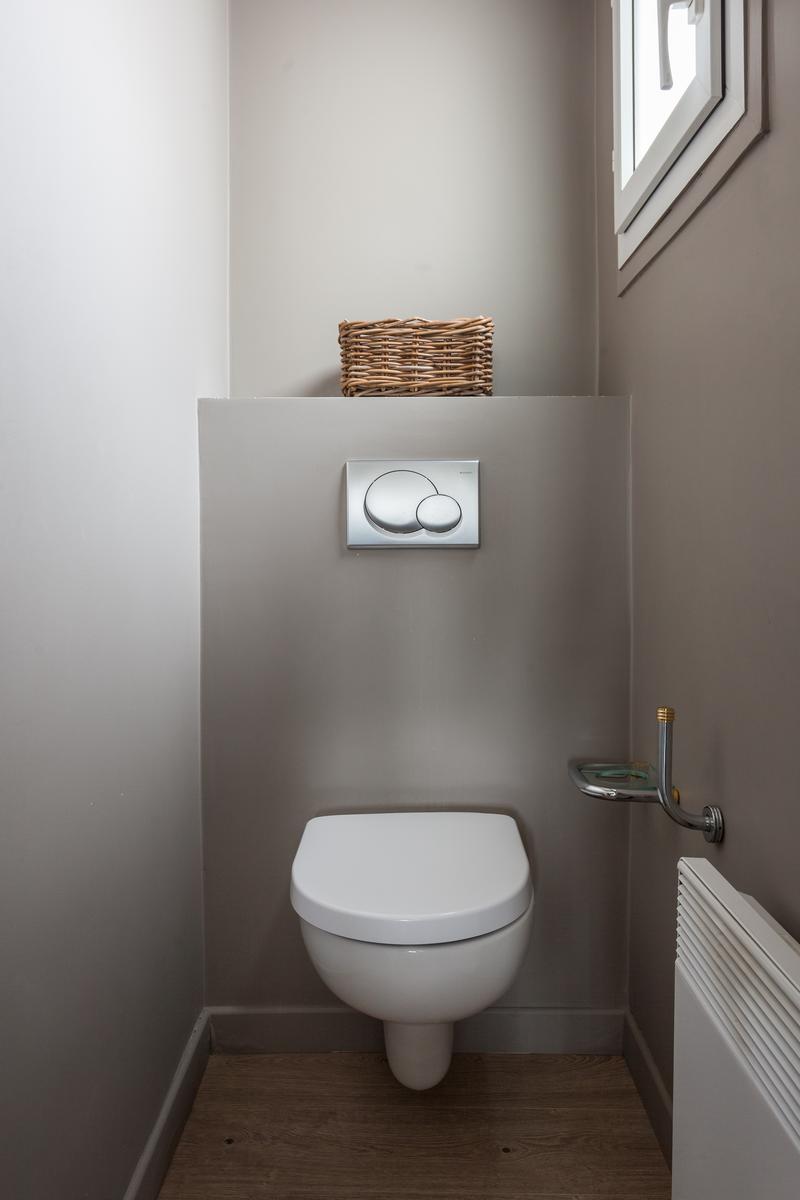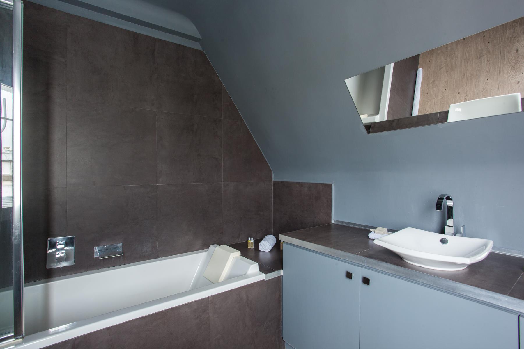Des couleurs tamisées, un mobilier élégant et des œuvres d’art accomplies confèrent à cette maison de l’Arc de Triomphe – Champs-Élysées un sens de l’équilibre. La porte d’entrée donne sur un couloir, où il y a une salle de bain à gauche, et le salon est droit devant. D’un côté, il y a une longue table à manger, au-delà de laquelle se trouve le coin cuisine – contemporain, avec des murs inhabituels en carreaux d’argent et des armoires noires. Dans un autre coin, il y a un coin salon élégant, avec un canapé violet et un tapis argenté. Les fenêtres de cette pièce s’ouvrent sur le balcon de la rue Duret II, qui offre une vue sur la Tour Eiffel.