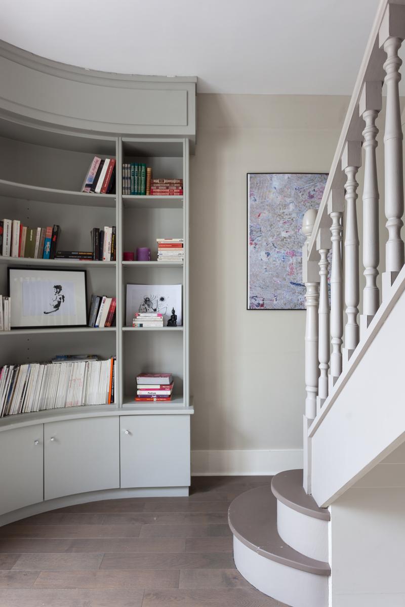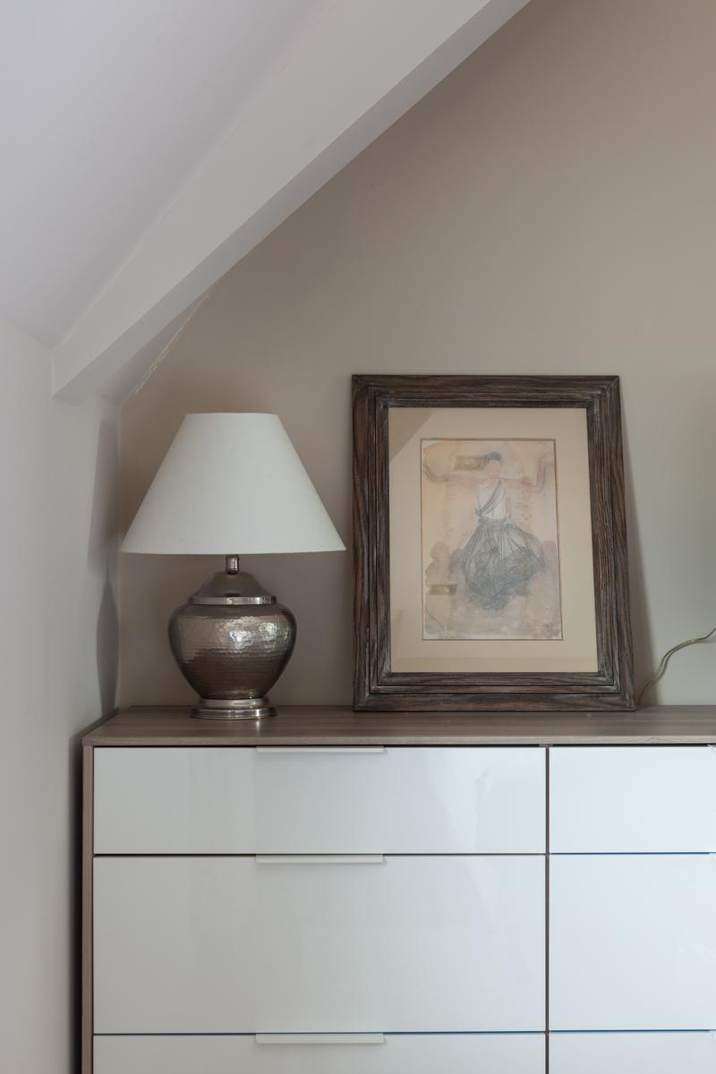 Puis pour les chambres, tournez à droite dans le hall d’entrée. Il y a ici un bureau, avec un petit bureau, plusieurs œuvres d’art et un escalier menant à l’étage supérieur. Ici, vous trouverez une salle de bain bleue et grise, une salle de toilette et deux chambres à coucher discrètes.