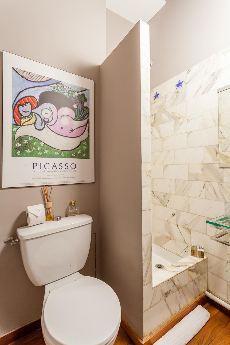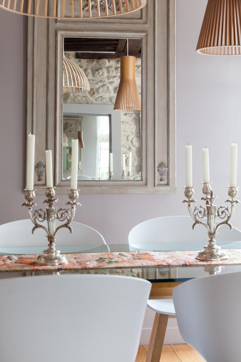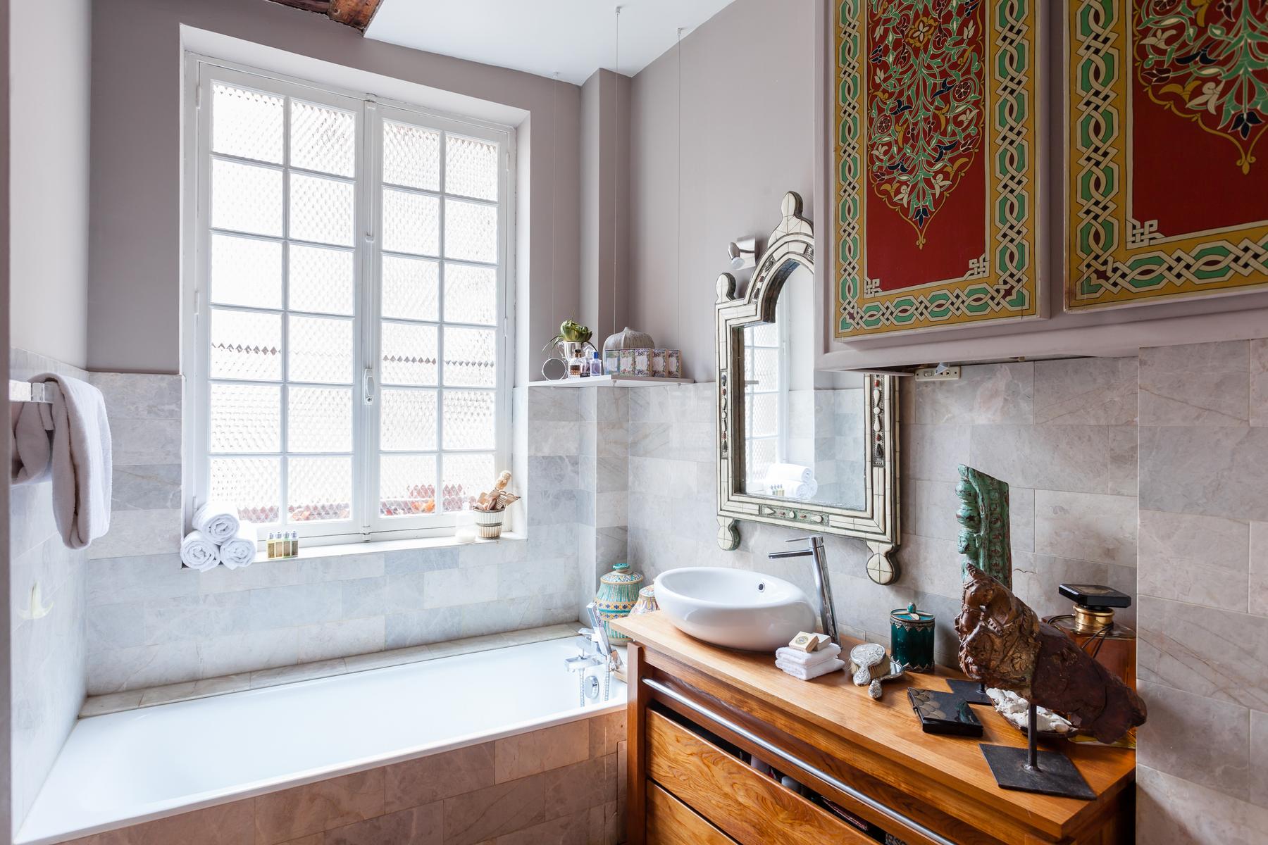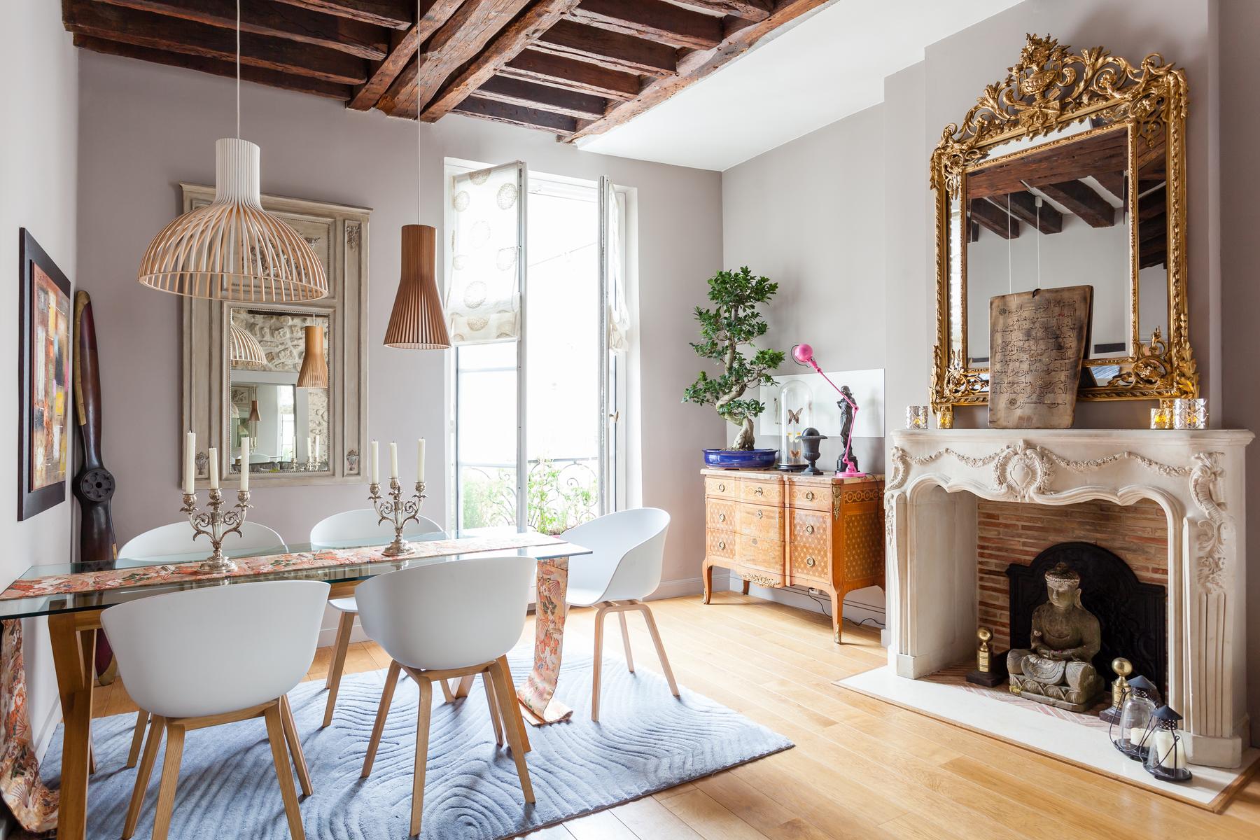 Avec ses poutres apparentes, ses meubles anciens du XIXe siècle et son miroir doré, le salon de la rue Francaise est soigneusement conservé – et vous y entrerez directement par la porte d’entrée de l’appartement. Ici, les portes françaises s’élèvent à partir de planchers décapés, et un mur sculpté dans la pierre contraste avec les chandeliers d’argent sur la table à manger pour cinq personnes. Un Bouddha s’installe dans la cheminée, et les surfaces sont éclairées par des bonsaïs, des orchidées délicates et des papillons montés.