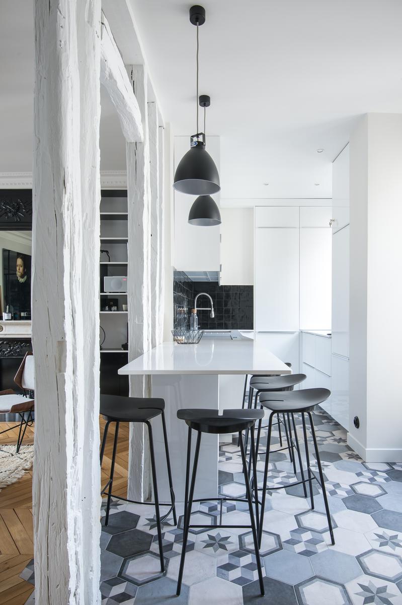 Une palette de couleurs monochromes, une utilisation intelligente de l’espace et des œuvres d’art qui suscitent la réflexion – Rue Gît-le-Cœur II est certainement distinctive. En tournant à droite dans le long hall d’entrée, vous arriverez en premier à la cuisine. Il dispose d’armoires blanches brillantes, de carreaux de sol à motifs et d’un bar pour le petit-déjeuner qui donne sur le salon attenant. Cette chambre est décontractée, avec un canapé long et un tapis duveteux, ainsi que deux fauteuils design. Une porte vitrée le sépare de la salle à manger, où un canapé-lit et une table de salle à manger en bois se trouvent sous une œuvre d’art en noir et blanc.