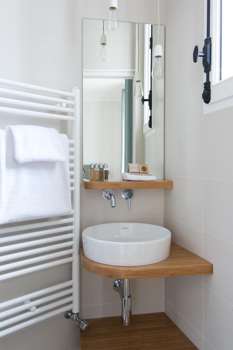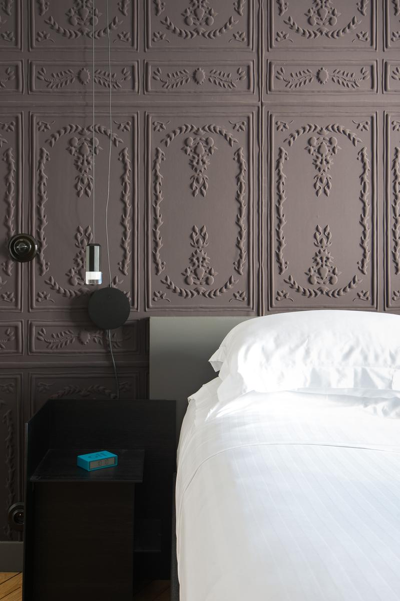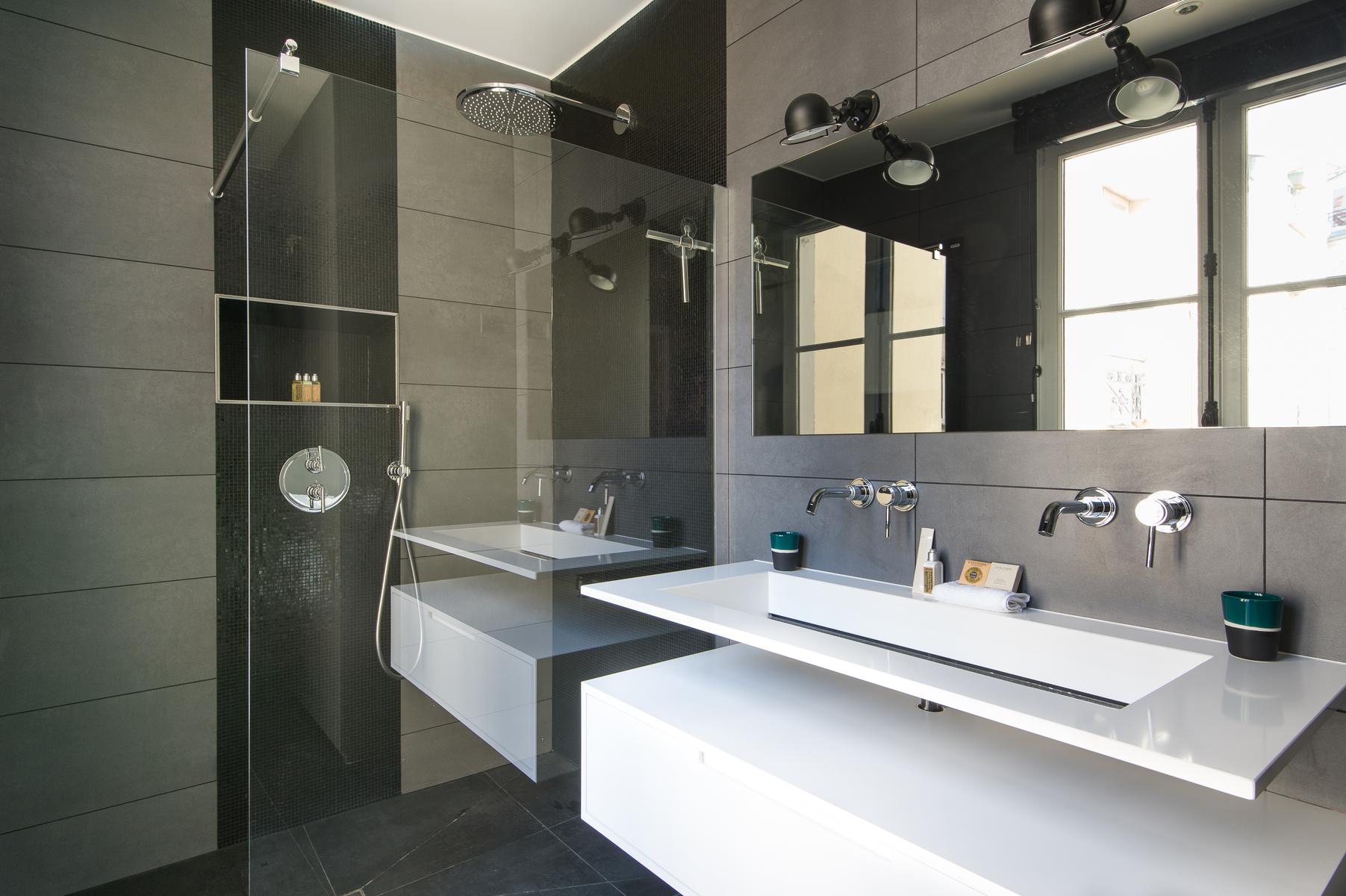Ensuite, à gauche de l’entrée, juste après une salle de toilette, se trouve la deuxième chambre à coucher (décorée dans des couleurs plus douces, avec une salle de bain attenante). Et à côté, vous trouverez la chambre principale. Avec son papier peint en trompe l’œil, son lit king size et sa salle de bain contemporaine, il est à la fois chic et accueillant.