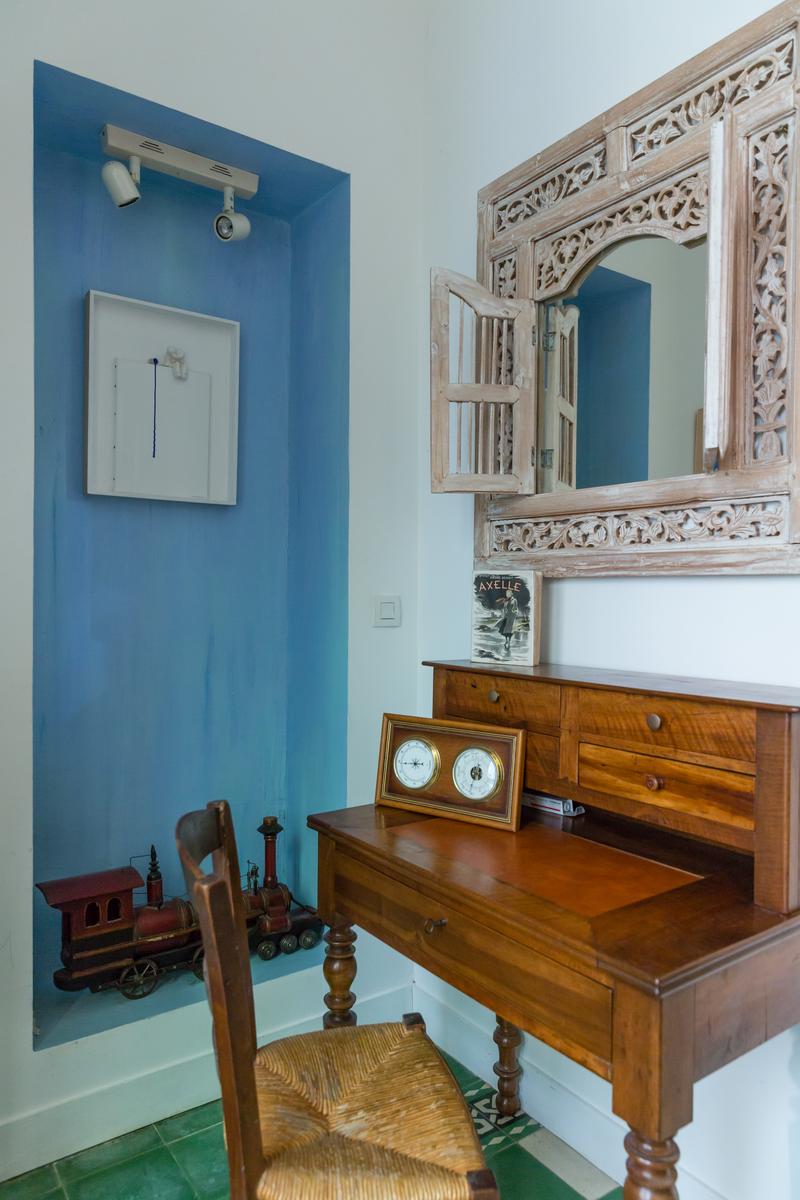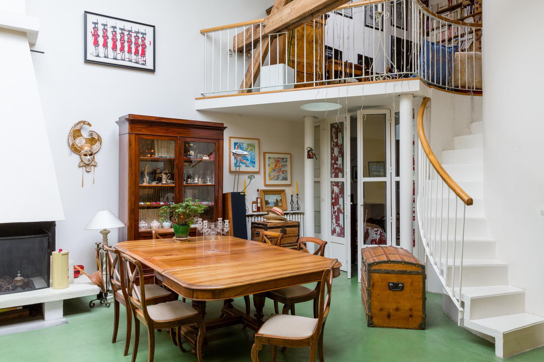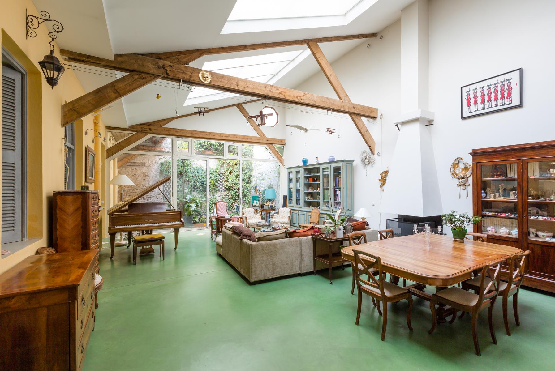 Le passé de la rue Godefroy Cavaignac est varié – c’était autrefois une fabrique de lustres à l’époque industrielle de la Bastille, et plus tard, une église évangélique a rassemblé sa congrégation dans les pièces hautes de la maison. Maintenant il est peint avec des tons vifs et il y a des pièces d’antiquités flamboyantes, y compris une immense table à manger et un joli bureau. Le salon est extraordinairement bien conçu – vous trouverez des fauteuils bien garnis et un piano à queue sous les poutres du grenier. Et l’escalier courbe mène à une mezzanine bordée de tomes.