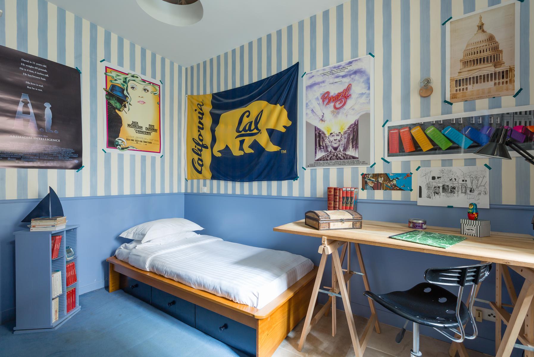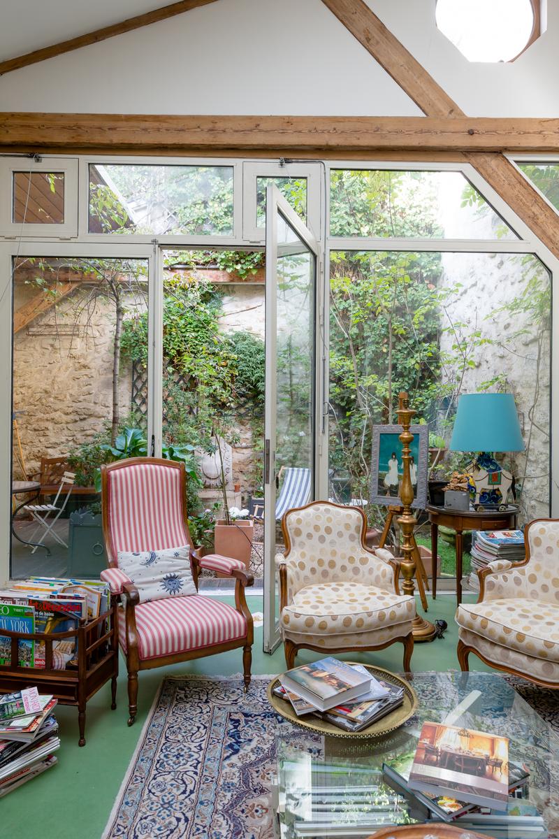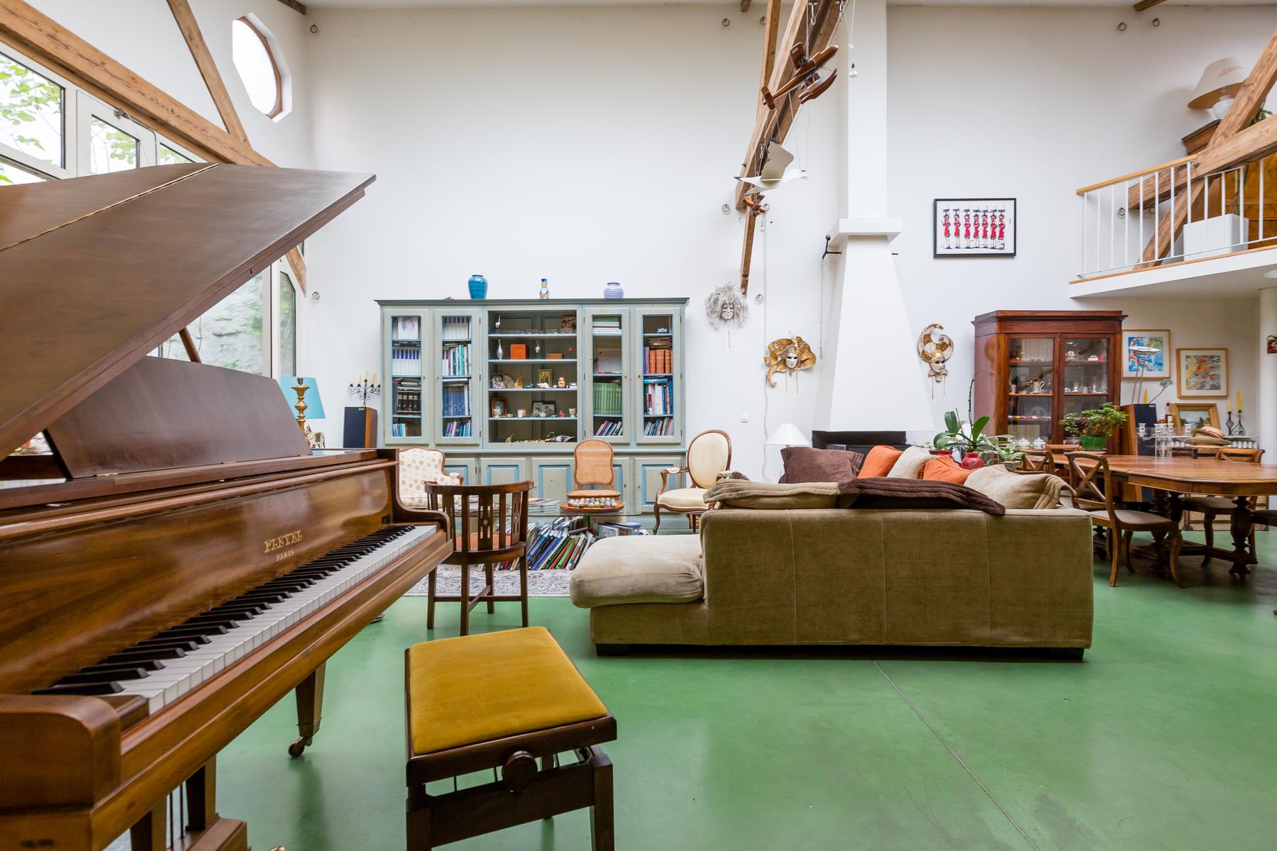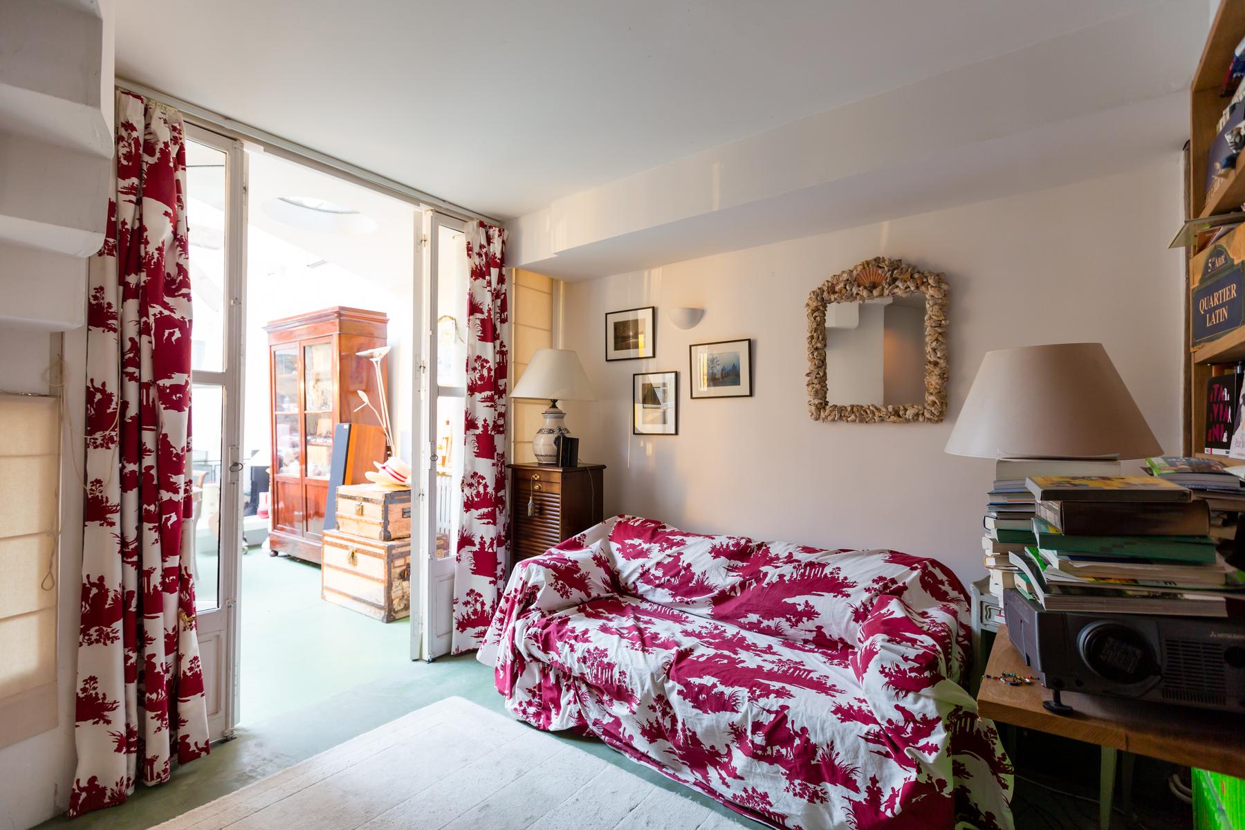 Le passé de la rue Godefroy Cavaignac est varié – c’était autrefois une fabrique de lustres à l’époque industrielle de la Bastille, et plus tard, une église évangélique a rassemblé sa congrégation dans les pièces hautes de la maison. Maintenant il est peint avec des tons vifs et il y a des pièces d’antiquités flamboyantes, y compris une immense table à manger et un joli bureau. Le salon est extraordinairement bien conçu – vous trouverez des fauteuils bien garnis et un piano à queue sous les poutres du grenier. Et l’escalier courbe mène à une mezzanine bordée de tomes.