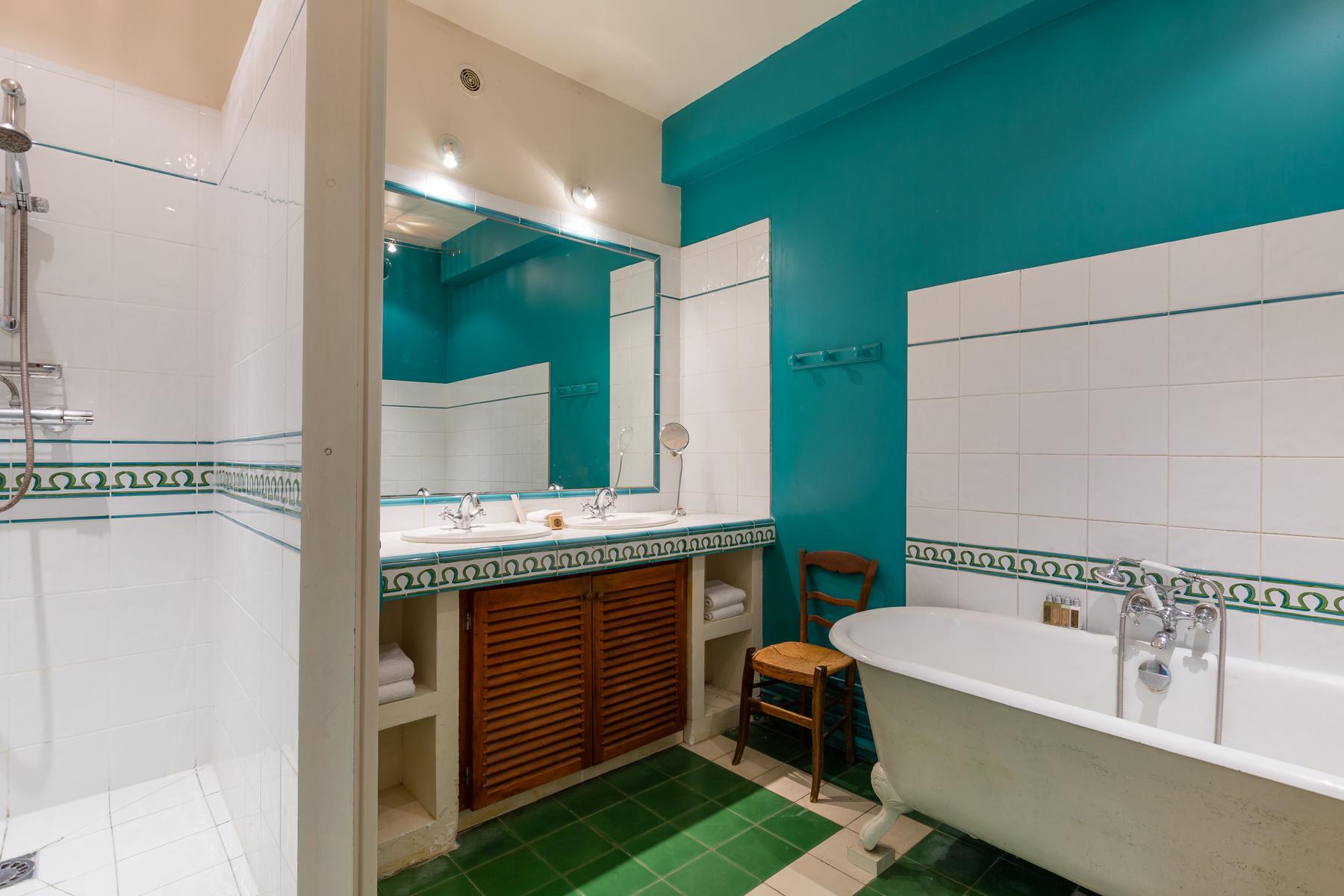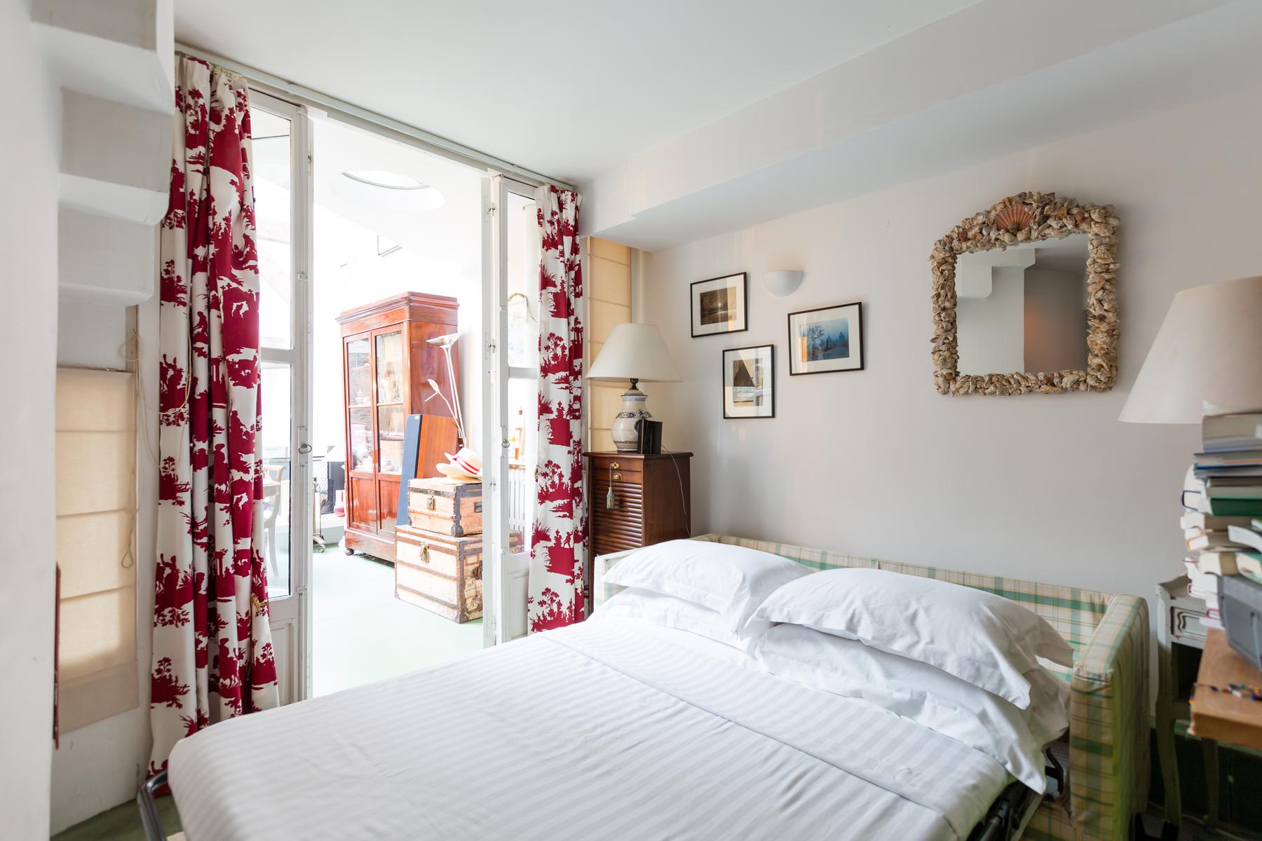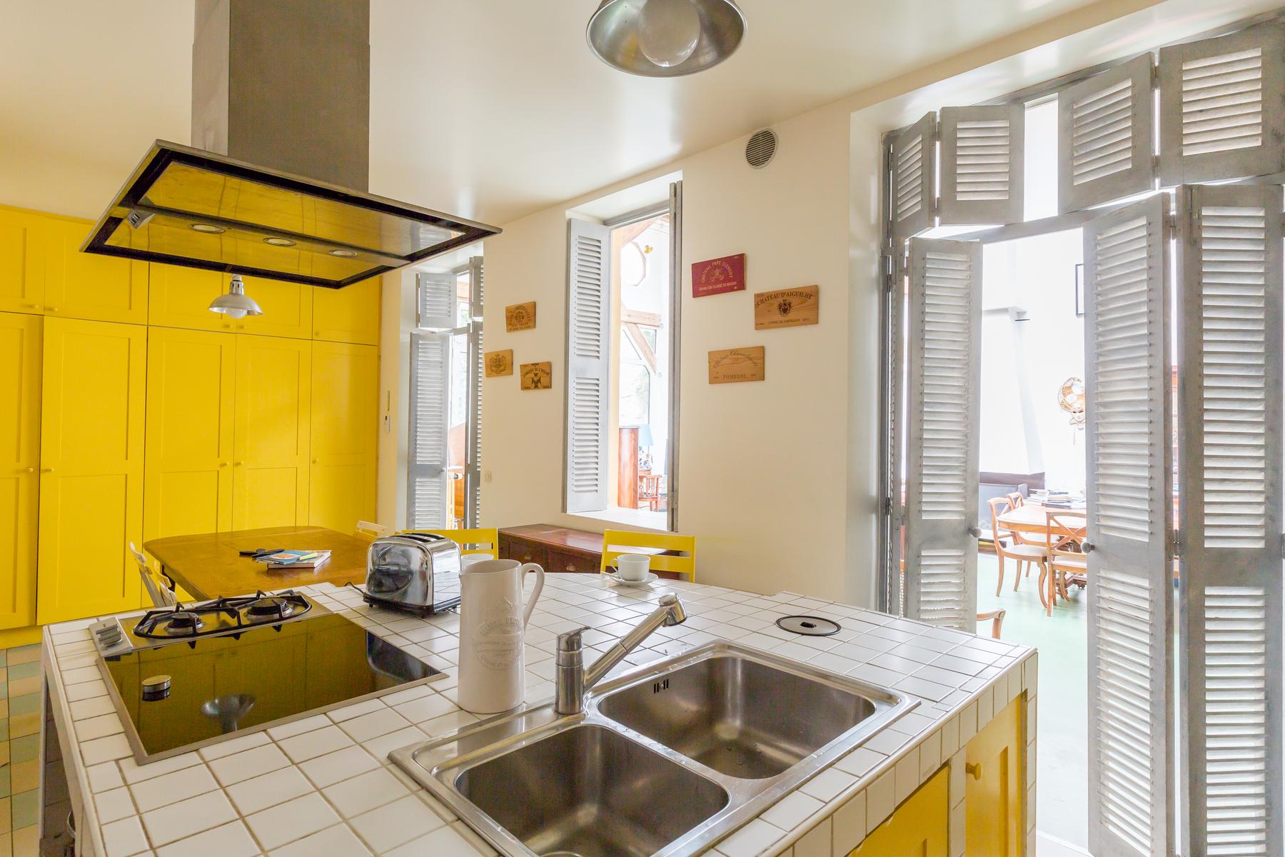 A travers les volets rustiques en bois, vous trouverez la cuisine – les armoires jaune vif et les carreaux blancs sont un mélange rafraîchissant, et les chaises de la table à manger sont brossées avec des teintes ensoleillées. Suivez le couloir pour trois des quatre chambres à coucher, y compris deux chambres simples et une chambre des maîtres inhabituelle. Ici, le sol est carrelage vert et blanc, les portes s’ouvrent sur le pont, et il y a une salle de bains teintée sarcelle cachée derrière les volets. La quatrième chambre à coucher de couleur orange et confortable remplit le premier étage. Les rues animées de la Bastille sont bordées de bars à la mode et de brasseries pittoresques.