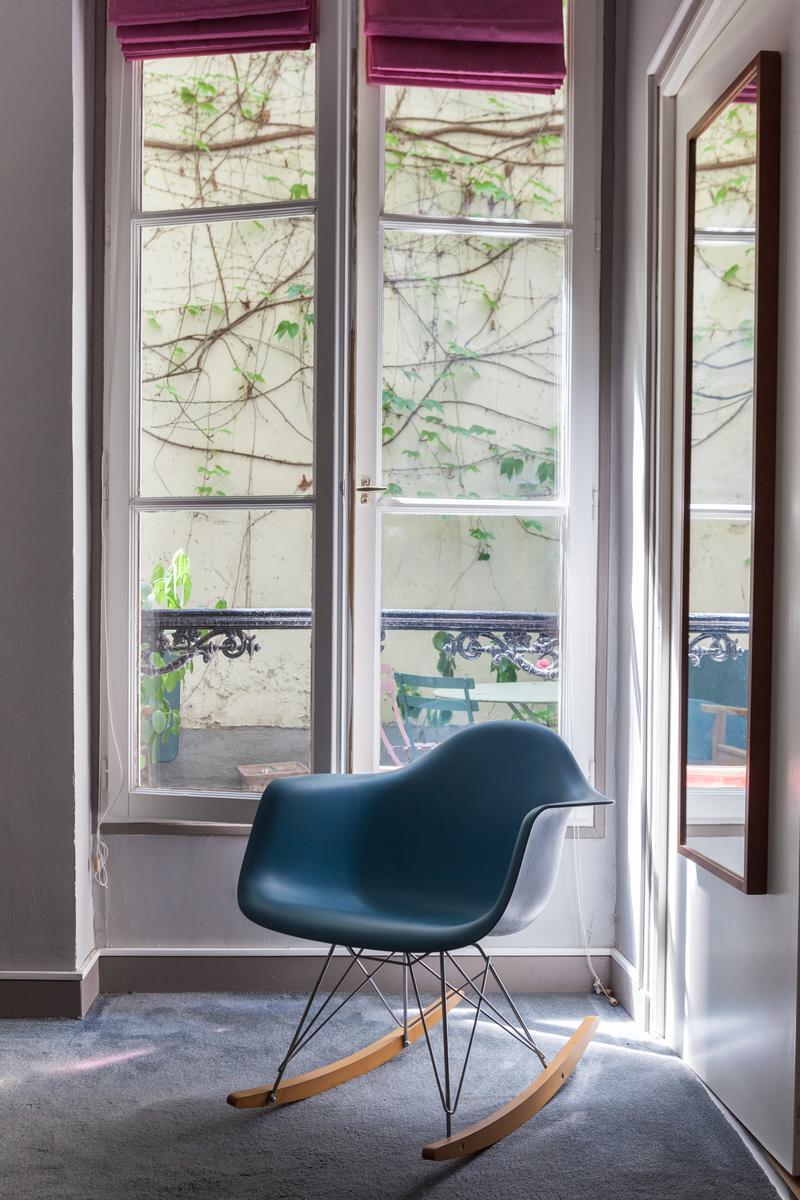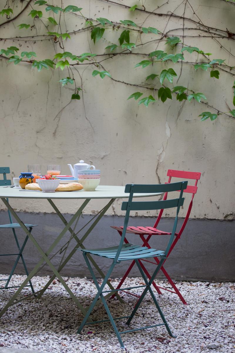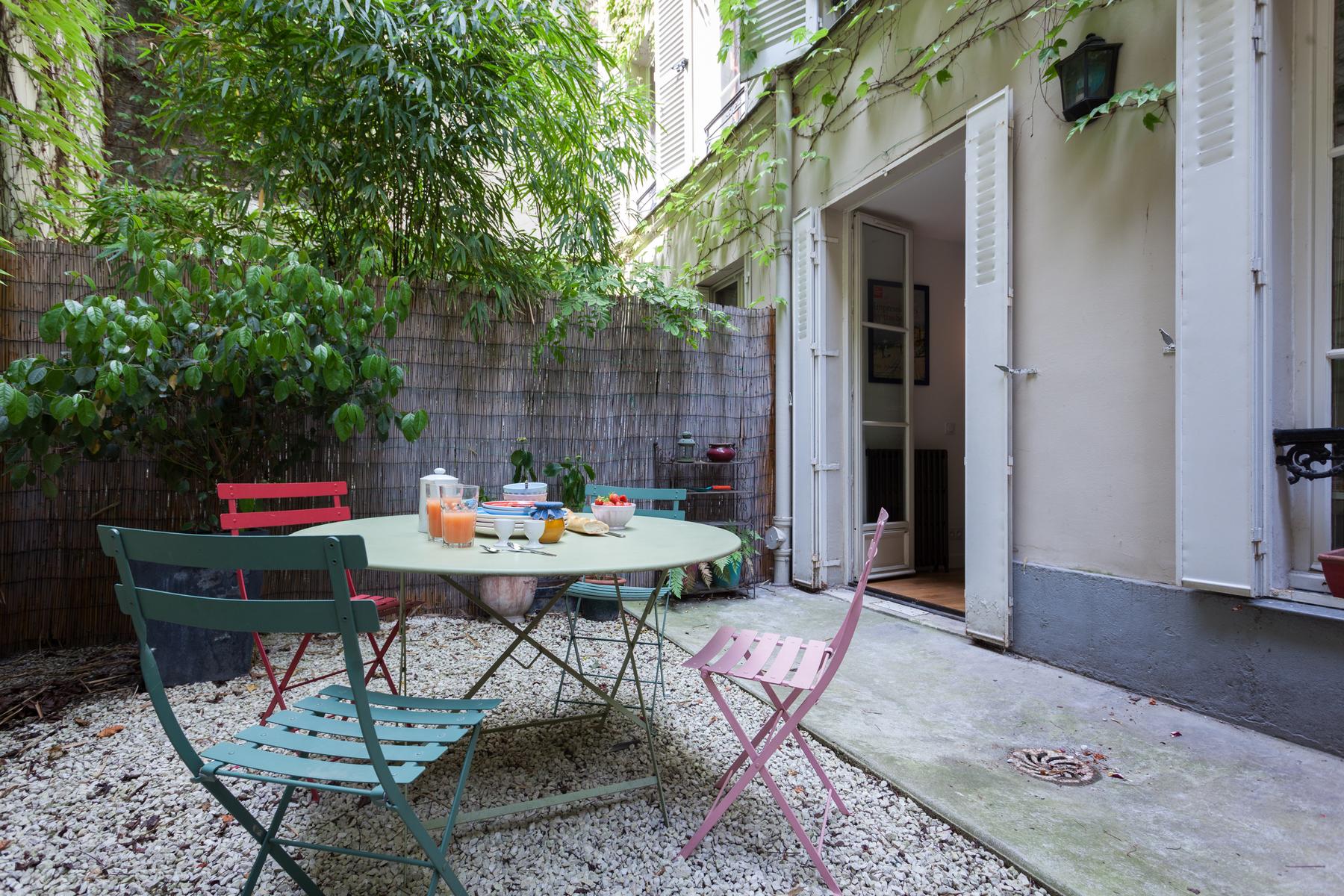 Une douce surprise, la terrasse est juste à travers les portes françaises dans le salon. Il y a ici une table et des chaises pastel, où vous pourrez vous détendre loin de l’agitation de cette partie centrale de Paris.