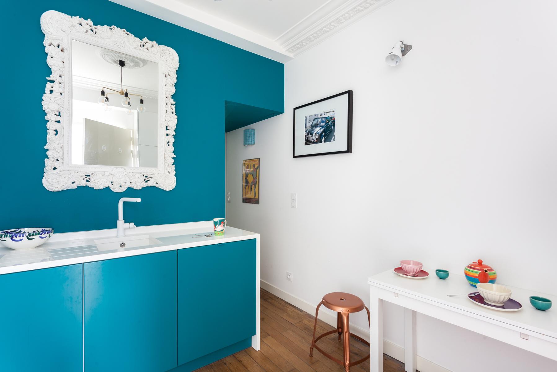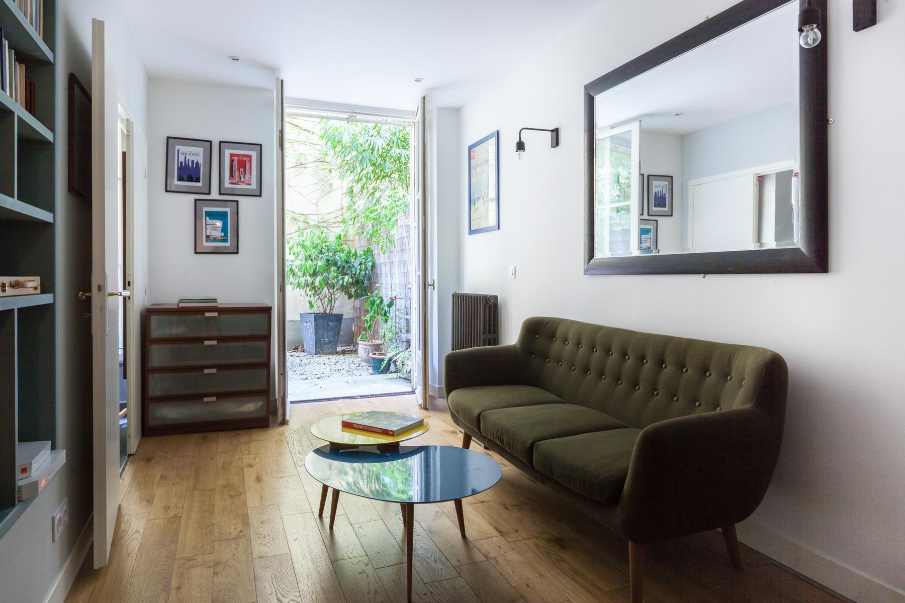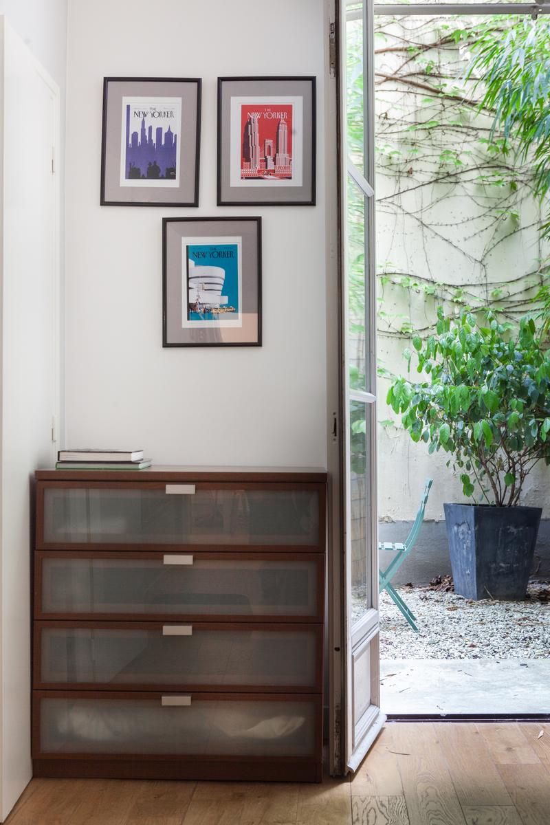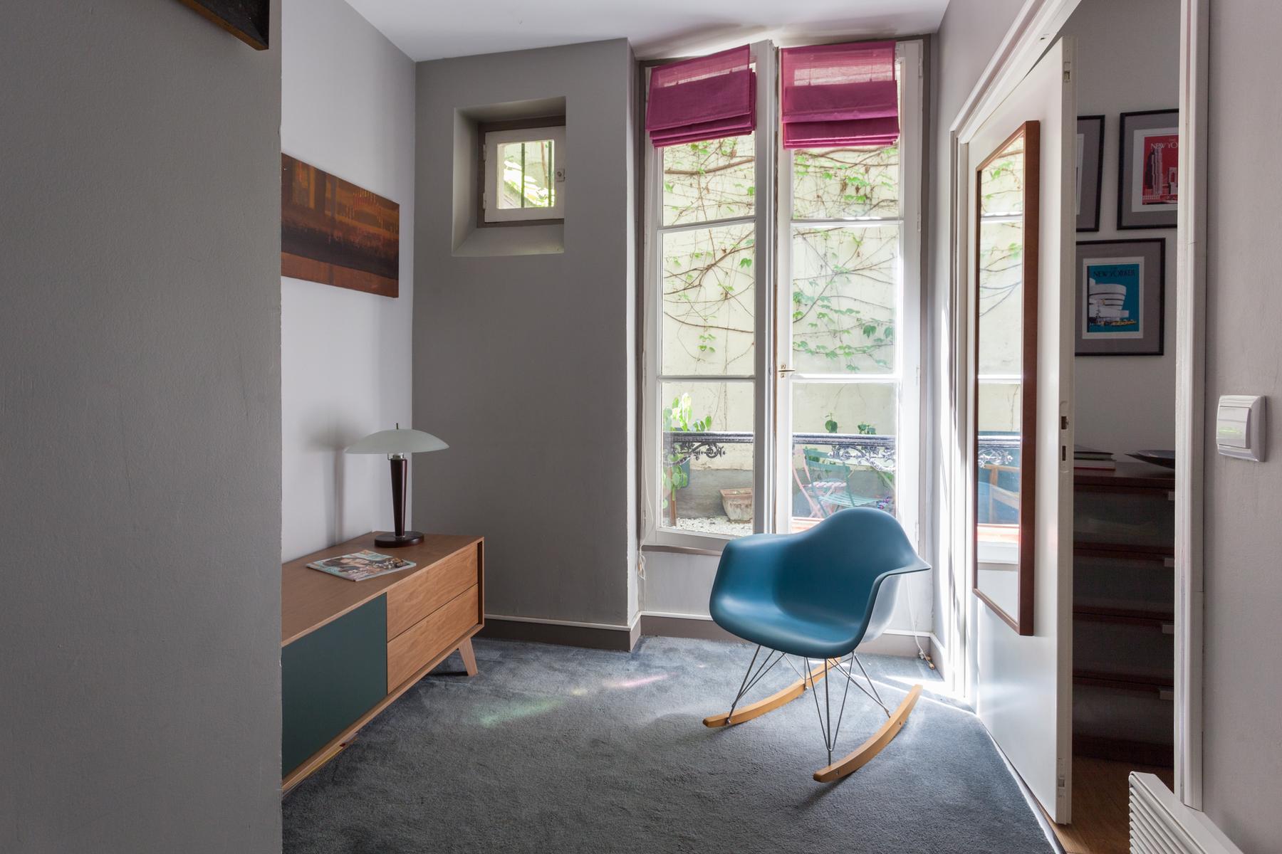 Sur une rue classique de Saint-Germain-des-Prés, vous trouverez la porte d’entrée du rez-de-chaussée de la rue Jean Bart. Vous entrez dans la cuisine blanche, où un mur turquoise vif et un ensemble de tabourets en cuivre brillant donnent des éclats de couleur. Au-delà, il y a un couloir court, où la salle de bain soignée (avec des carreaux de sol en damier de caractère) se trouve sur la gauche. Ensuite se trouve le salon, un espace décontracté avec un canapé et un fauteuil, des étagères bien garnies et une pochette d’impressions d’art colorées. Plus détendue encore est la chambre principale, qui se trouve sur la gauche. Il est simplement décoré dans des tons doux, et a une jolie vue sur la terrasse.