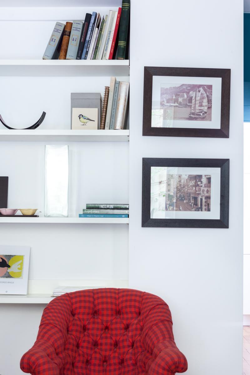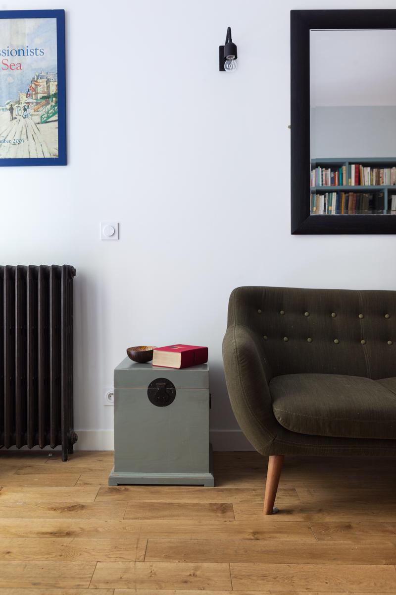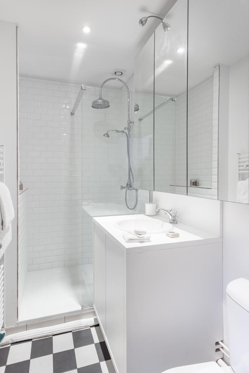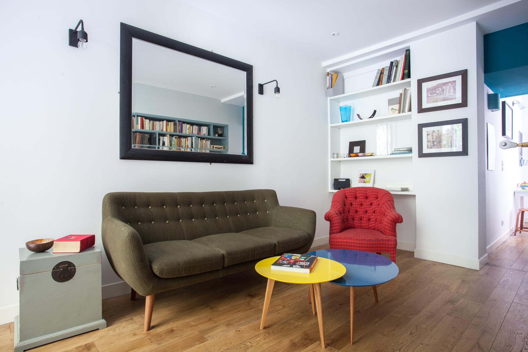 Sur une rue classique de Saint-Germain-des-Prés, vous trouverez la porte d’entrée du rez-de-chaussée de la rue Jean Bart. Vous entrez dans la cuisine blanche, où un mur turquoise vif et un ensemble de tabourets en cuivre brillant donnent des éclats de couleur. Au-delà, il y a un couloir court, où la salle de bain soignée (avec des carreaux de sol en damier de caractère) se trouve sur la gauche. Ensuite se trouve le salon, un espace décontracté avec un canapé et un fauteuil, des étagères bien garnies et une pochette d’impressions d’art colorées. Plus détendue encore est la chambre principale, qui se trouve sur la gauche. Il est simplement décoré dans des tons doux, et a une jolie vue sur la terrasse.