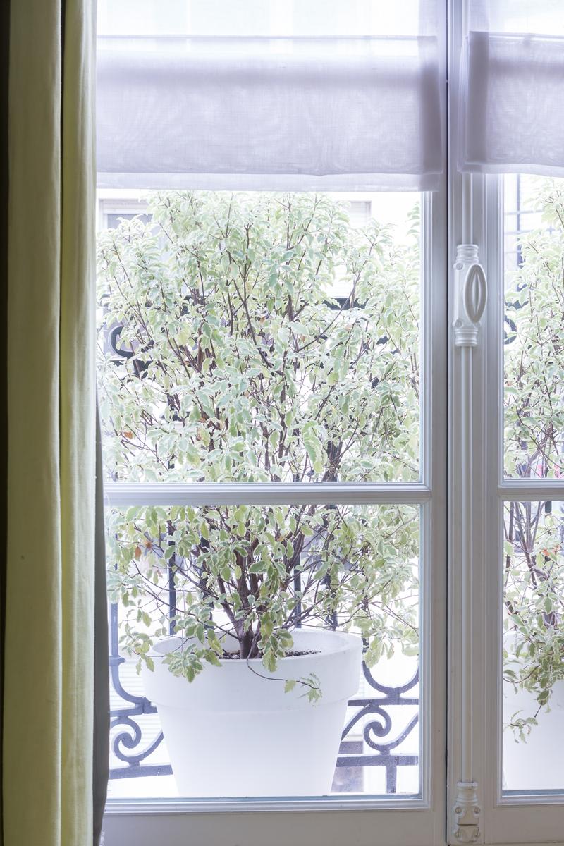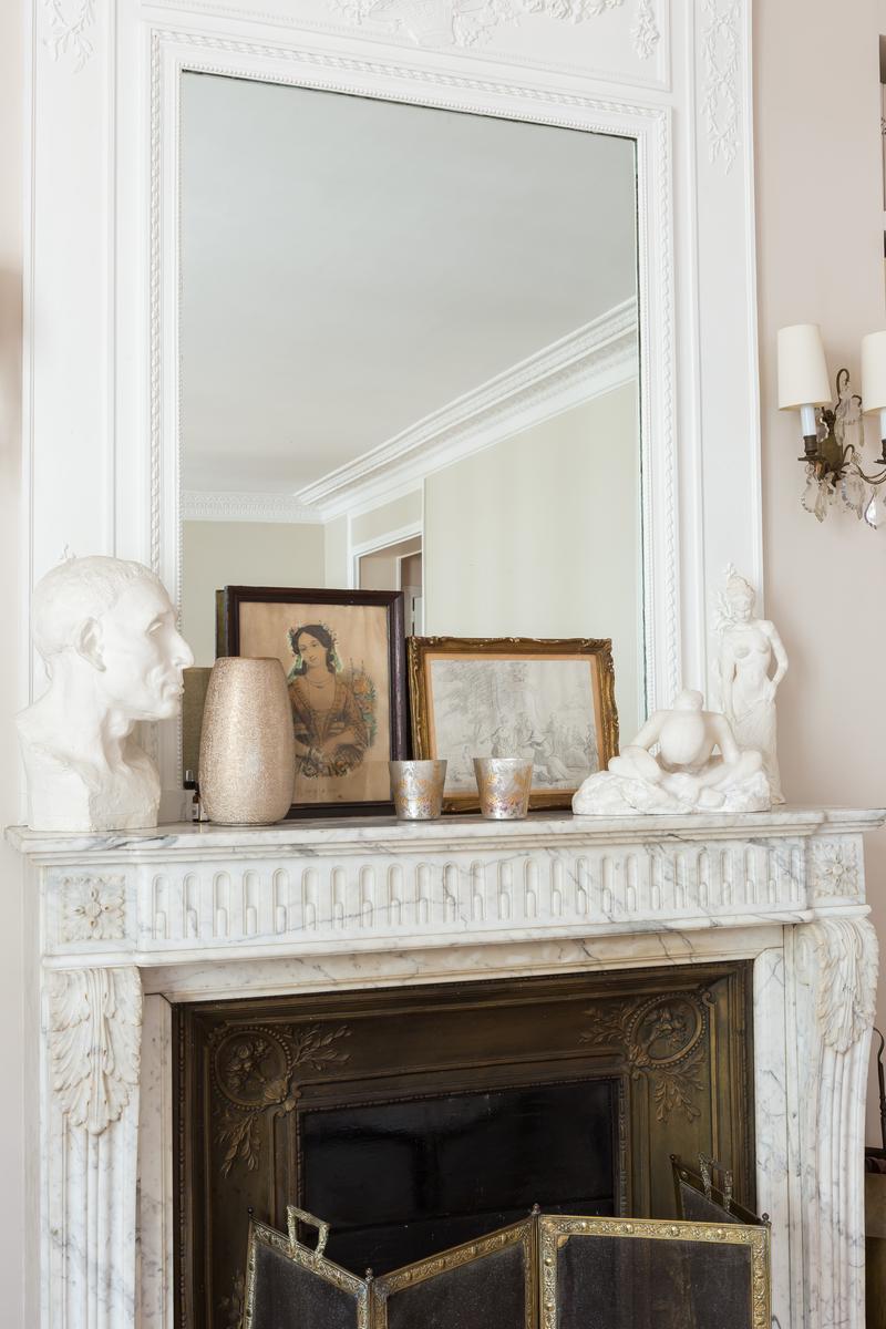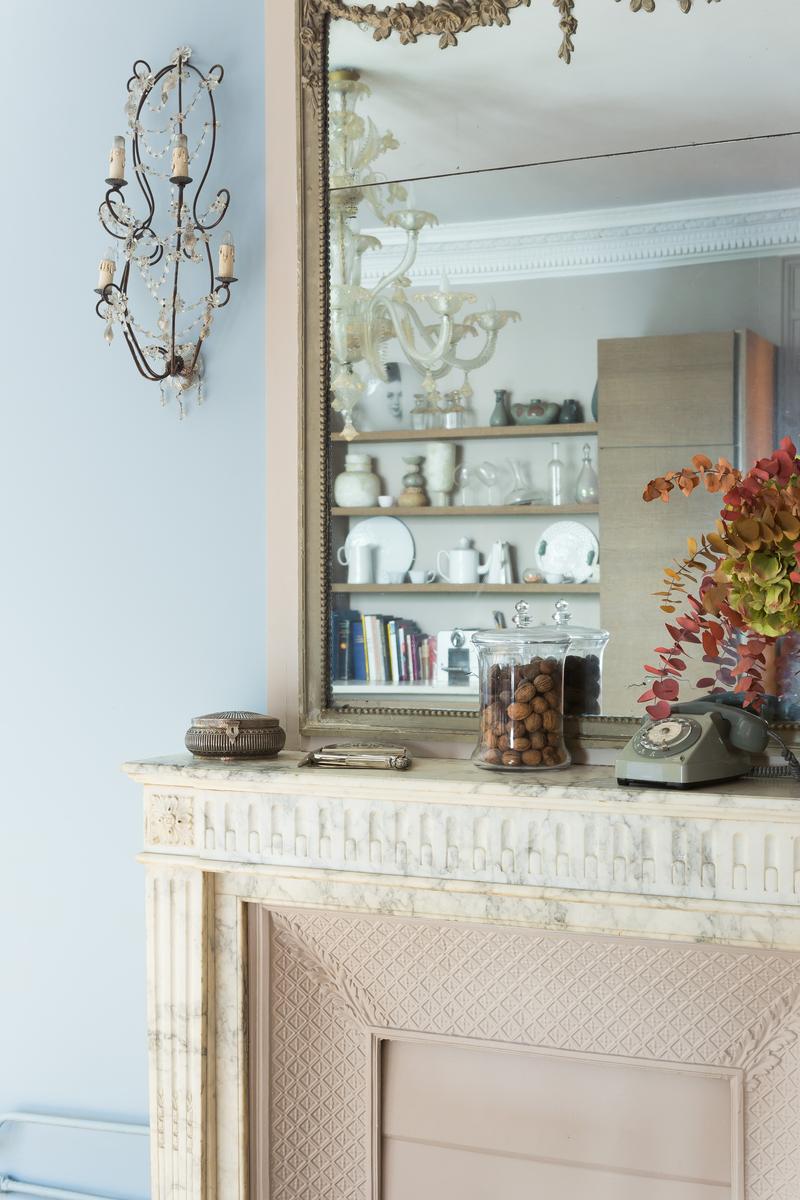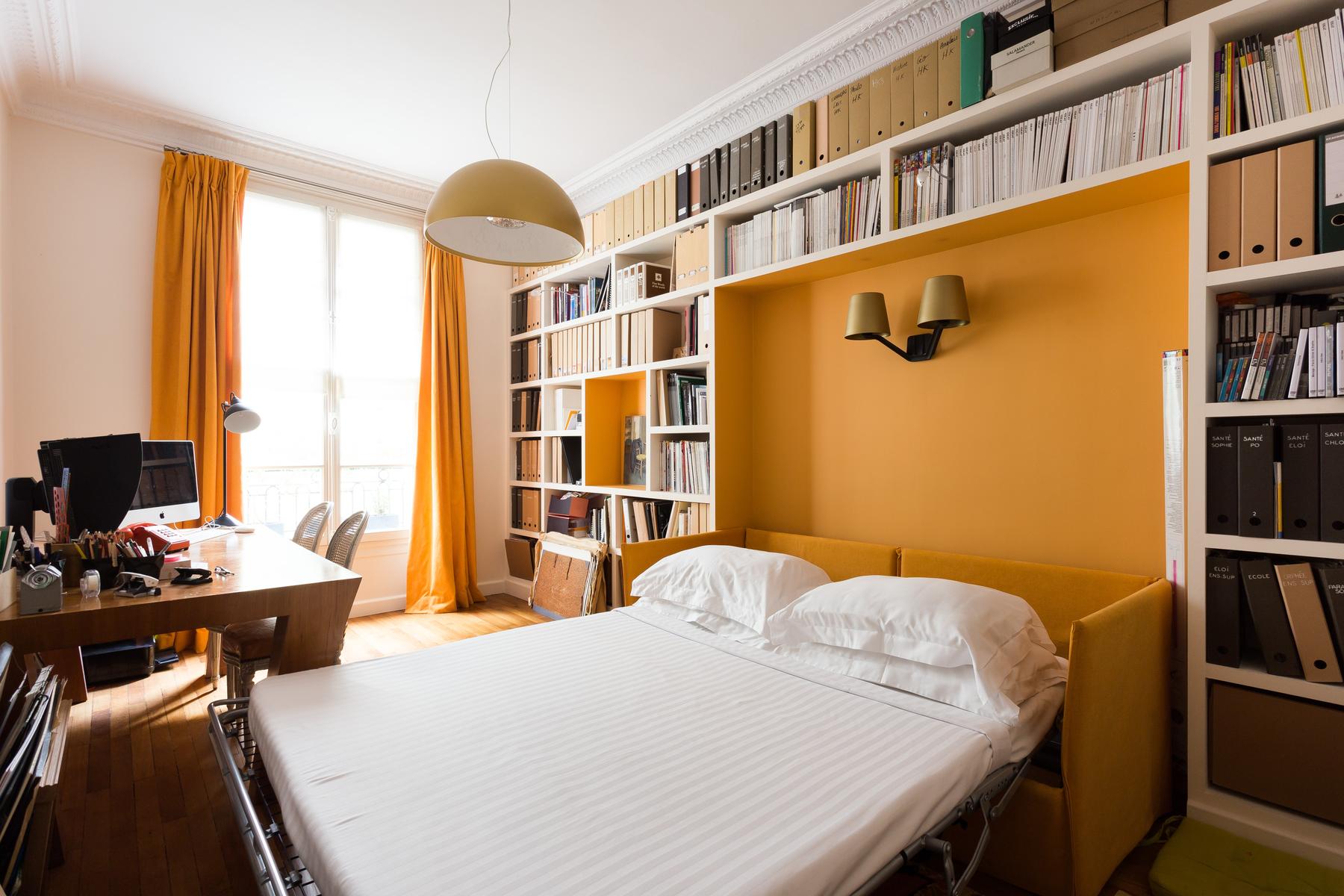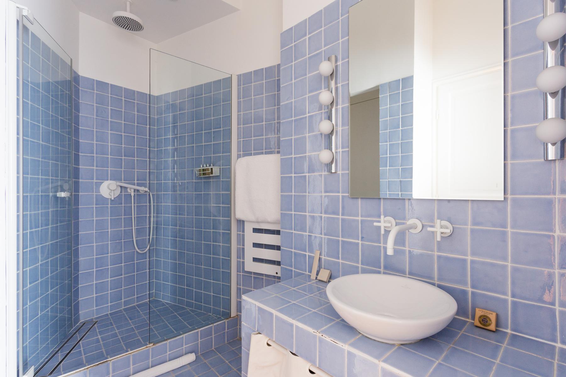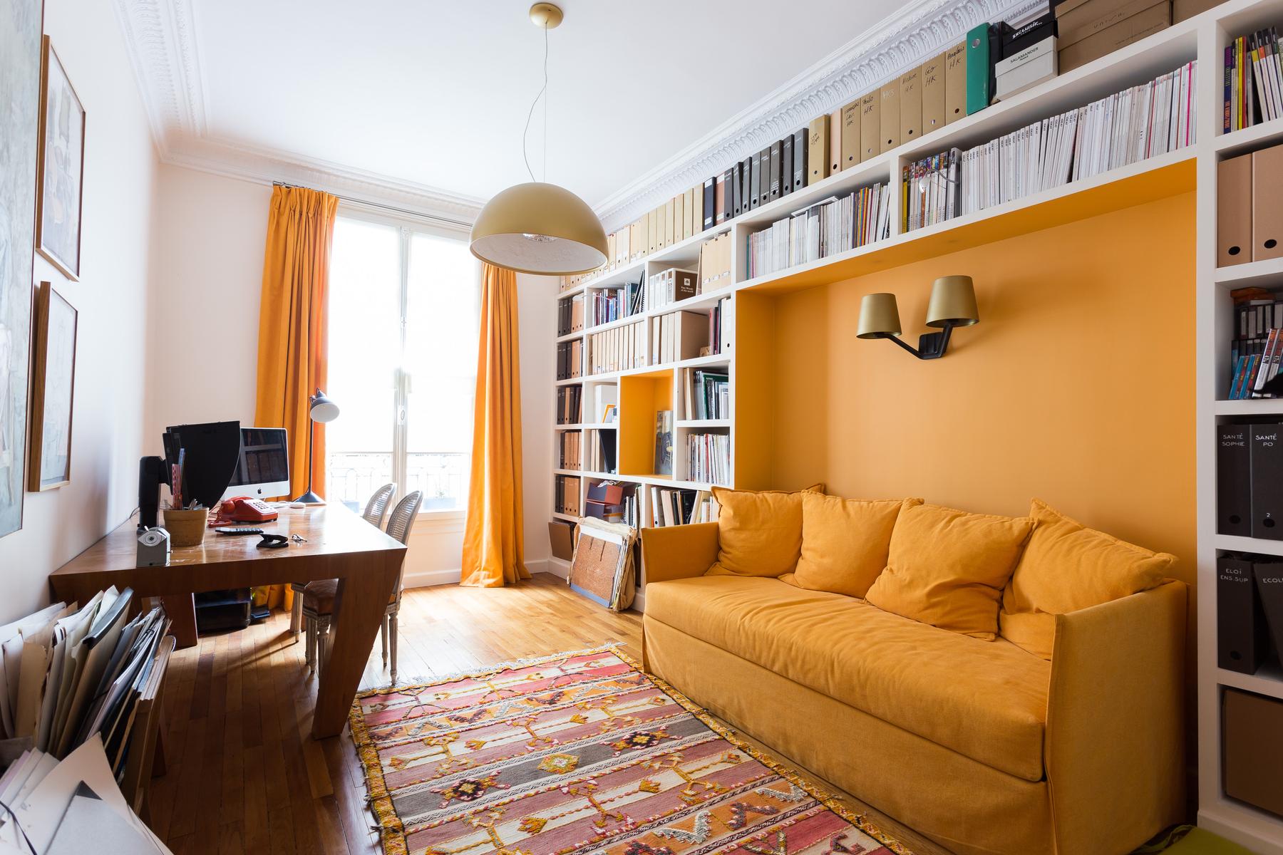 Au troisième étage, après une longue journée d’exploration des rues de Paris, c’est l’appartement où vous voudrez rentrer chez vous. Juste à côté de l’entrée, le parquet du salon est recouvert d’un épais tapis blanc et d’un piano à queue resplendissant à côté d’une paire de bibliothèques. De l’autre côté du hall se trouve la cuisine ouverte et la salle à manger, peinte en bleu poudre avec une collection Le Creuset assortie. Sous un chandelier en verre de Murano, la table à manger a dix places assises et a été fabriquée à Bali, à partir du tronc d’un seul arbre.