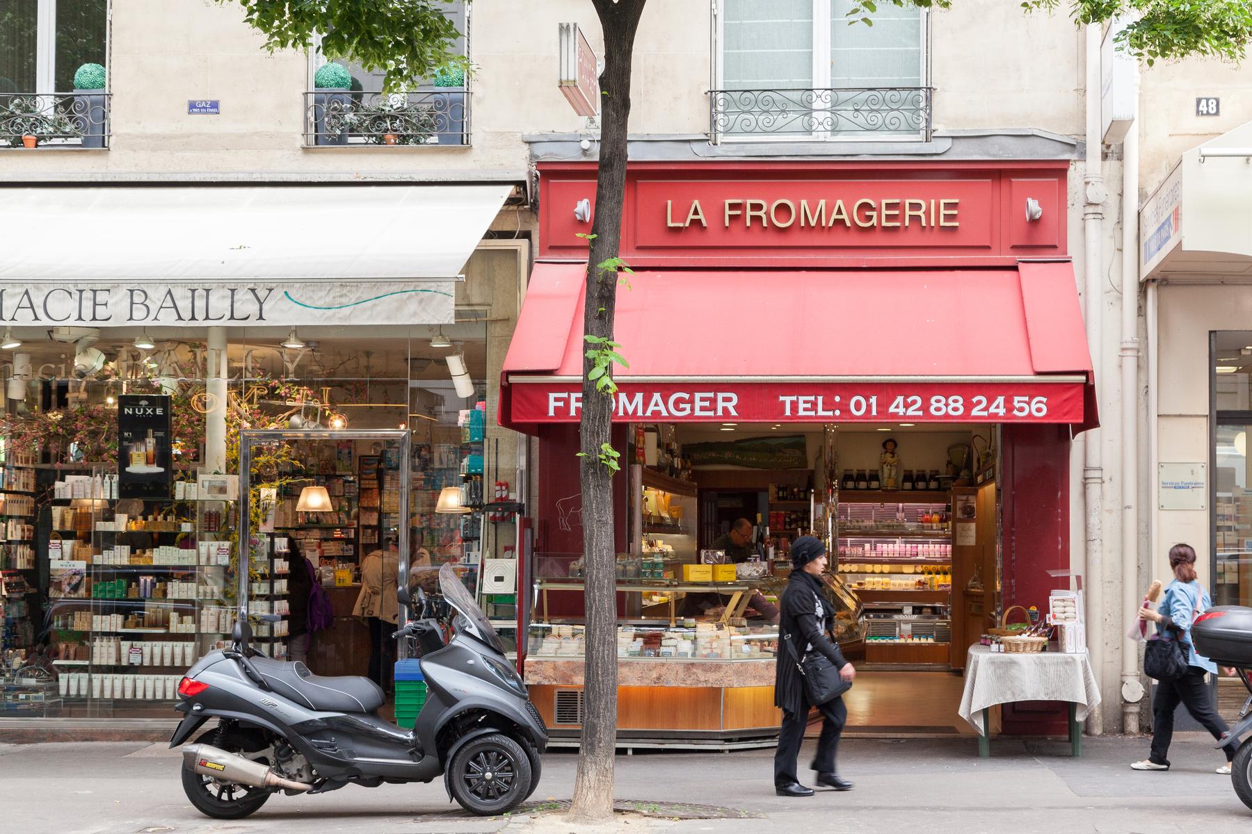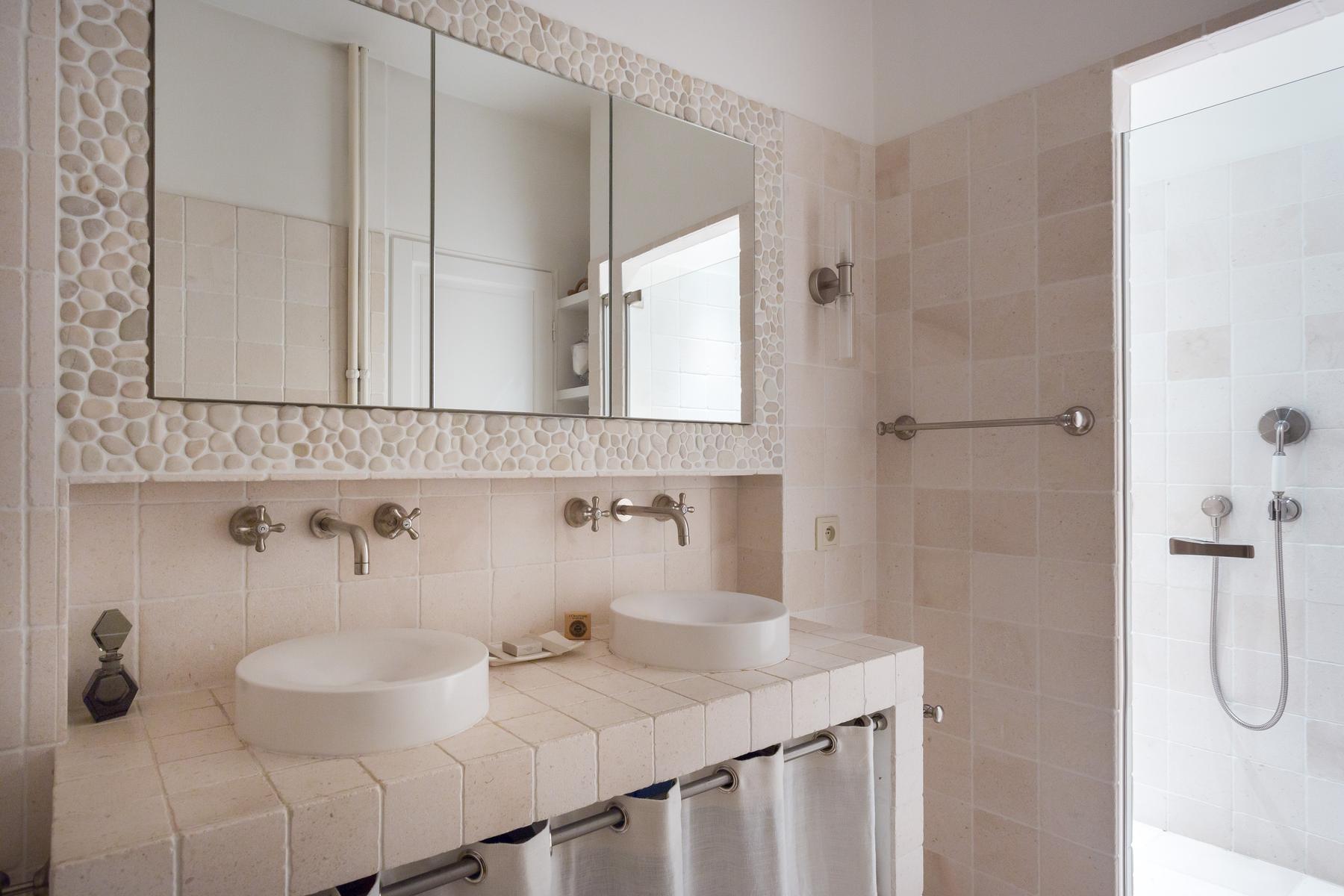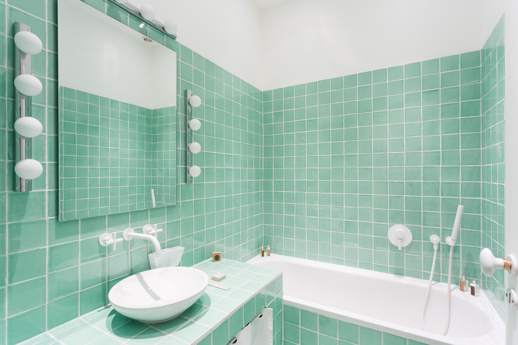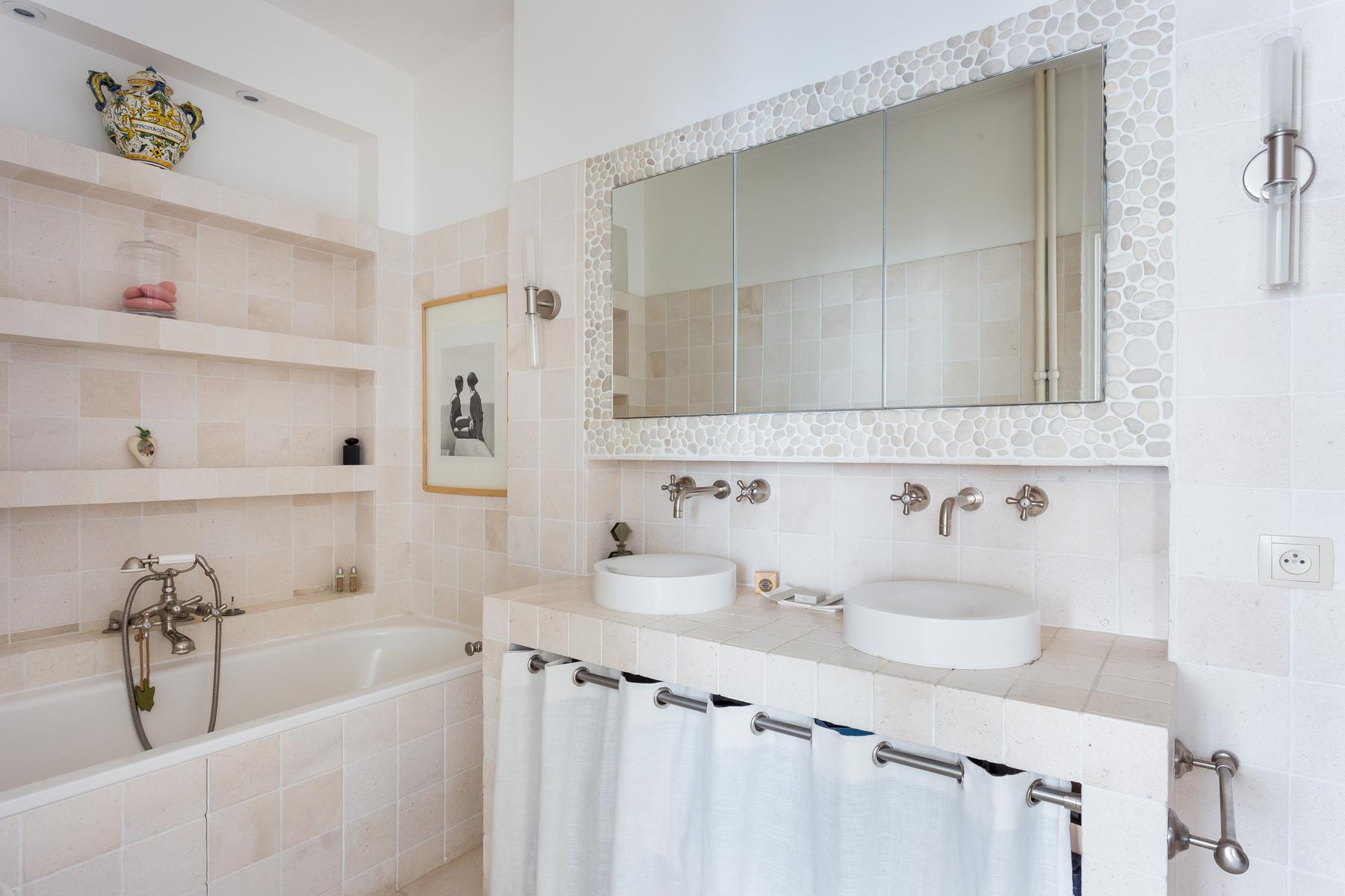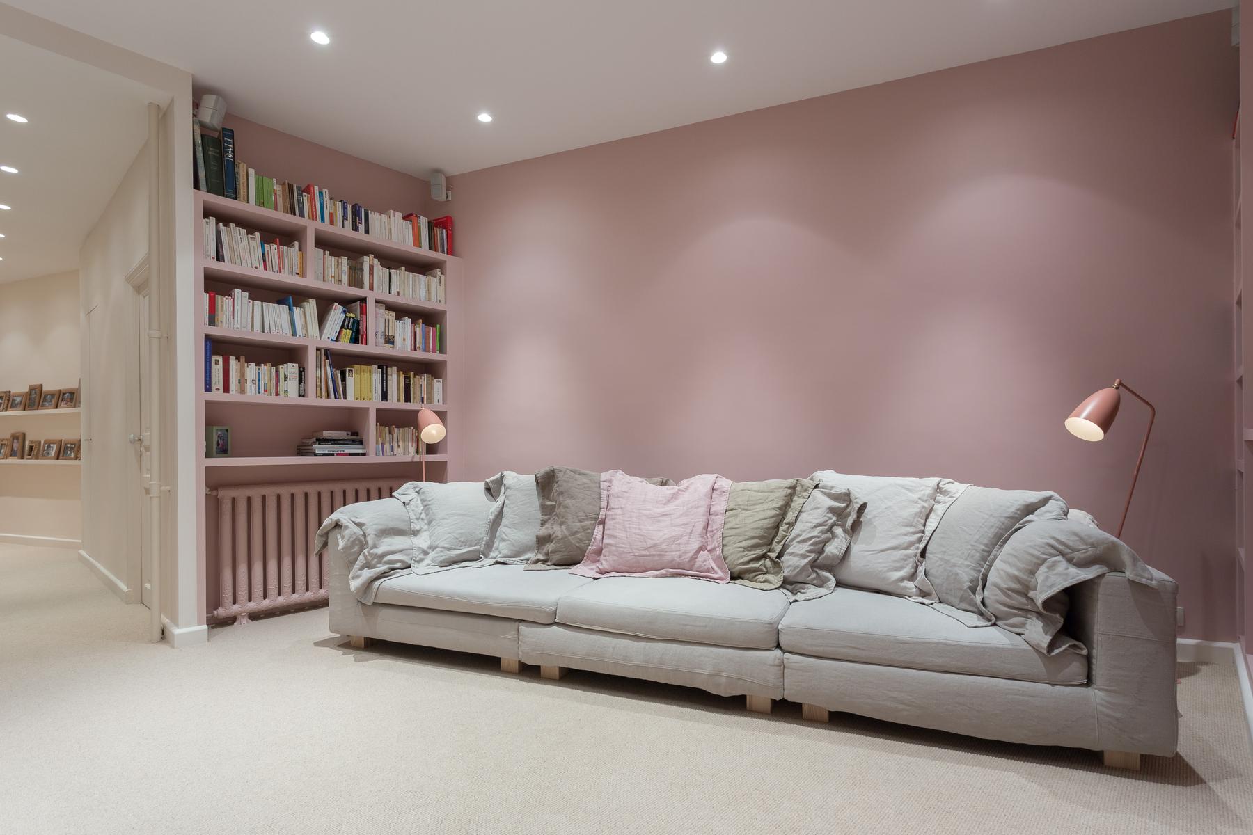 Au troisième étage, après une longue journée d’exploration des rues de Paris, c’est l’appartement où vous voudrez rentrer chez vous. Juste à côté de l’entrée, le parquet du salon est recouvert d’un épais tapis blanc et d’un piano à queue resplendissant à côté d’une paire de bibliothèques. De l’autre côté du hall se trouve la cuisine ouverte et la salle à manger, peinte en bleu poudre avec une collection Le Creuset assortie. Sous un chandelier en verre de Murano, la table à manger a dix places assises et a été fabriquée à Bali, à partir du tronc d’un seul arbre.