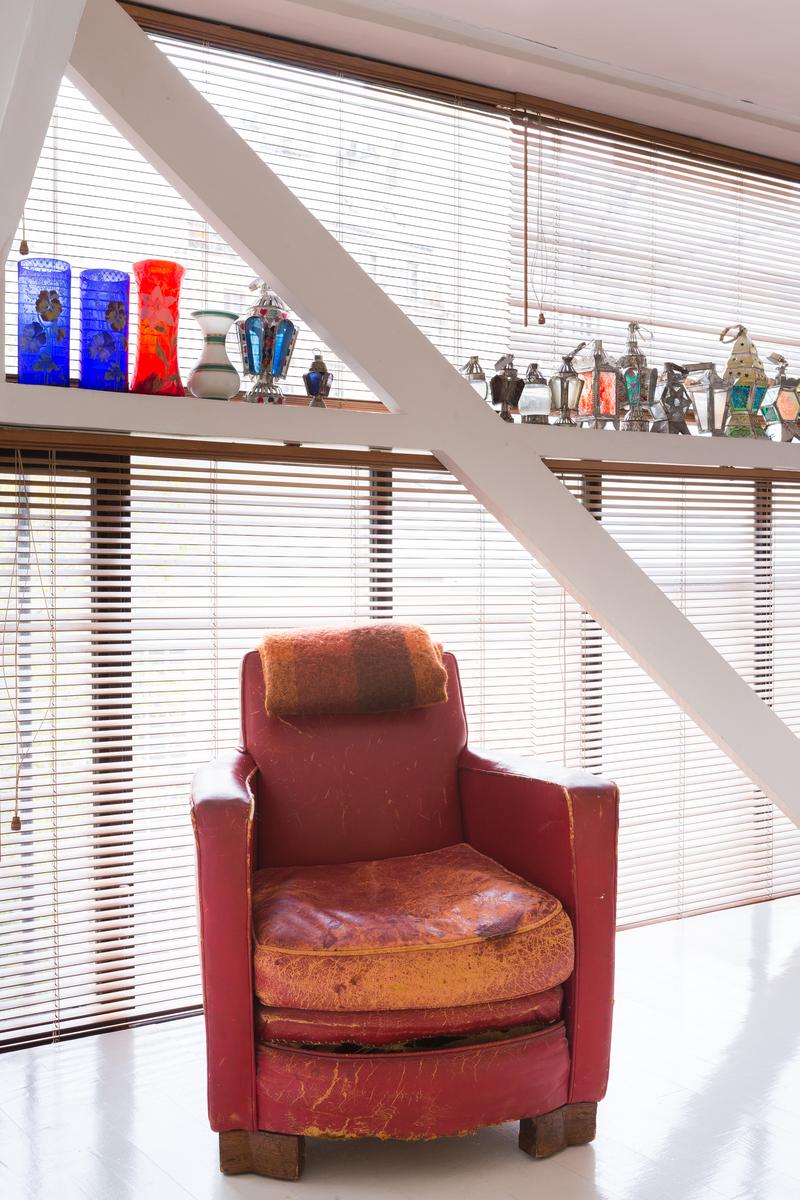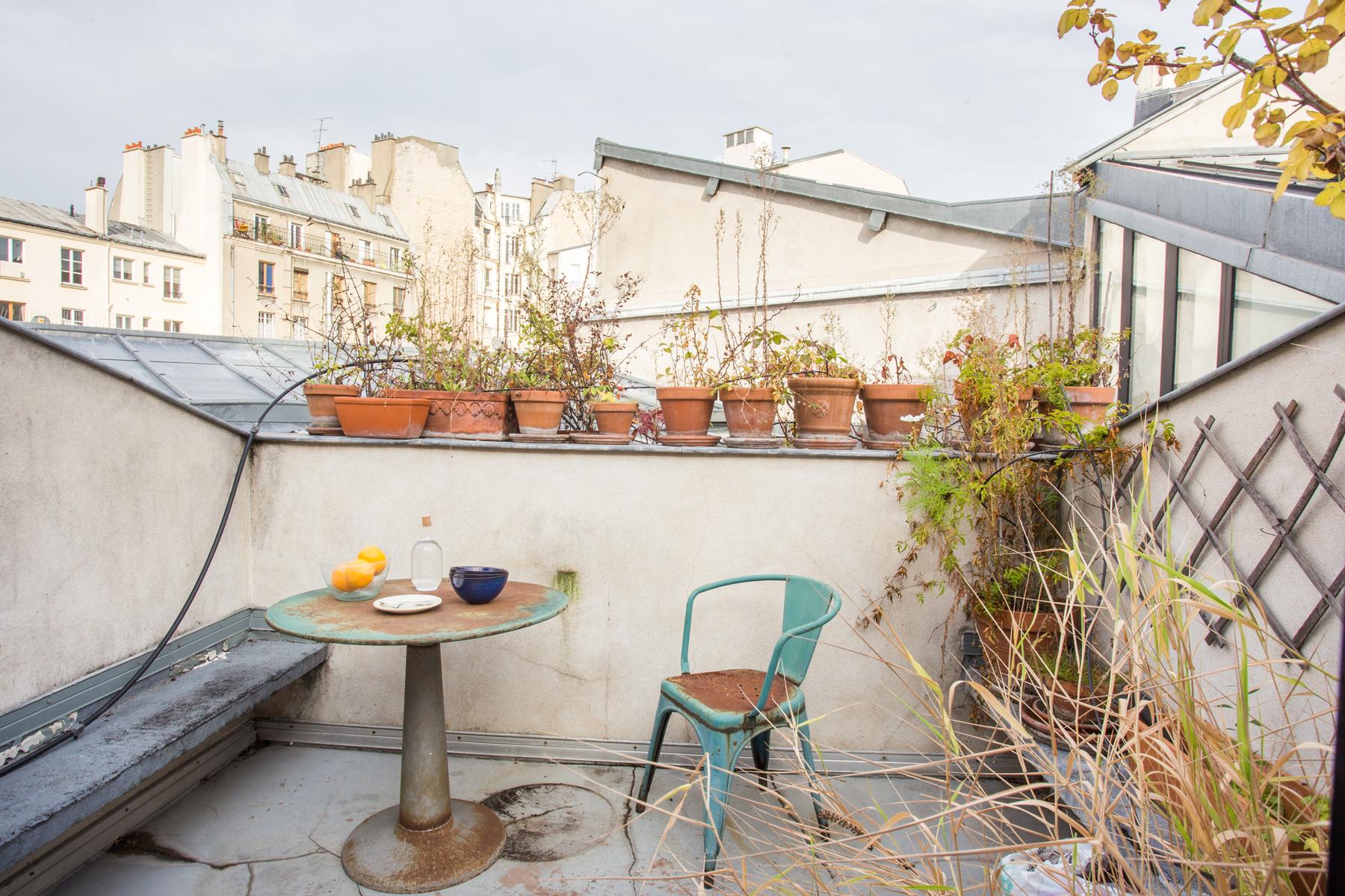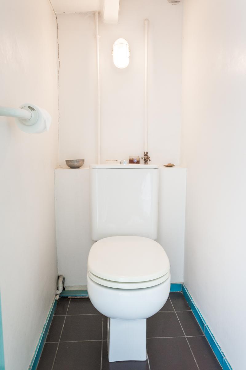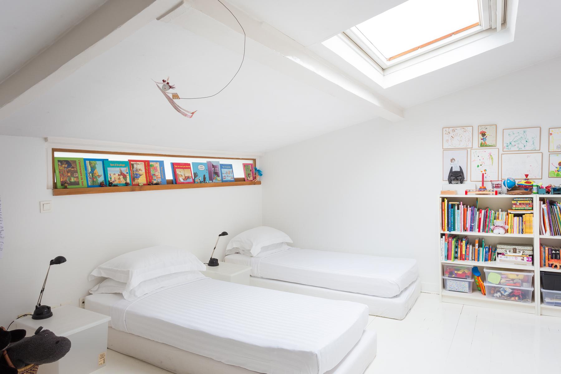 Au-dessus se trouve la chambre des maîtres blanchie à la chaux, qui a un lit king size et une salle de bain grise et turquoise. La troisième chambre à coucher est ici aussi, et il y a aussi une salle de bain et une petite terrasse. Enfin, en haut d’un autre escalier, il y a la deuxième chambre à coucher, où des fenêtres plus larges encadrent une vue sur les toits de la Bastille.