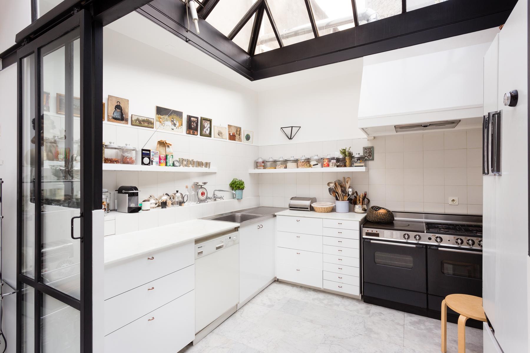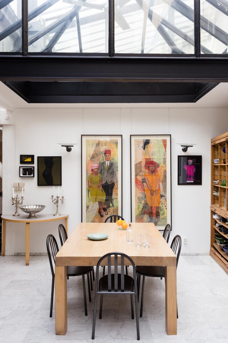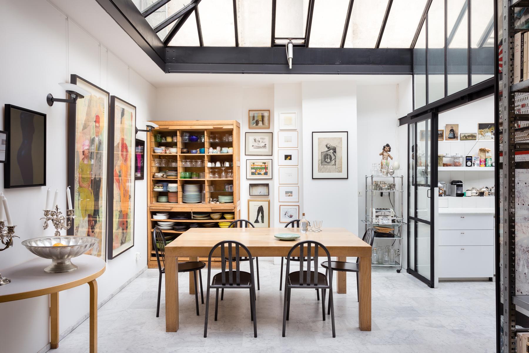 Autrefois entrepôt, cette maison à Bastille a été entièrement réimaginée par les hôtes (ils sont tous les deux artistiques, et l’un est un ancien photographe). En entrant dans la maison, vous trouverez un immense espace bureau-bureau-studio droit devant vous. Meublée de deux bureaux, d’un canapé turquoise et d’un piano, cette pièce frappante possède de longues fenêtres et des poutres de bois blondes. En passant par le salon attenant – où vous trouverez des meubles mal assortis et une collection d’œuvres d’art (grandes et petites). Le salon est relié à une cuisine contemporaine, un espace élégant avec une salle à manger vitrée.