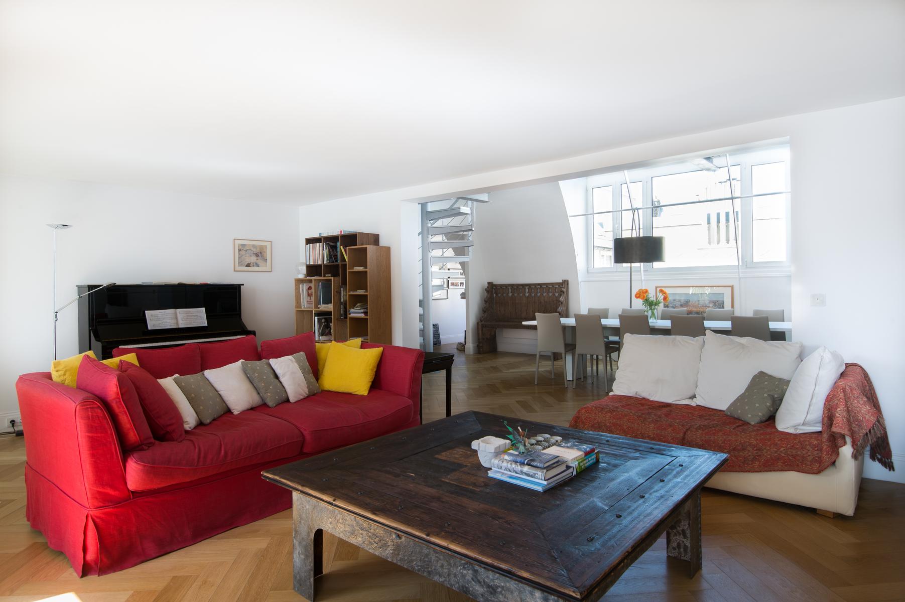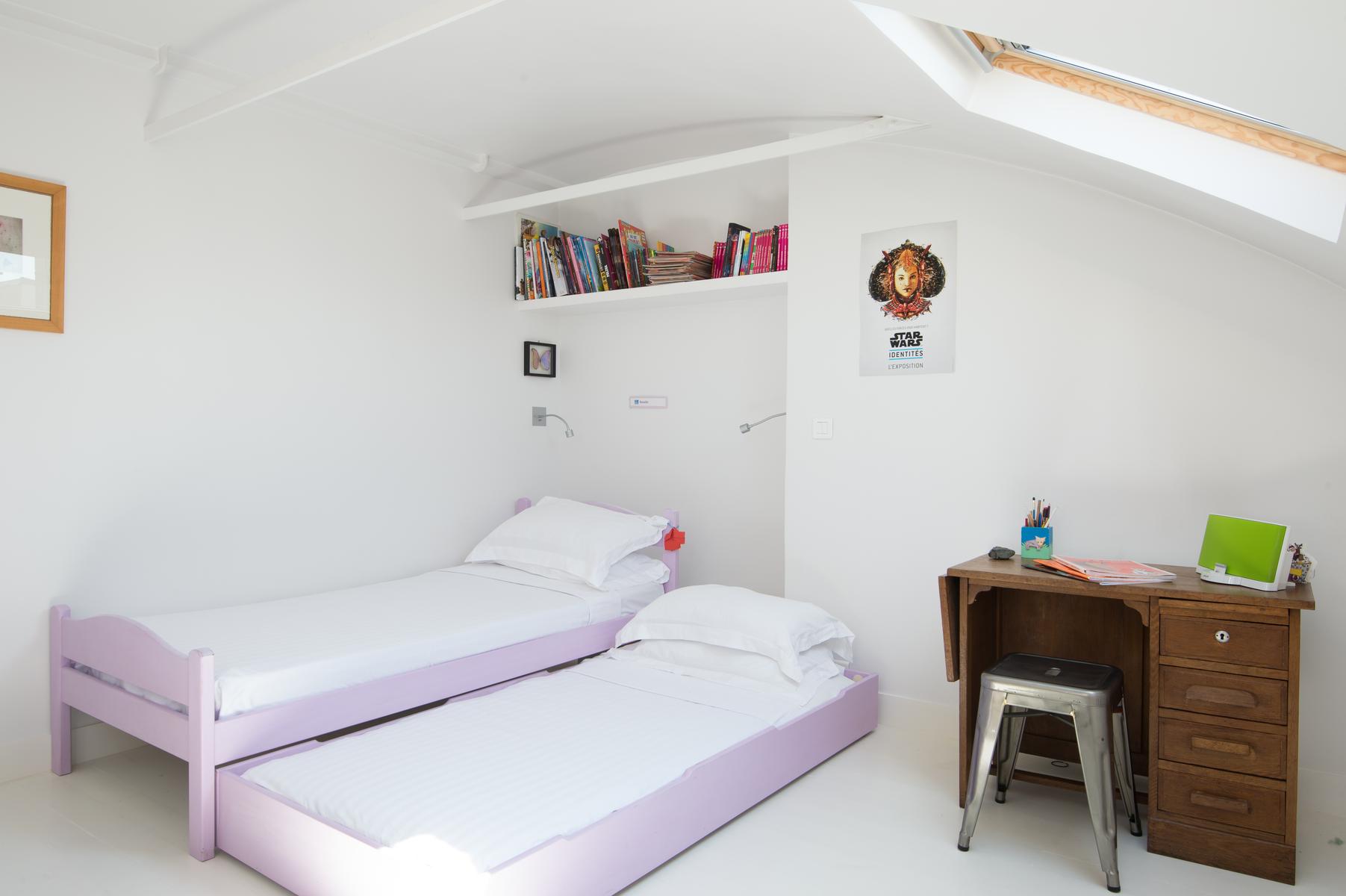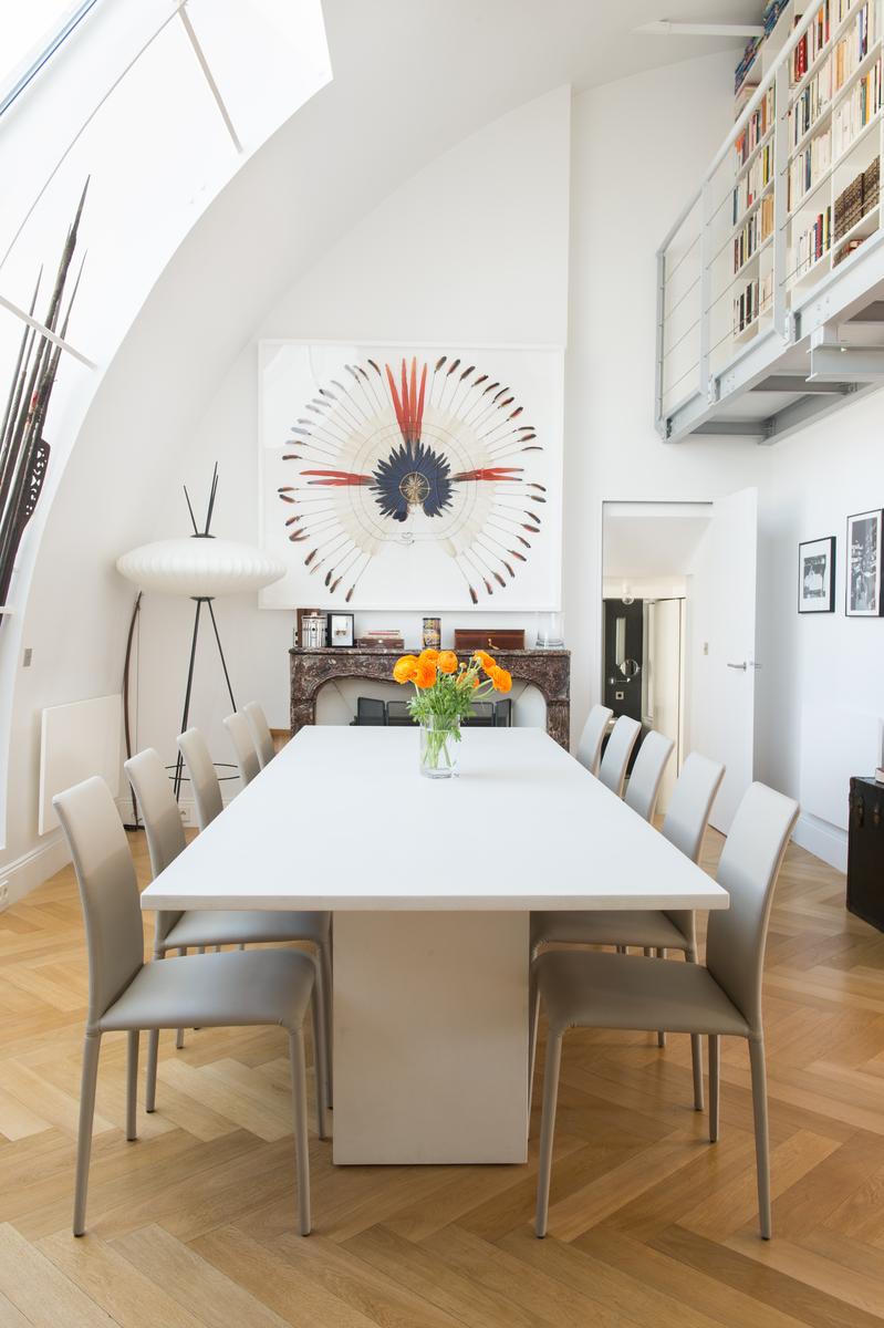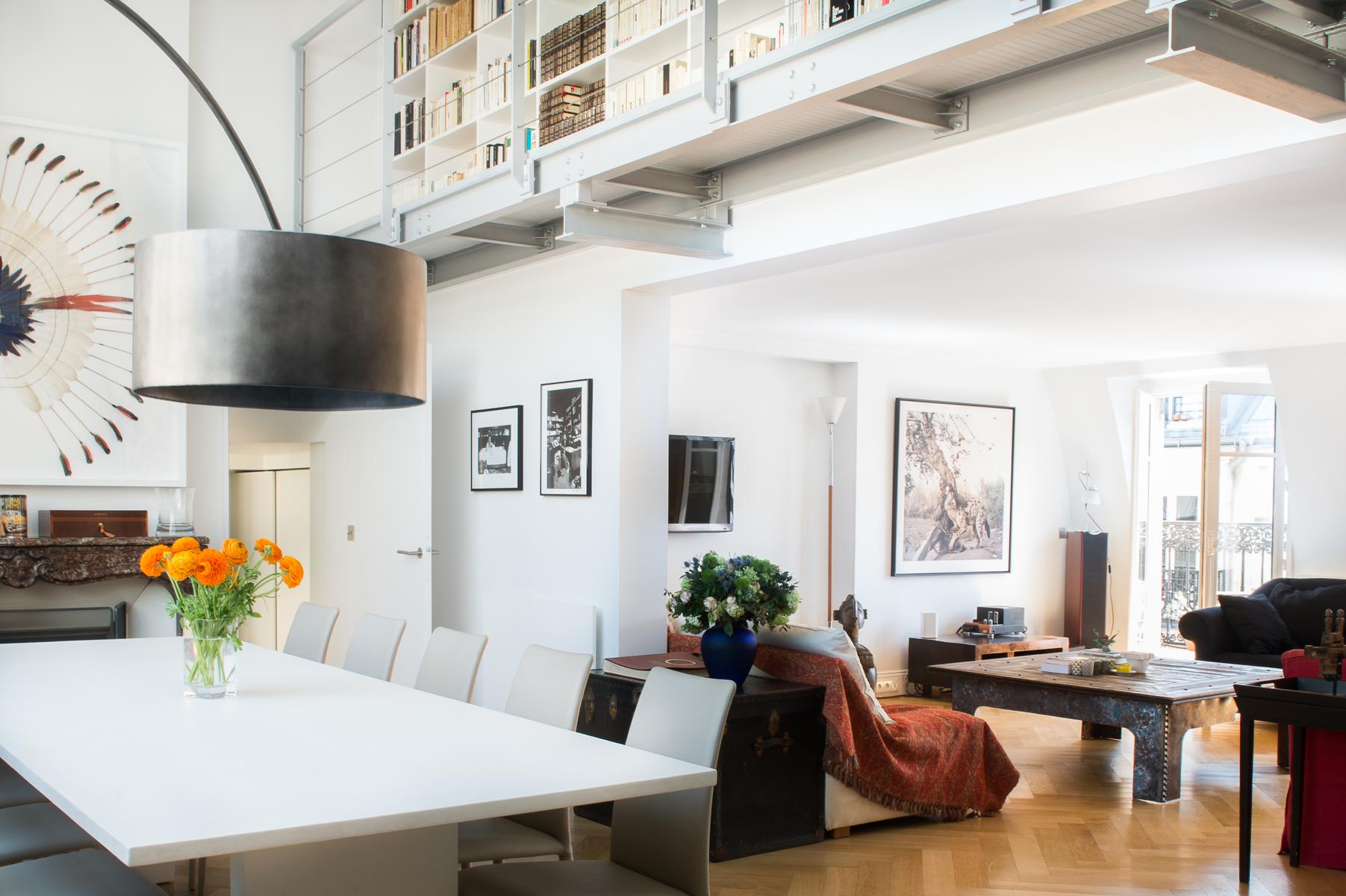 Récemment rénové par vos hôtes, cet ancien atelier de peintre est situé dans une jolie rue de Montmartre – South Pigalle. En entrant au cinquième étage, vous trouverez la cuisine colorée au bout du couloir sur votre gauche. Droit devant est la salle à manger – blanc lumineux, double hauteur et tout à fait frappant, avec une table à manger moderne en contraste avec les pièces anciennes dans toute la pièce (l’élégant banc est du Rajasthan). La porte ouverte vous mène au salon confortable, où trois canapés mal assortis entourent une table en bois patiné.