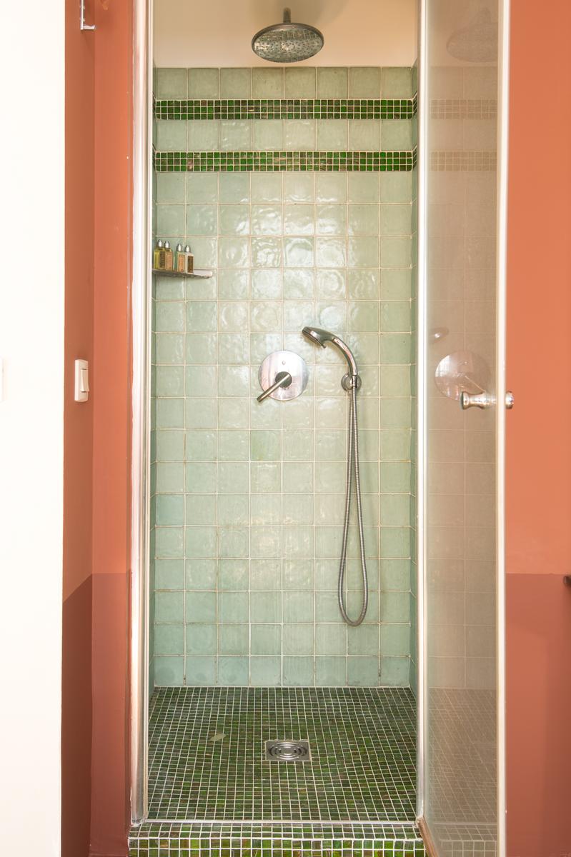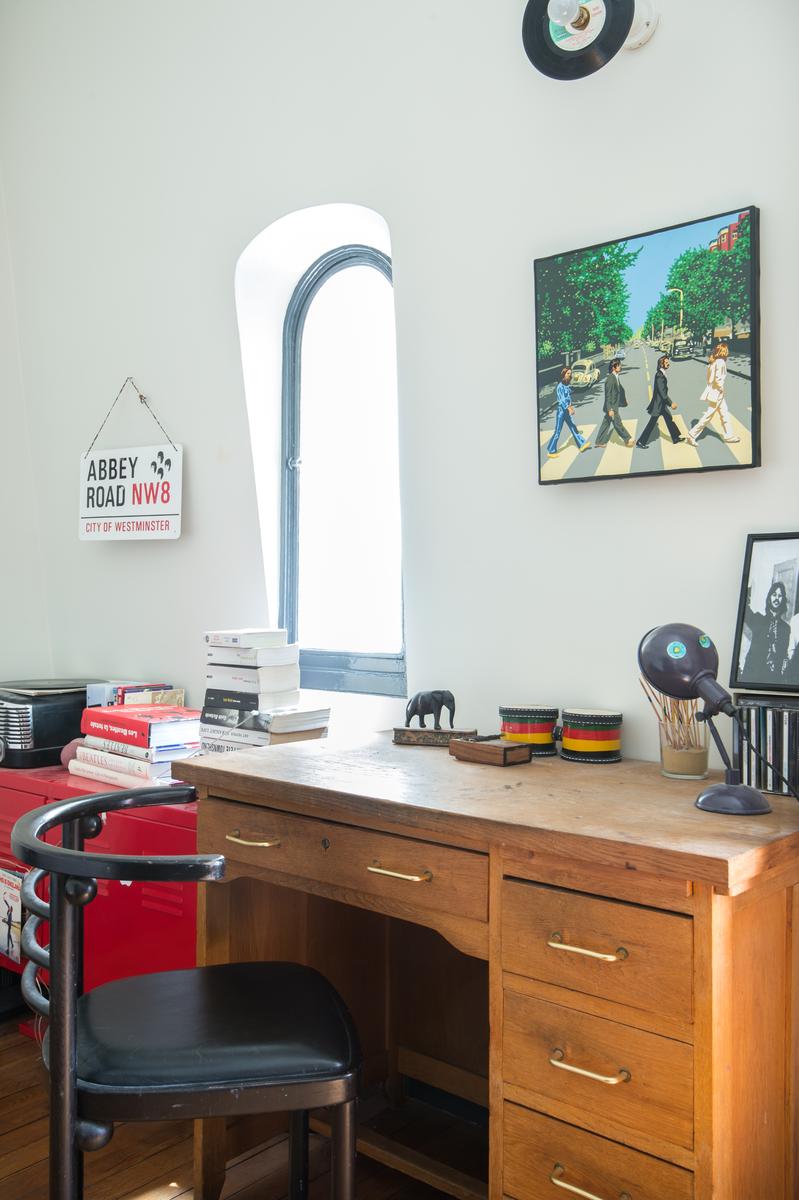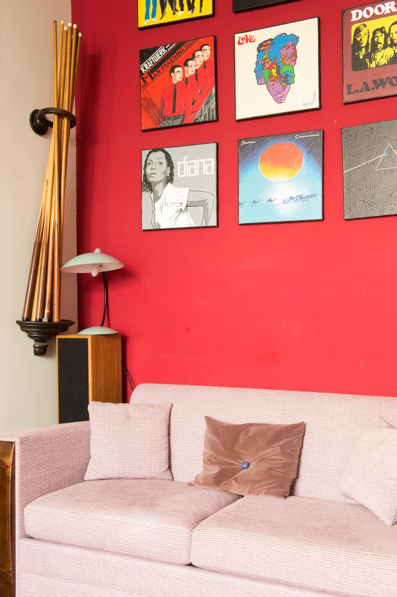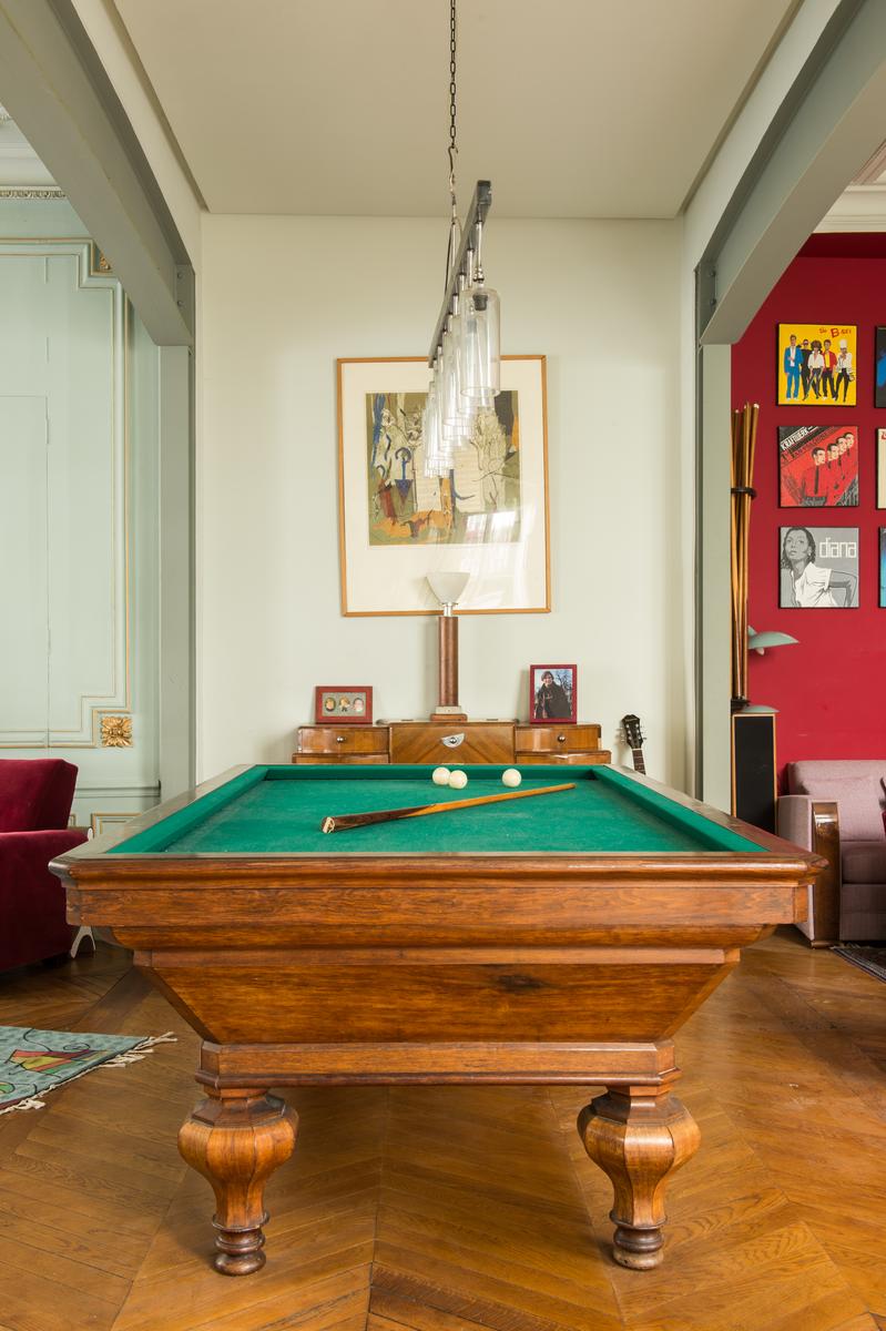 La façade ornée de cette maison fait allusion à son intérieur flamboyant. Une fois à l’intérieur, vous arriverez d’abord au rez-de-chaussée inférieur, où il y a un deuxième salon plutôt suave sur la gauche. Tout droit devant, il y a une salle de bains, une cuisine et une salle à manger accueillantes, sa table ultra-contemporaine placée sous un élégant plafond carrelé de verre. Ensuite, c’est le salon principal, qui est en partie lambrissé en vert et or, et qui possède plusieurs œuvres d’art originales, une table de billard et un piano à queue. Il y a aussi un bureau sophistiqué, ainsi qu’une terrasse éclairée par des lampadaires d’époque (découverts par les hôtes d’un marché aux antiquités).