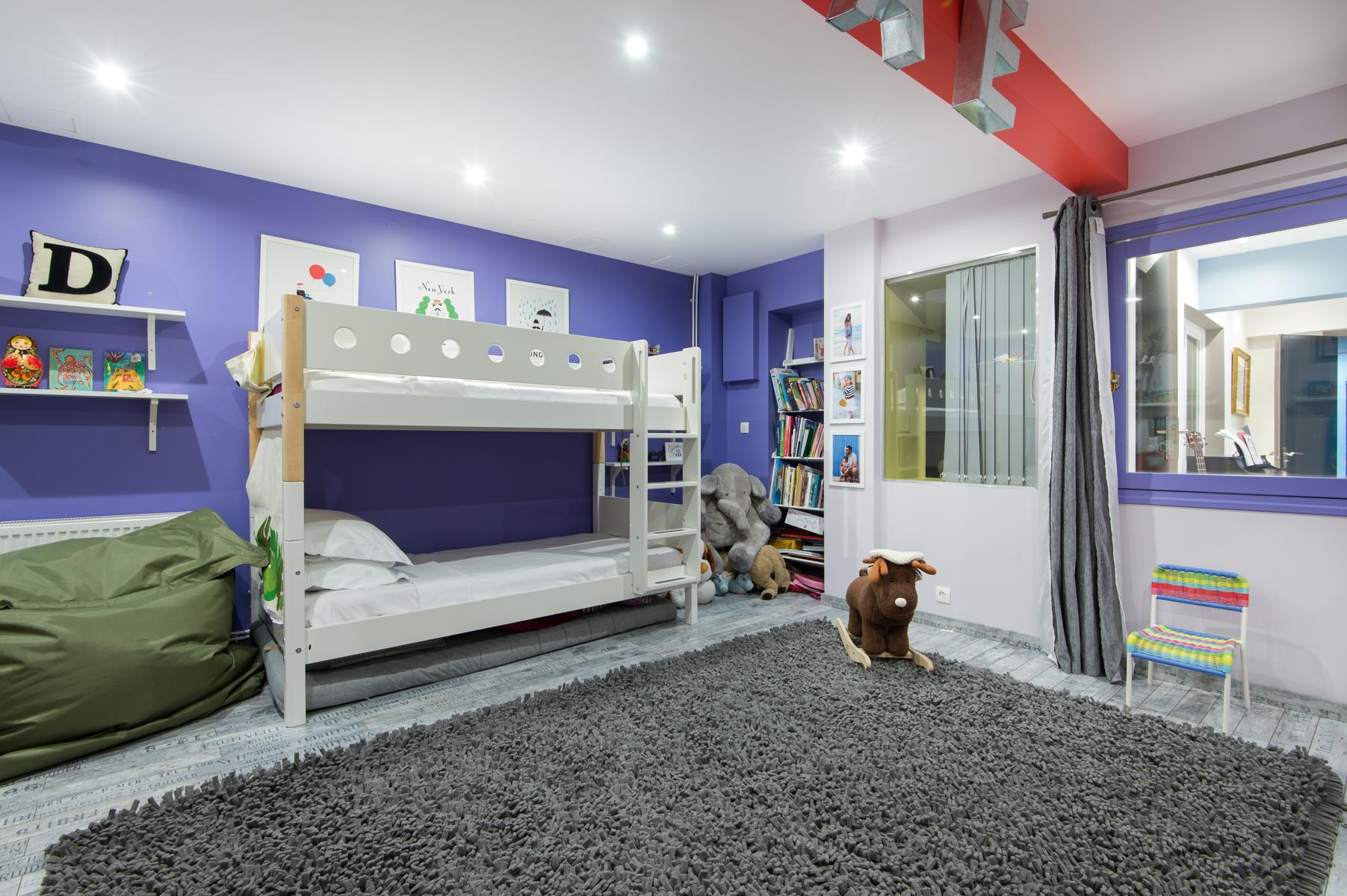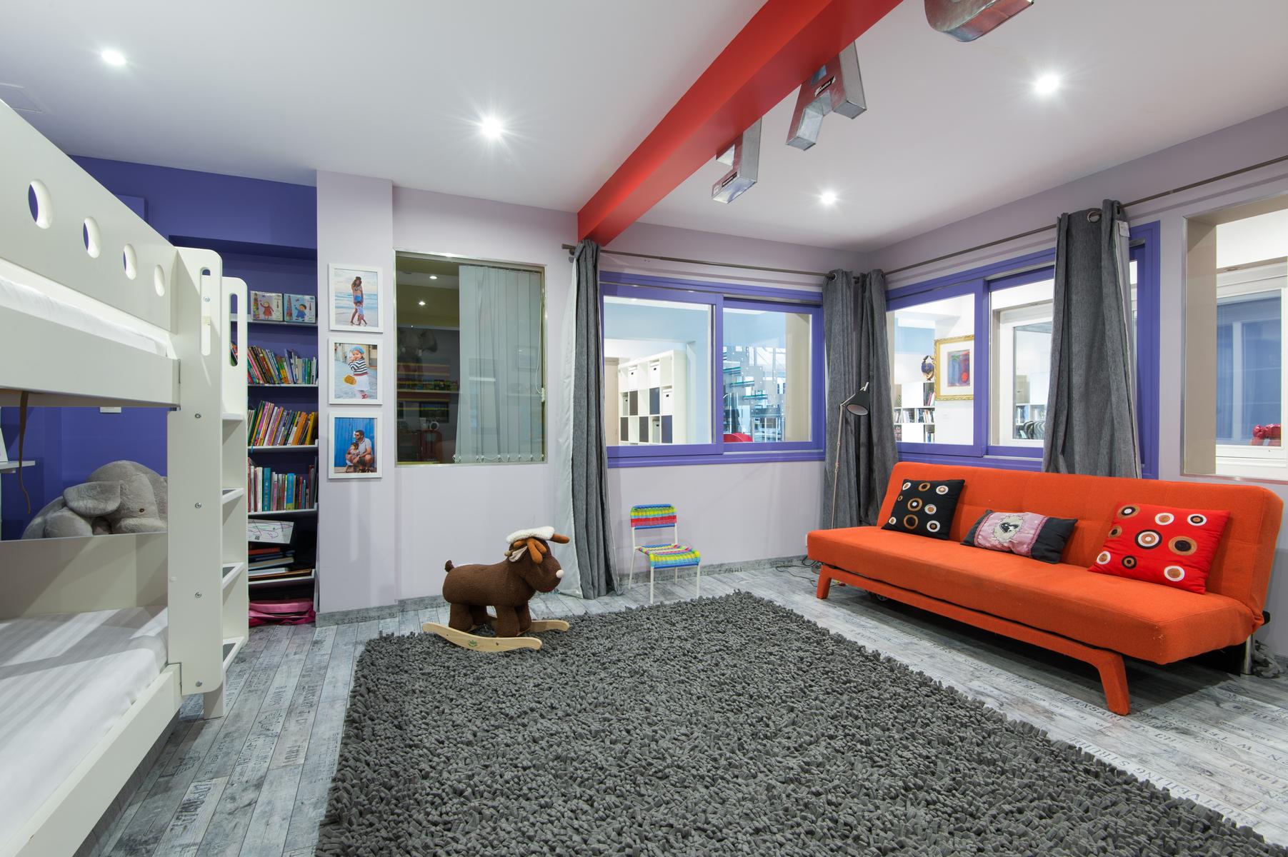 Juste à côté, vous trouverez la deuxième et la troisième chambre à coucher, une salle de jeux avec une salle de douche et une salle de bains en rubis avec baignoire et douche. Puis c’est au premier étage pour la chambre des maîtres – super tranchante, avec des planchers laqués, un grand lit écarlate et une somptueuse suite.