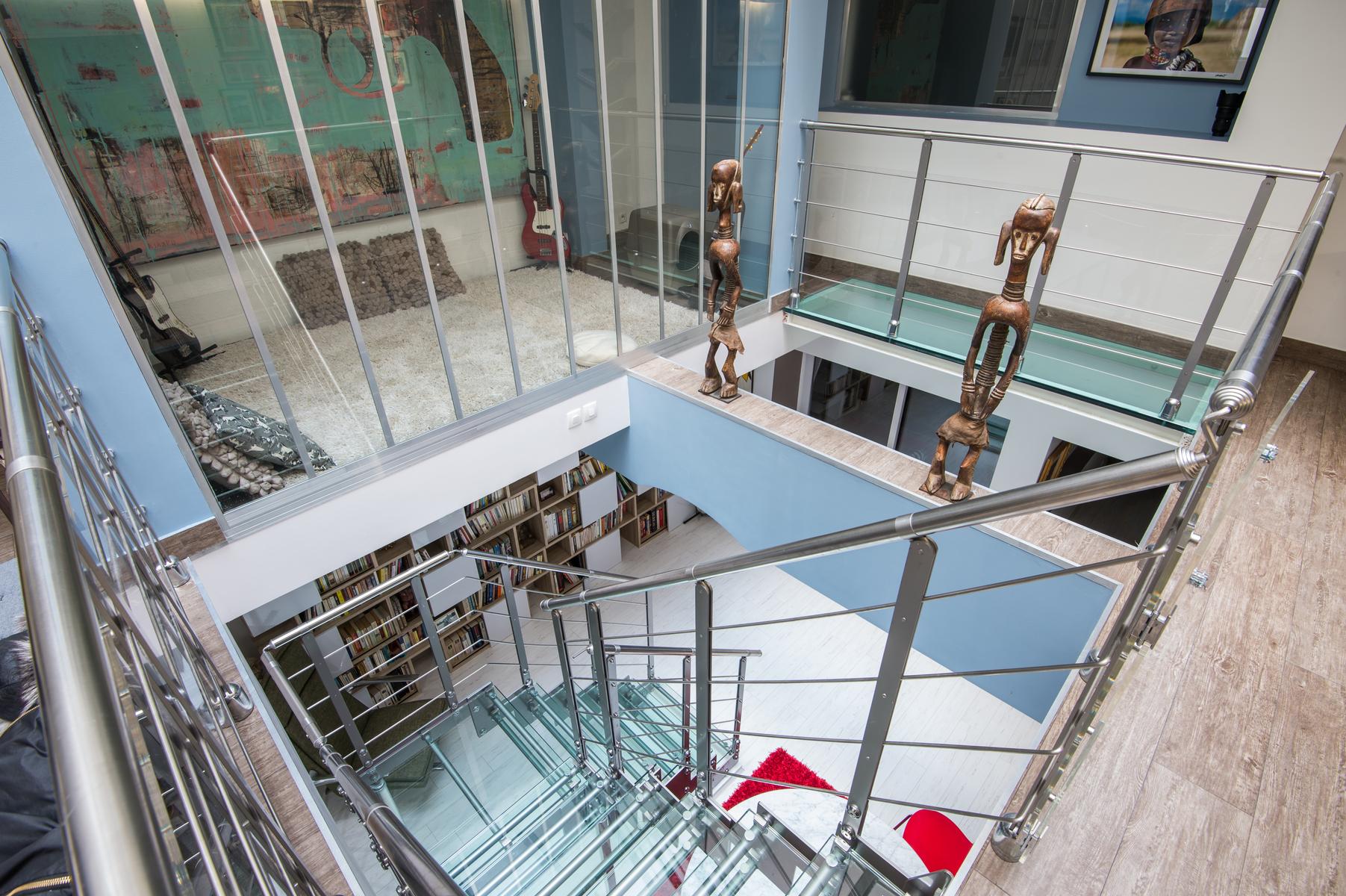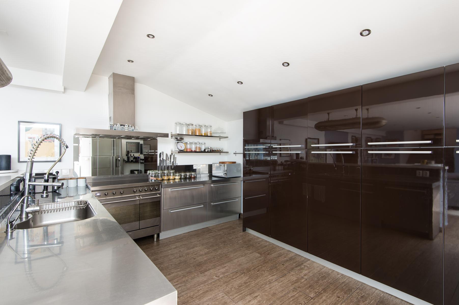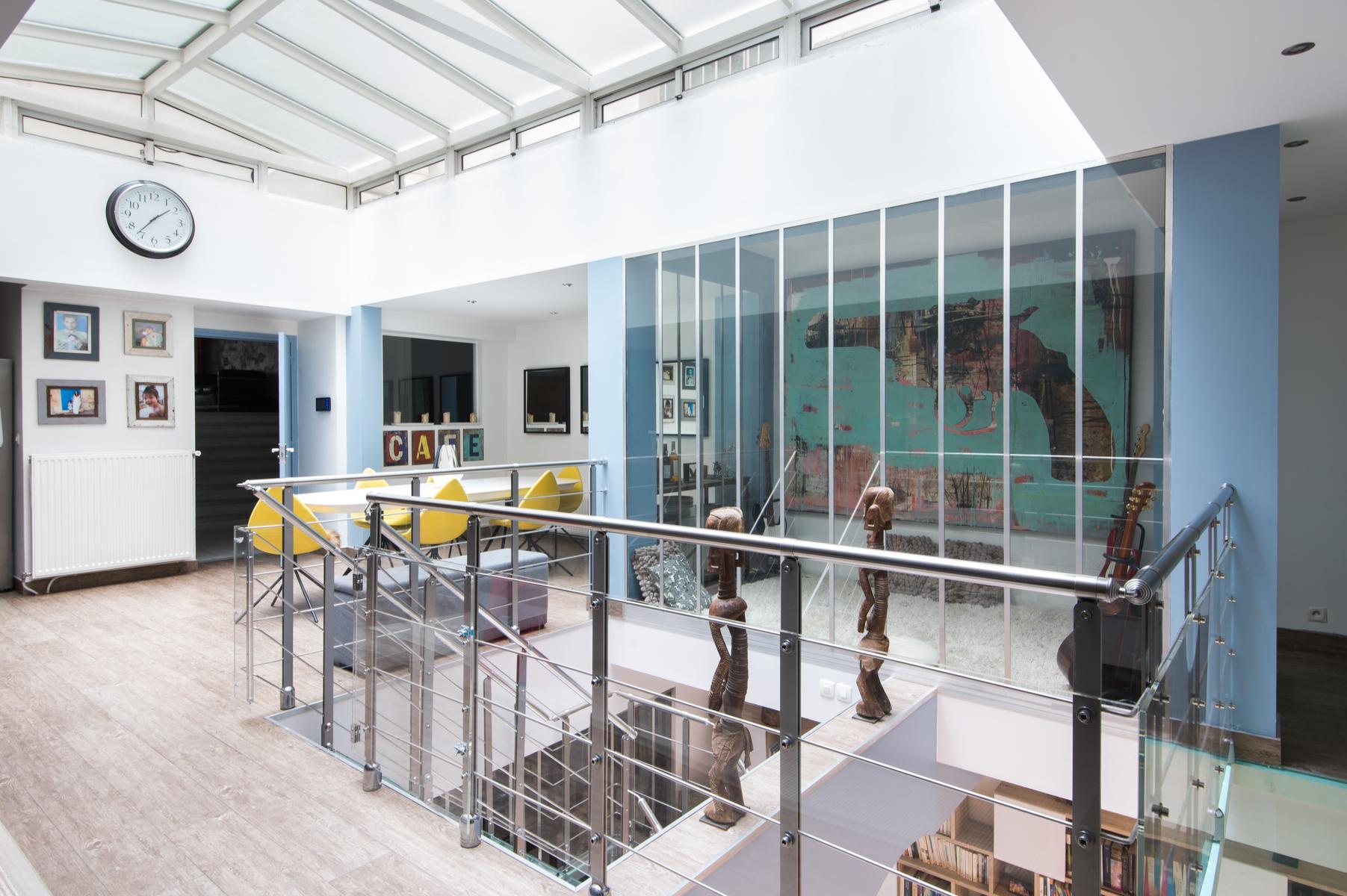 Montmartre – South Pigalle regorge d’endroits élégants, et cette maison de ville est certainement l’une d’entre elles. Vous arriverez d’abord à l’espace de vie ouvert, éclairé par un puits de lumière géant. Tout droit devant, il y a une table à manger – avec des chaises jaune acide – et puis il y a un coin cuisine élégant à droite. Au-delà du bar du petit déjeuner, il y a un coin salon, où un long canapé d’angle fait face à une impressionnante télévision murale. En face, un escalier en verre et métal descend jusqu’au bureau du rez-de-chaussée, qui est plein de livres (dont beaucoup sur le cinéma) et de sculptures saisissantes.