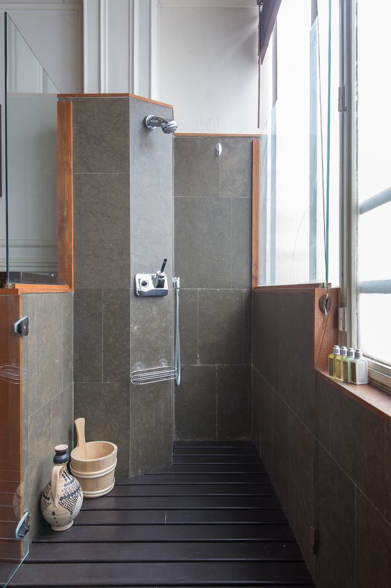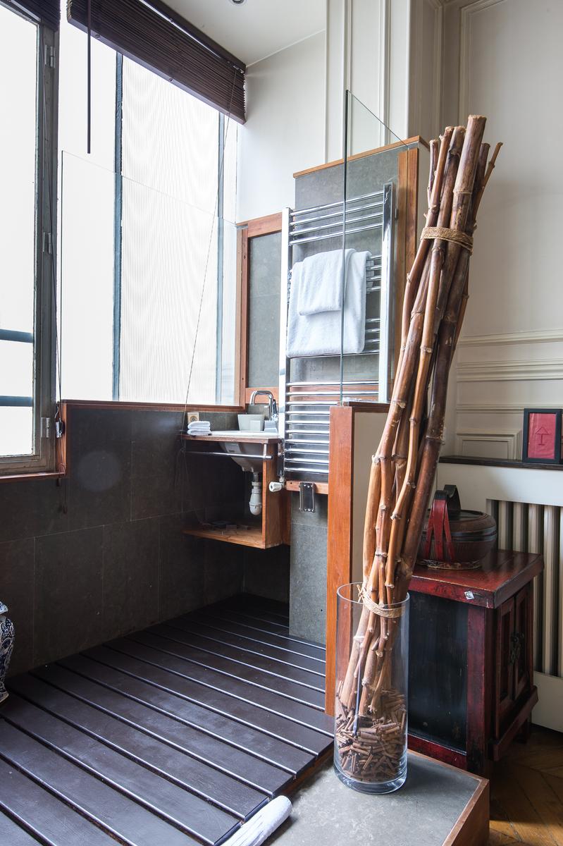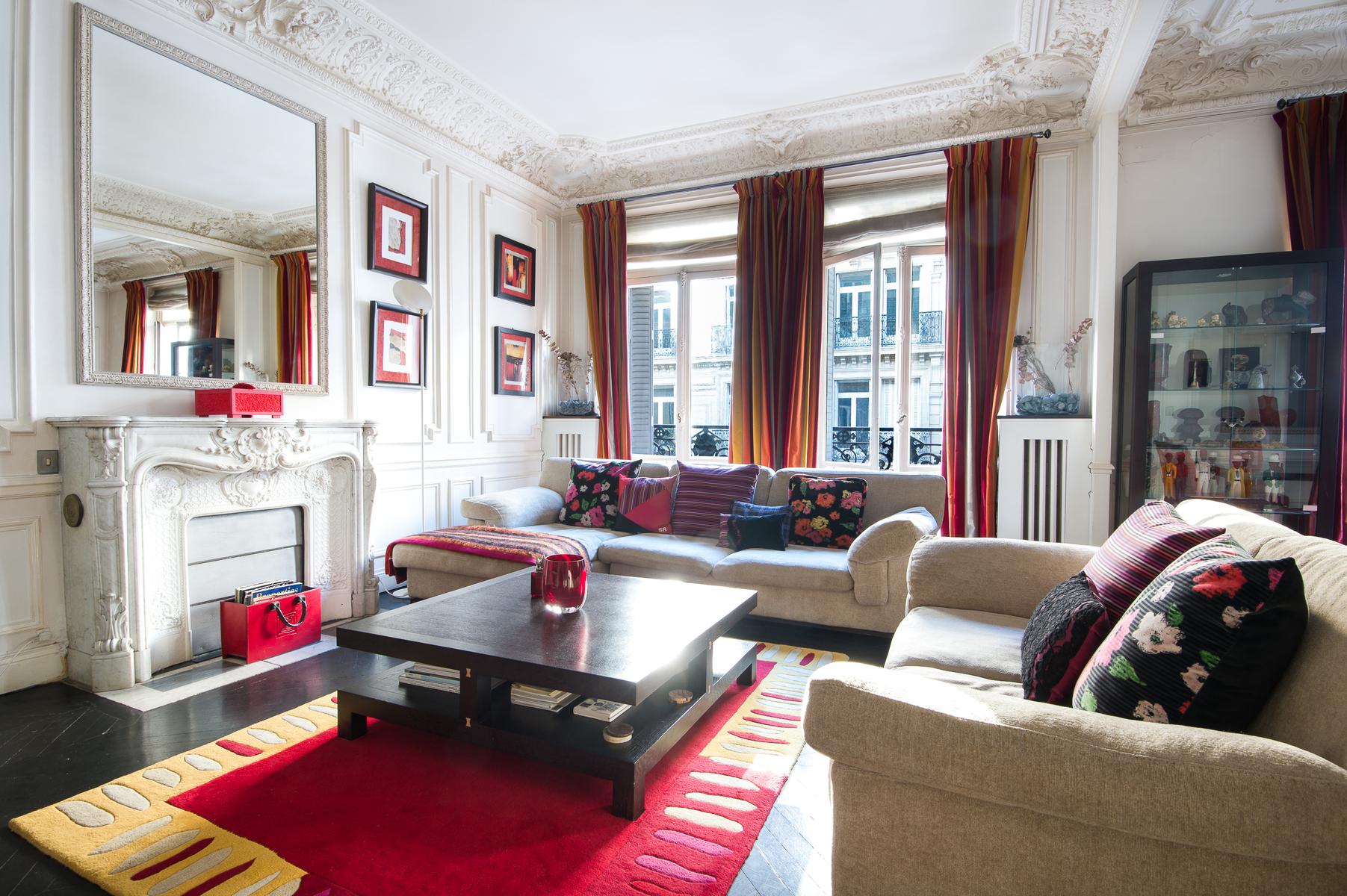 Entourée d’un paysage qui tourne la tête, cette maison dans l’Arc de Triomphe – Champs-Élysées est elle-même frappante. Tout d’abord le long du hall d’entrée se trouve le salon – un espace impressionnant avec un plafond orné et des parquets. En plus d’un coin salon avec deux canapés (tous deux avec des coussins mal assortis) et une table basse robuste, il y a une salle à manger. Sa table, ornée de chaises rouges, se dresse à côté d’une peinture colorée d’un taureau.
