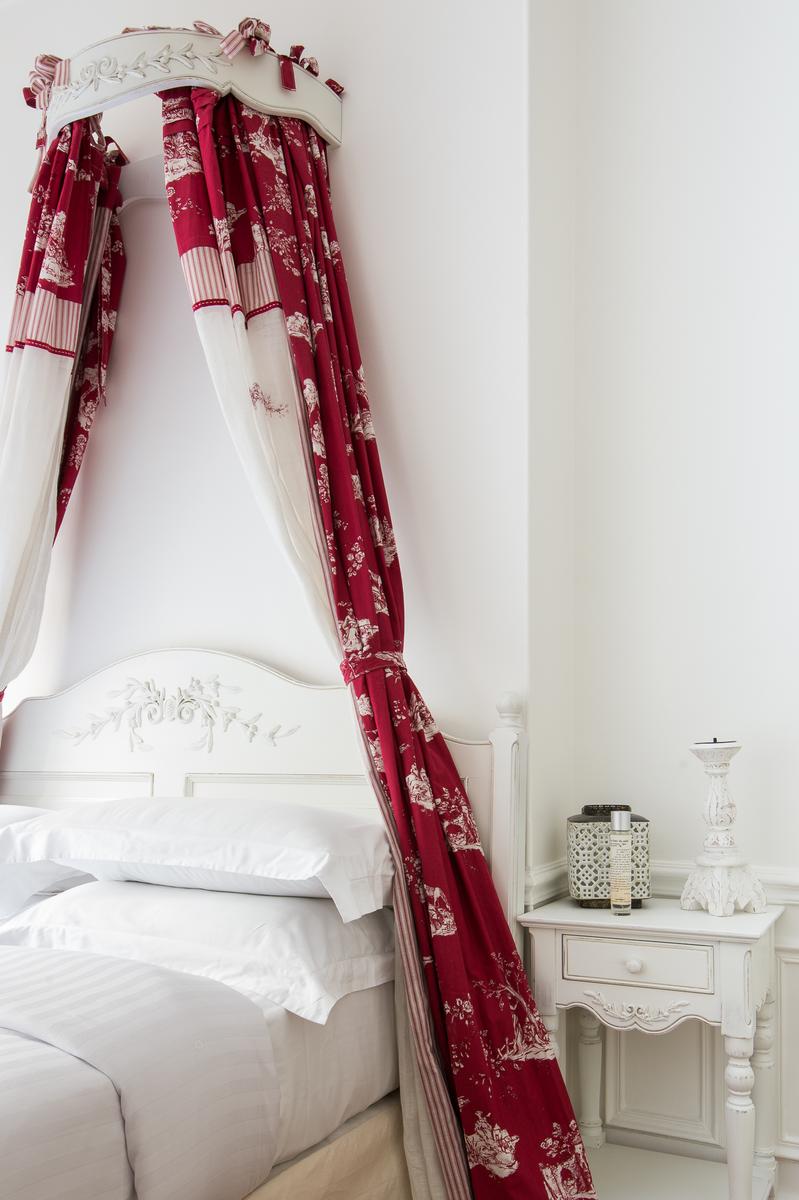 A côté du salon se trouve une salle de bains, qui mène à la deuxième chambre rouge et blanche. Au-delà, il y a une salle de toilette, puis en revenant vers l’entrée, vous arriverez à une cuisine avec des armoires rouges et un dosseret bleu. Et juste après, il y a la chambre principale. Cette salle est un lieu intrigant – plein de détails classiques, mais aussi d’œuvres d’art exotiques, d’armoires et de vases. Il dispose d’un lit queen et d’une salle de bain avec douche.