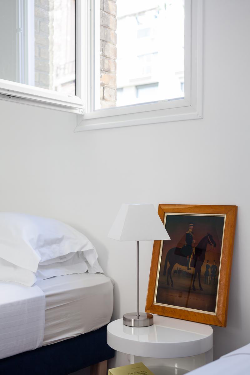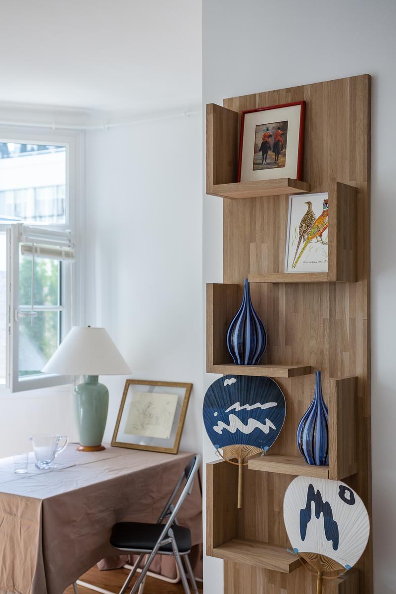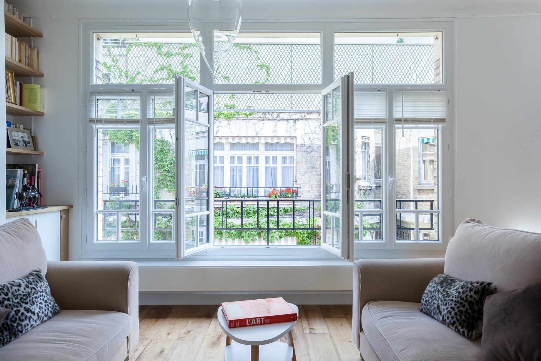 La rue Michel-Ange II est un petit coin particulièrement calme d’Auteuil – Roland-Garros. En traversant deux cours fleuries et en montant jusqu’au troisième étage, vous arriverez à la porte d’entrée qui mène à l’espace de vie ouvert. Sur la gauche se trouve la cuisine intelligente, avec son bar en bois pour quatre personnes. Et tout droit devant se trouve le coin salon. Les murs d’un blanc pur et les planchers de bois blond donnent à ce lieu une impression de sérénité, mais ses deux canapés crème classiques (coiffés de coussins imprimés) et la collection de livres et de vases délicats lui confèrent une atmosphère chaleureuse