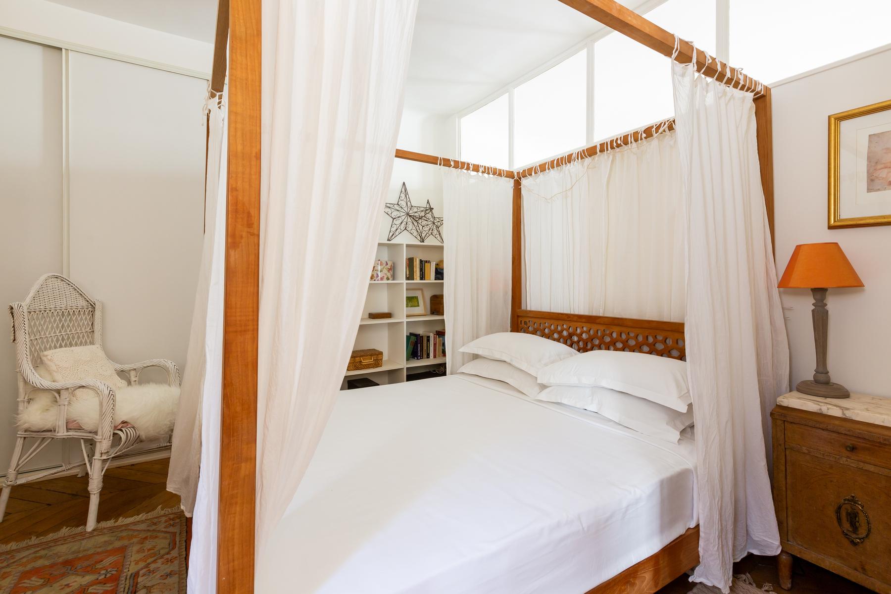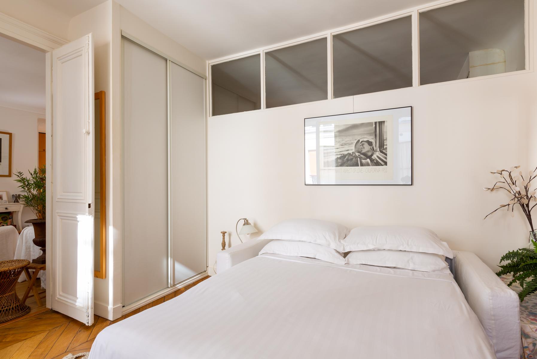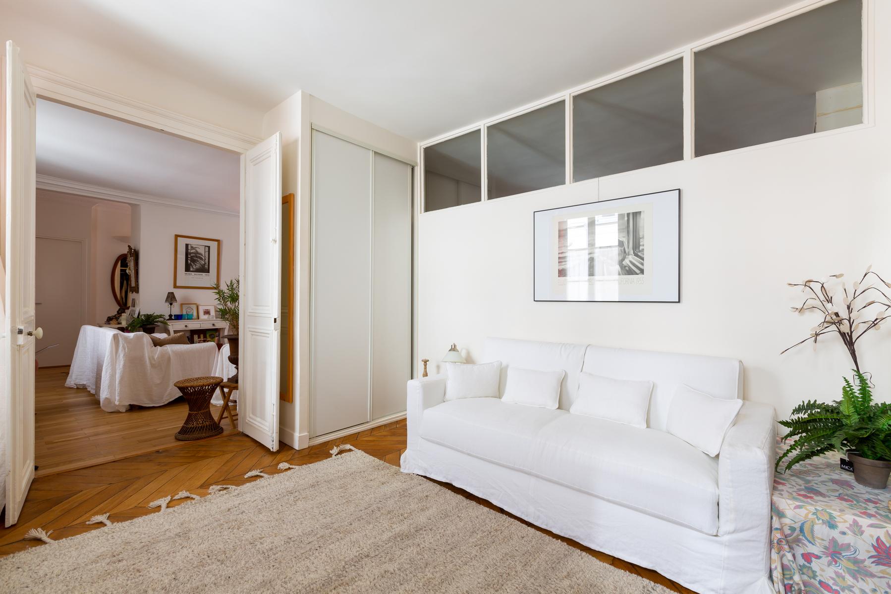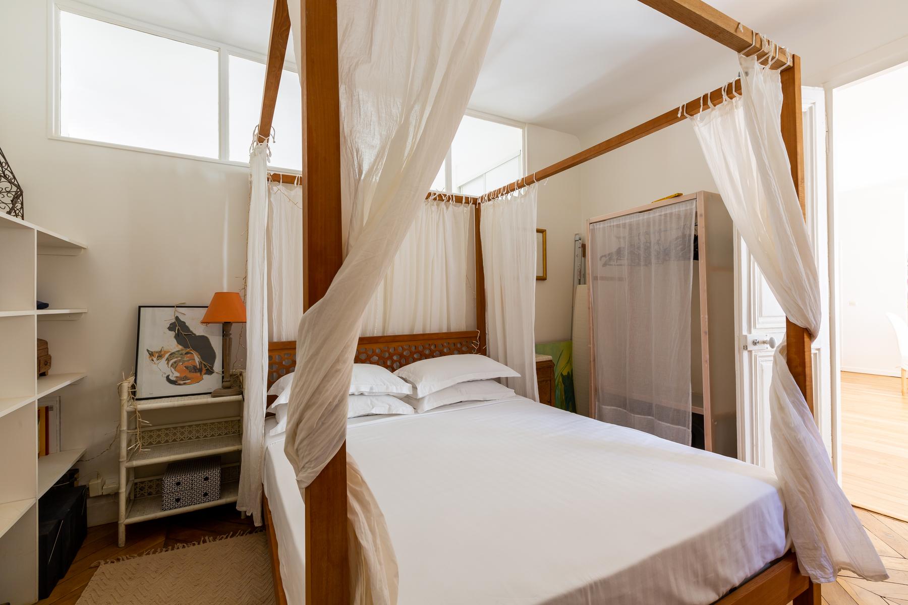 La rue Montmartre II est une maison de deux chambres à coucher, une salle de bain au Louvre – Opéra. Peint en blanc et plancher de bois, avec un mobilier sobre, l’espace de vie ouvert de cette maison se distingue par ses nombreux accessoires – vous remarquerez tout, des impressions monochromes et coussins colorés, aux miroirs antiques impressionnants. La chambre principale est faite de la même façon, avec un lit à baldaquin à baldaquin pour une pièce maîtresse. La région est centrale et animée, et vous trouverez de nombreux magasins, bars et restaurants à proximité. Vous êtes également à proximité de certaines des galeries et musées les plus appréciés de la ville, et ce n’est qu’à deux minutes à pied de la station de métro la plus proche, Les Halles.