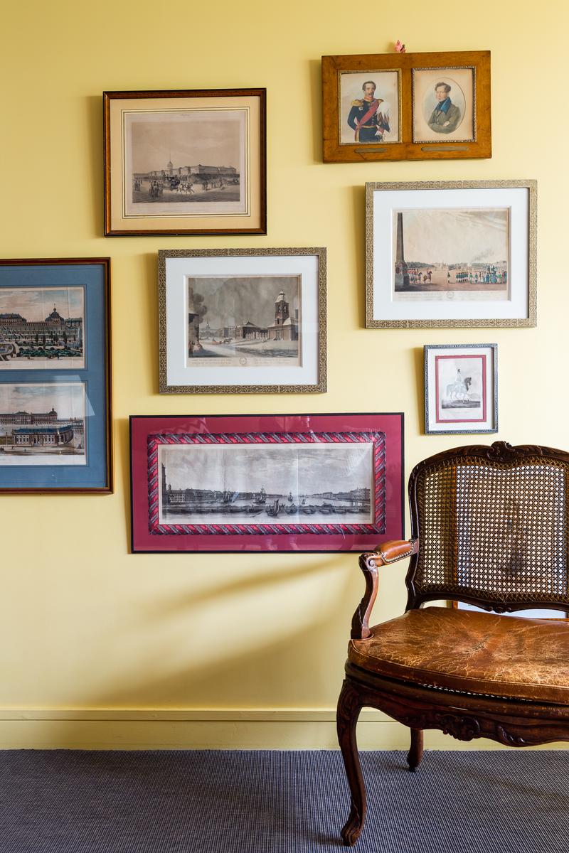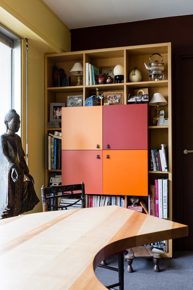 La rue Notre Dame des Champs II est animée, tout comme le quartier latin lui-même. La porte d’entrée s’ouvre directement sur la cuisine peinte en jaune, avec des armoires en bois et des éclaboussures roses. Elle mène au salon – étonnamment décoré en jaune et en terre d’ombre. Cette chambre dispose d’un canapé, de deux fauteuils anciens et d’une table de salle à manger incurvée inhabituelle, ainsi que d’une collection exotique d’ornements. Au fond, de larges fenêtres s’ouvrent sur le balcon végétal.