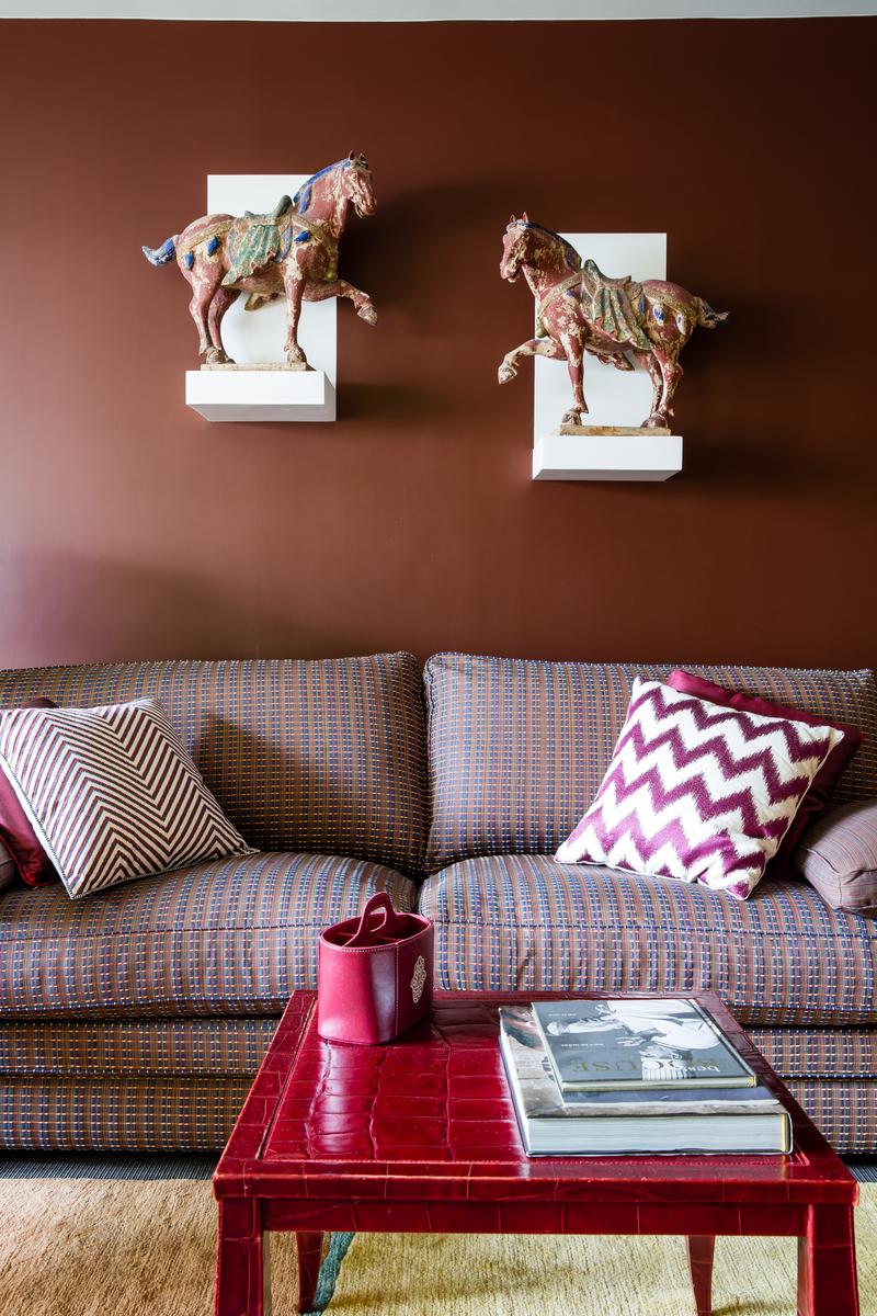 A droite de la cuisine, vous trouverez une salle de toilette et la salle de bain – contemporaine, avec quelques pops de couleur. Ensuite, les deux chambres à coucher ne sont plus dans le salon. A gauche se trouve la deuxième chambre à coucher (avec salle de bains), et à droite, la chambre principale colorée. D’autres ornements accrocheurs entourent son lit king size à motifs d’éléphants, au-delà duquel de longues fenêtres mènent au balcon.